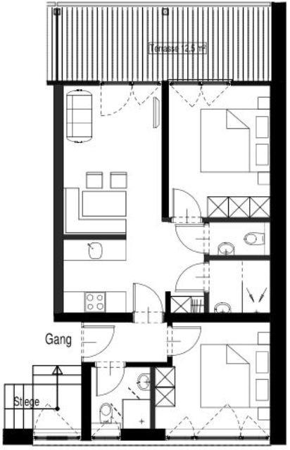 Das helle und modern eingerichtete Appartement mit 60 m² besteht aus 2 Schlafzimmern mit Boxspringbetten, einem Wohnraum mit Couch, einem Duschbad mit WC, einer Dusche und separatem WC, einer voll ausgestattete Küche und einer gemütlichen Essecke. Weiters verfügt das Appartement über einen möblierten südseitigen Balkon!