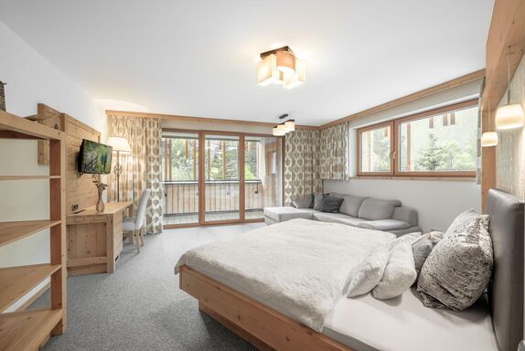 ca. 45 m² Suite Deluxe Feeling | 1 Wohn-Schafraum (Masterbedroom) mit großen Boxspring-Bett sowie 1 leicht separates Kinderzimmer mit Stockbett | 1 Badezimmer mit Wellnessdusche & Wanne, WC | Sitzlandschaft und Schreibtisch | Loggia-Balkon mit herrlichem Postkartenblick auf das atemberaubend Bergpanorama | Haartrockner & Kosmetikspiegel | Handtücher & Bademäntel für Erw. für unser Alpen Spa | TV in allen Wohn- und Schlafbereichen, WIFI |