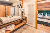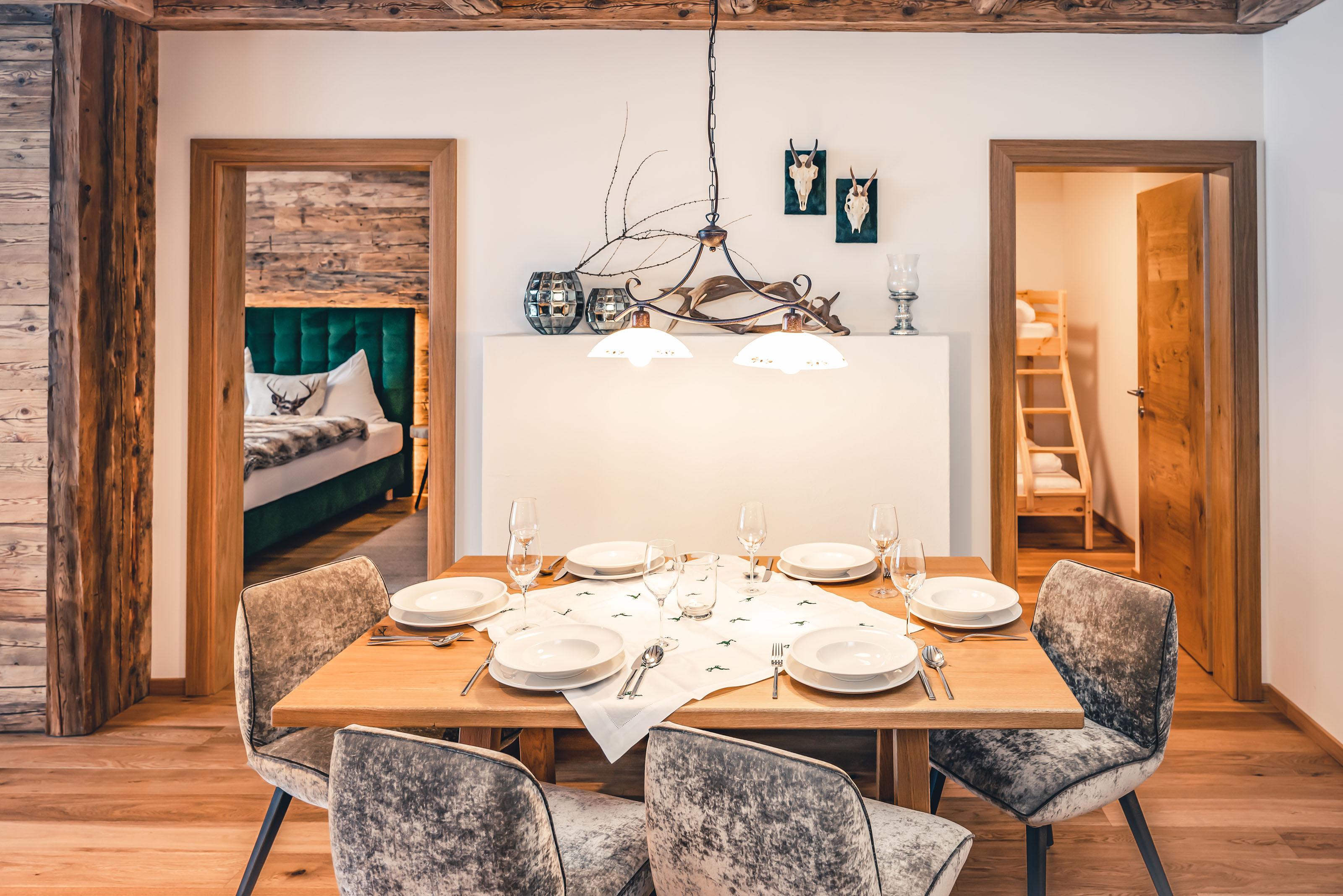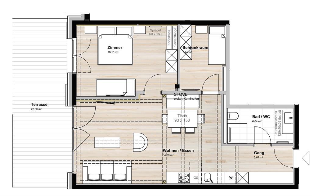 1 großes Elternschlafzimmer, 1 kleines Kinderzimmer mit Stockbett, 1 großer Wohn-Essbereich mit Ofen bei der Essbank, 1 großzügiges Badezimmer mit Walk in Dusche und Doppelwaschbecken.
