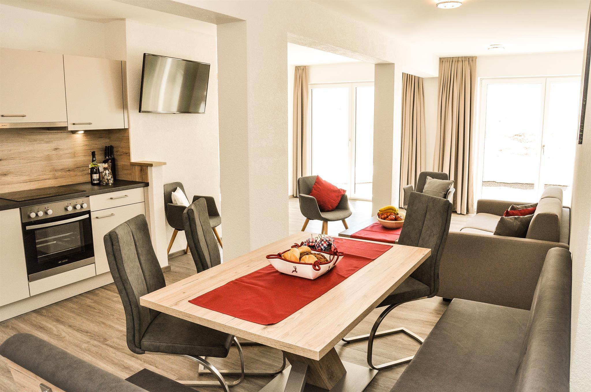 • moderne Wohnküche mit Esstisch (Kühlschrank, Kochfeld, Backofen, Spülmaschine, Wasserkocher, Eierkocher, Toaster)