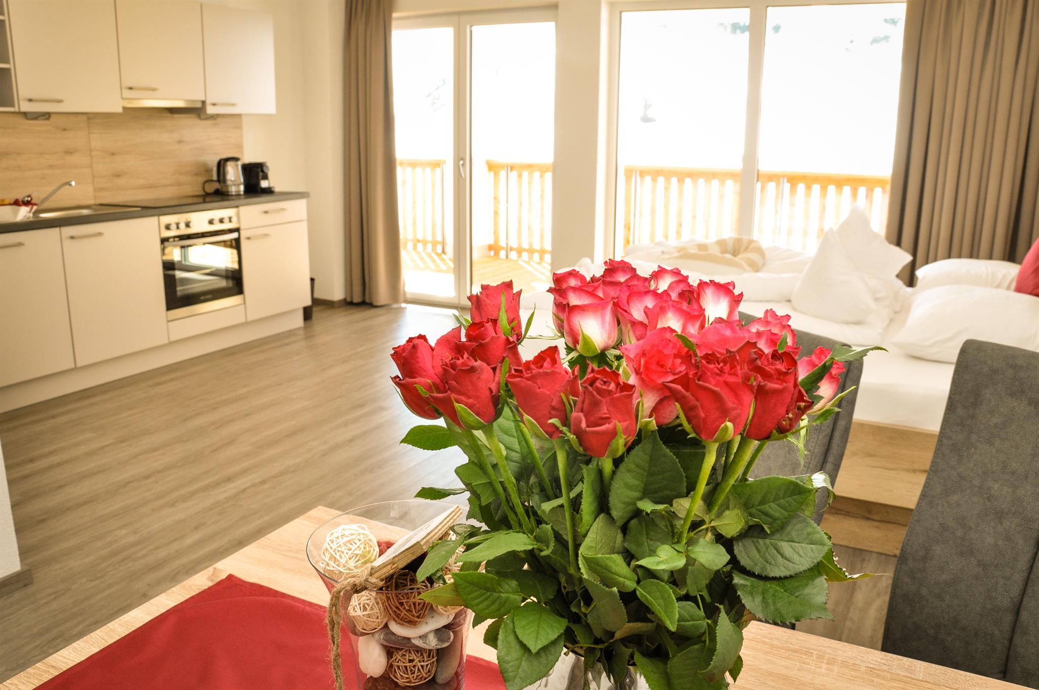 Entspannen Sie sich in unserem Panorama Wellnessbereich. Finnische Sauna und ein herrlicher Ausblick aus der verglasten Sauna in die Bergwelt. Abkühlung ermöglicht der direkte Ausgang auf die Sonnenterrasse oder unsere Erlebnisduschen.