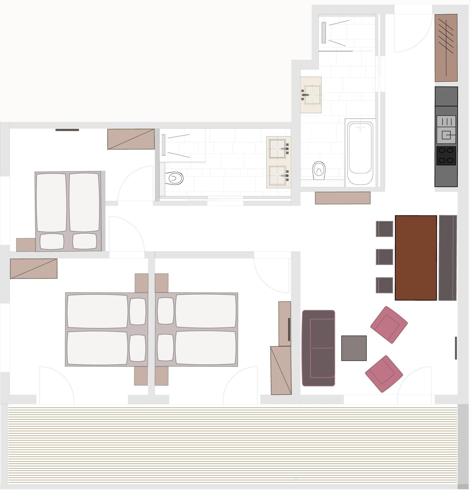 Das sehr großzügige Appartement Zilli ist 90 m2 groß und verfügt über 3 Schlafzimmer (2 Doppelzimmer und ein Schlafzimmer mit Queensizebett für 2 Personen). Ein Badezimmer ist ausgestattet mit Dusche und WC, das zweite Badezimmer verfügt über Dusche und Badewanne, Doppelwaschbecken und WC. Der großzügige Wohnraum ist ausgestattet mit einer Wohnecke mit Sofa, gemütlichem Essbereich, voll ausgestattete Küche und Garderobe. Großer Balkon mit Blick ins Skigebiet nach Süden.