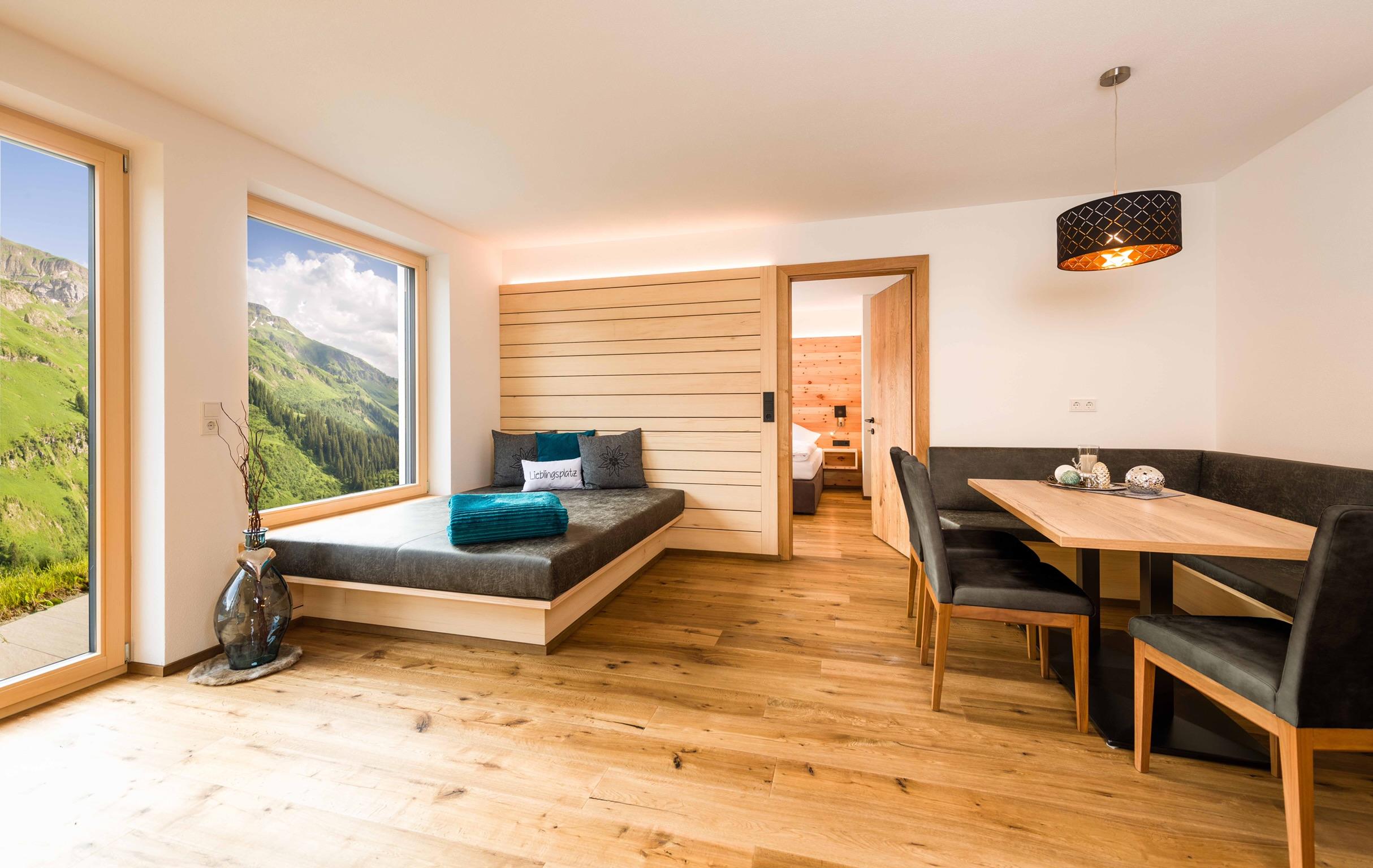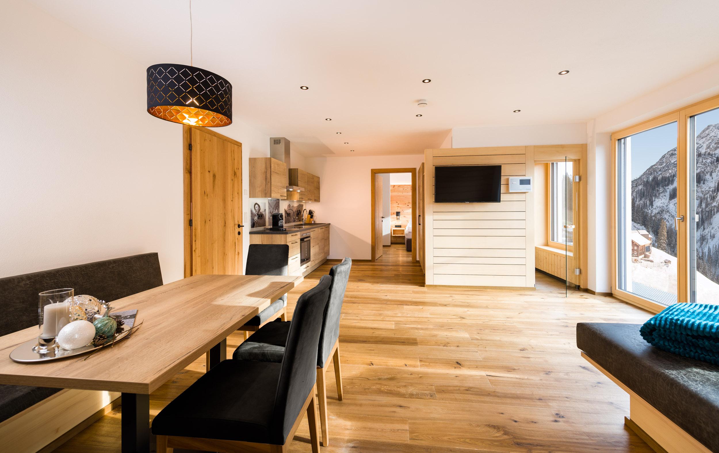 Unser modern eingerichtetes, neu eröffnetes Haus liegt mitten im Skigebiet Warth-Schröcken. Zentral aber in ruhiger Lage können Sie hier ausgiebig die Seele baumeln lassen und sind gleichzeitig nah dran an Natur, Action und Tradition. Jedes der drei Appartements hat zwei Schlafzimmer mit jeweils separatem Badezimmer. Sie eignen sich daher perfekt sowohl für junge Familien als auch für befreundete Paare, die zusammen reisen. Die großzügig geschnittenen Wohnungen verfügen außerdem über eine moderne, komplett ausgestattete Küche, eine große Terrasse mit Traumblick-Garantie und einen eigenen Wellnessbereich mit privater Sauna und Liegewiese mit Panoramafenster.