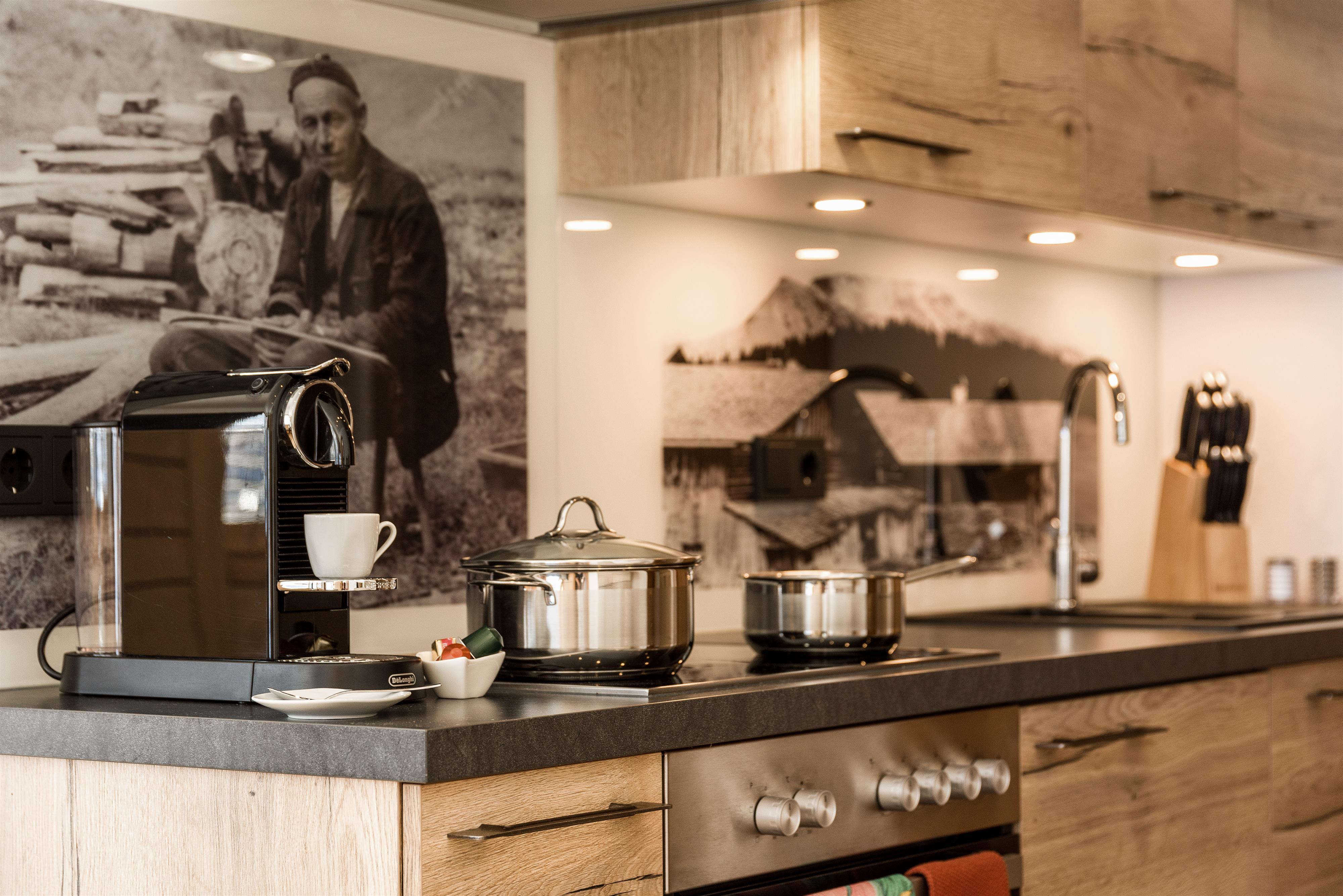 Der Wohnraum verfügt über eine Liegewiese mit Panoramafenster, einer gut ausgestatteten Küche, einem Essbereich mit herrlichem Blick in die Bergwelt sowie einer Garderobe.