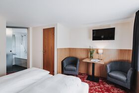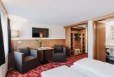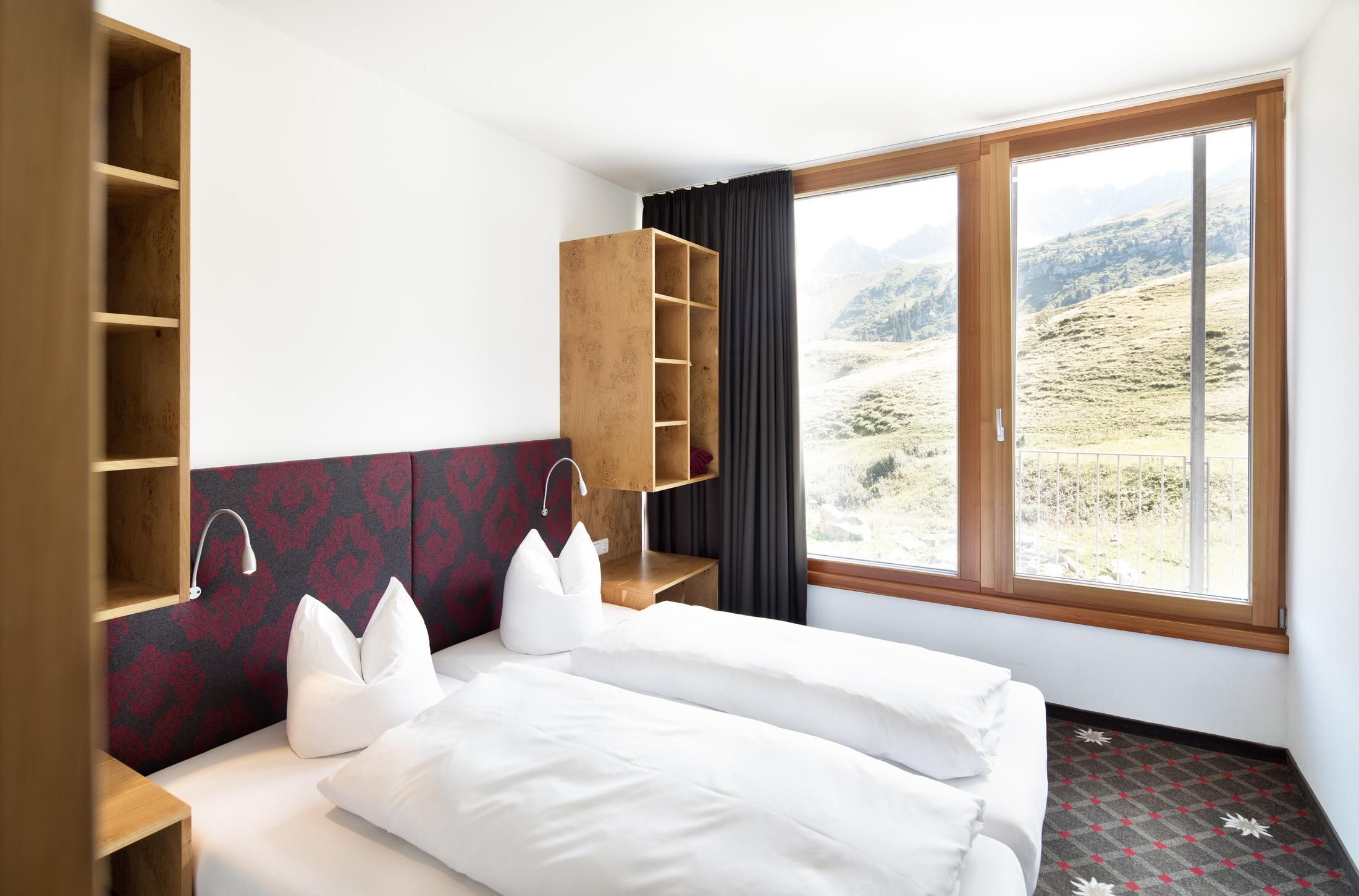 Ausgestattet mit einem Kingsize Bett (180x200cm), mit Dusche oder Badewanne und WC, TV/Radio, Hotelsafe, Wifi und Telefon. Alle Doppelzimmer befinden sich im Haupthaus in ruhiger Lage mit Blick auf die umliegenden Berge, aufgeteilt auf 3 Stockwerke