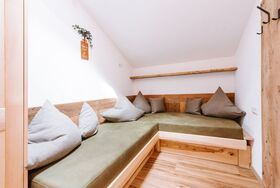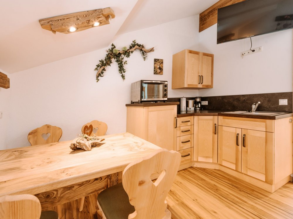 Eine Küchenzeile mit schöner Altholz-Sitzmöglichkeit laden zum gemütlichen Beisammensein ein. Das Zimmer befindet sich im Nebengebäude, 1. Stock.