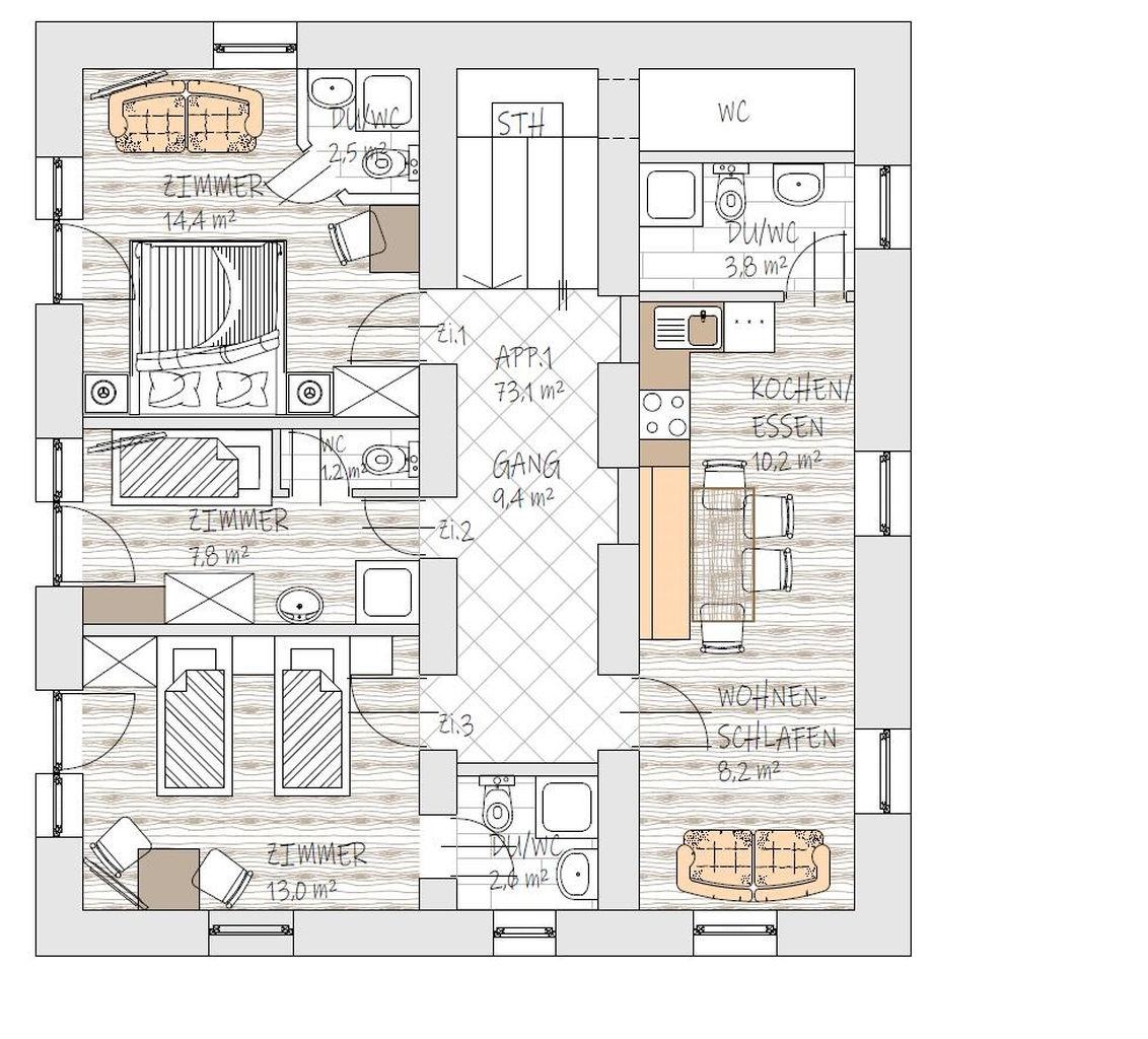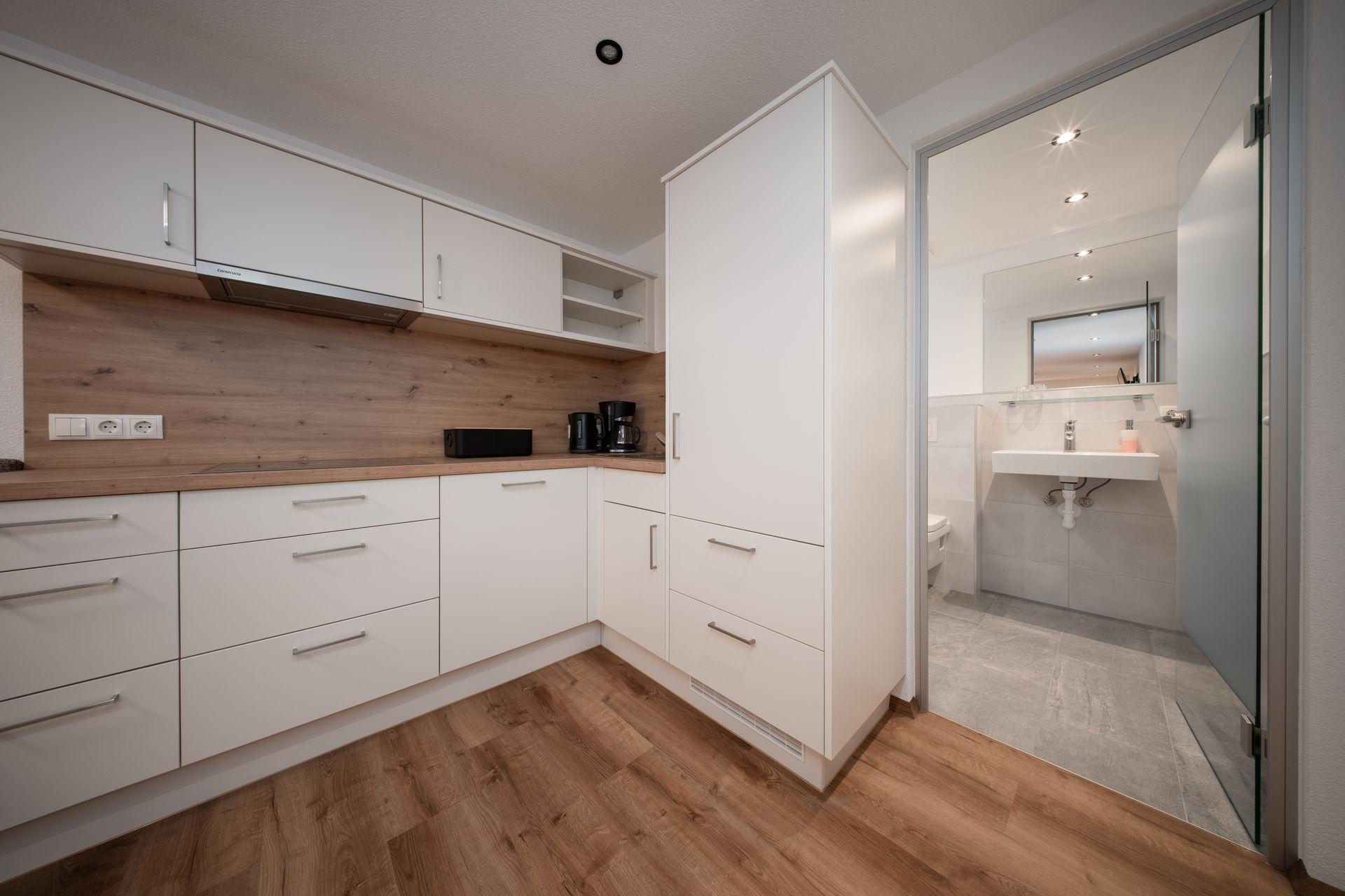Top 1 mit 1 x 3-Bettzimmer (Doppelbett mit Schlafsofa), 1 Einelzimmer, 1 Doppelzimmer, 3 Badezimmer mit Dusche/WC, vollausgestattete Wohnküche mit Sofa (Schlafsofa für 1 Person und ein zusätzliches Badzimmer), TV, Cerankochfeld (ohne Backrohr), Kühlschrank, Kaffemaschine (Filter und Kapsel), Mikro, Geschirrspüler uvm.