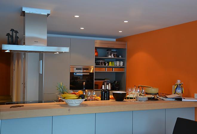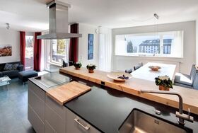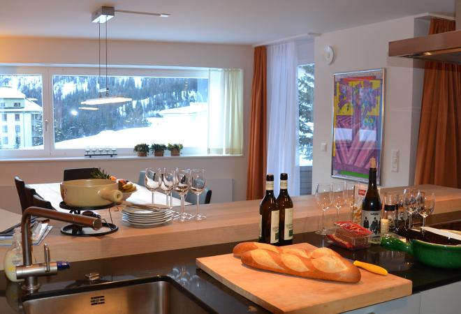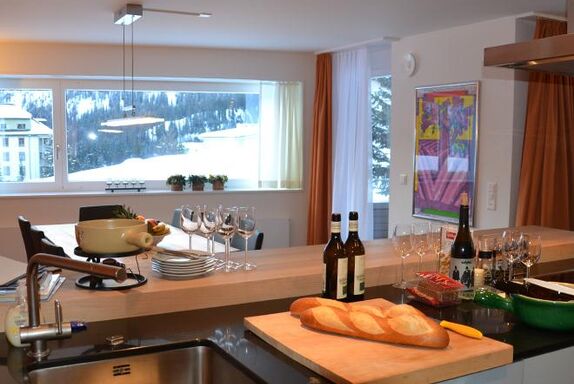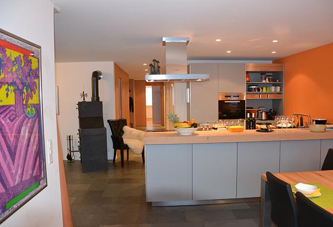 Sie befindet sich im in der obersten Etage (Lift). Grosszügige, lichtdurchflutete Räume schaffen einen eleganten Rahmen für genussvolle Ferien. Im Wohnbereich integriert ist eine moderne und komplett ausgestattete Bulthaup b3 Küche.