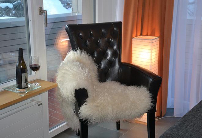 Eine bequeme Sitzgruppe, ein grosser Esstisch aus massivem Arvenholz und natürlich der Cheminéeofen sorgen für Gemütlichkeit.