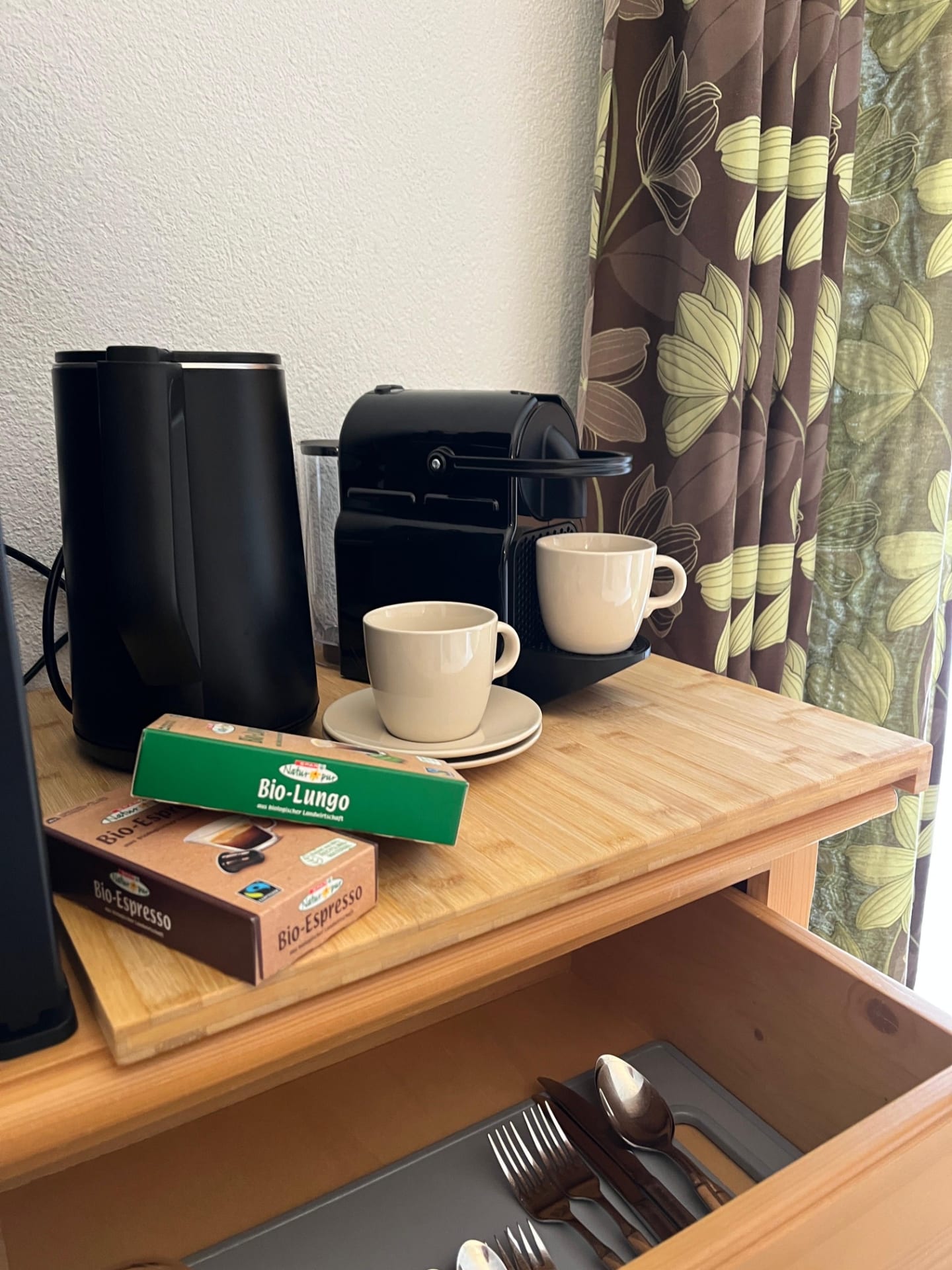 Zirbenzimmer mit Dusche, WC, Sat-TV, kostenloses WLAN, Balkon und mit Zirbenbetten aus eigener Landwirtschaft ausgestattet. Tauchen Sie mit dem Duft des Zirbenholzes in einen gesunden und wohlfühlenden Schlaf. Nespresso Maschine, Wasserkocher und kleiner Kühlschrank im ZImmer