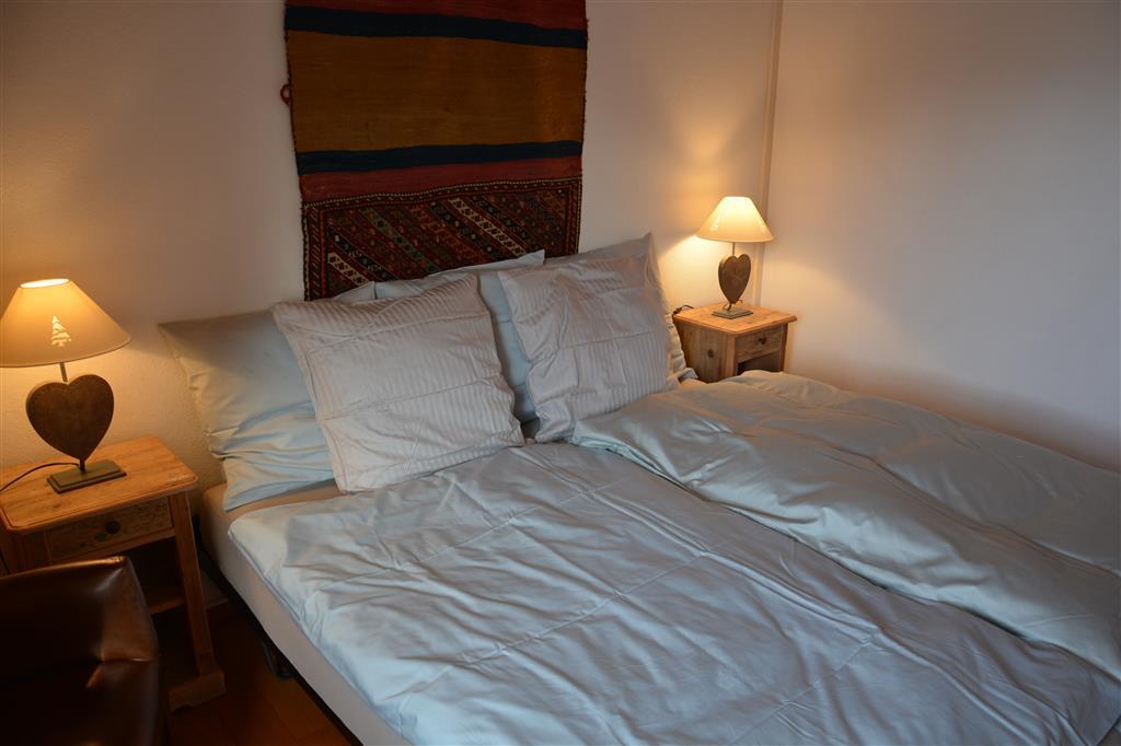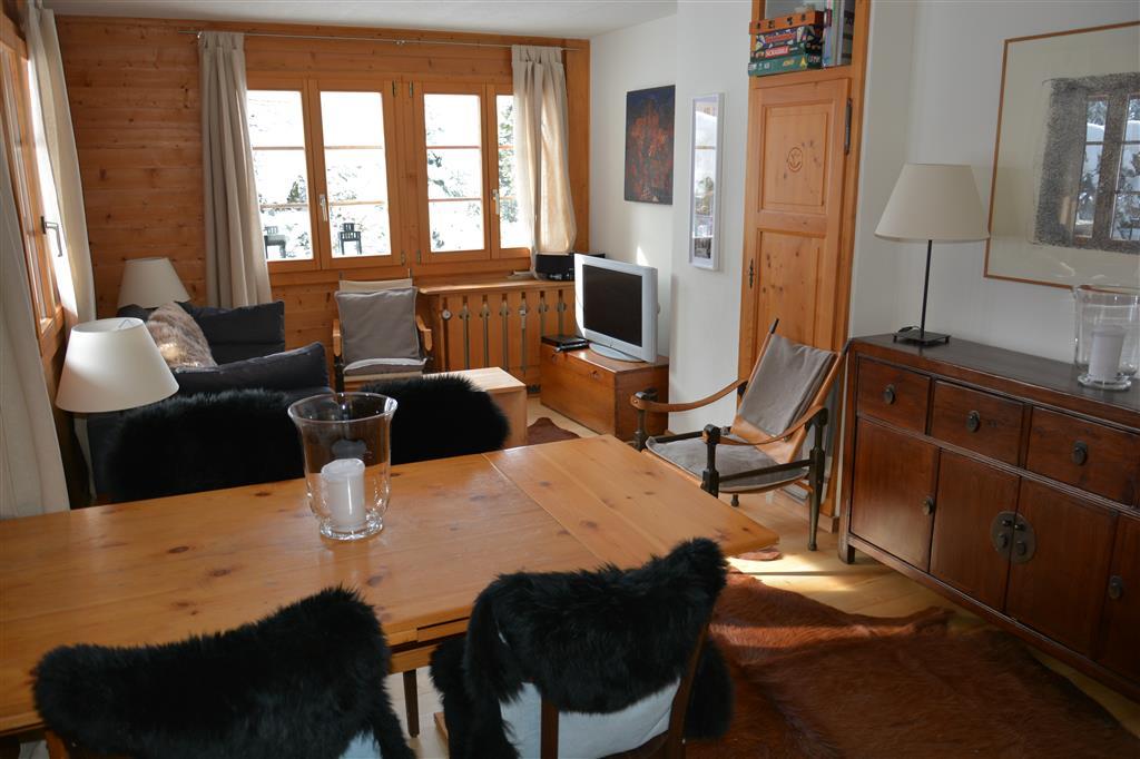 Wohn-/Esszimmer mit Sofa, Sesseln, Esstisch, Flachbildschirm-TV und WiFi. Geschlossene Küche (u. a. ausgestattet mit Kapsel-Kaffeemaschine (Nespresso), Fondue- und Raclette-Set). 1 Schlafzimmer mit Doppelbett (2x90x200cm). 1 Badezimmer mit Dusche/WC.