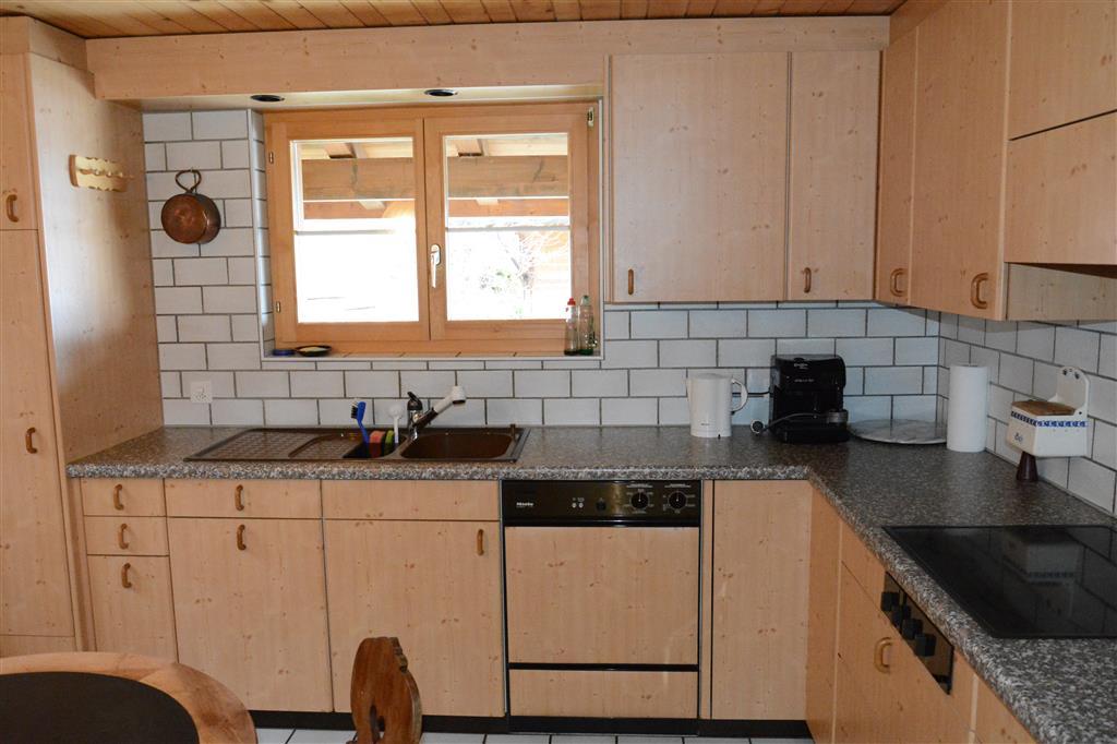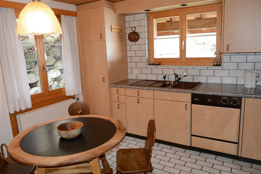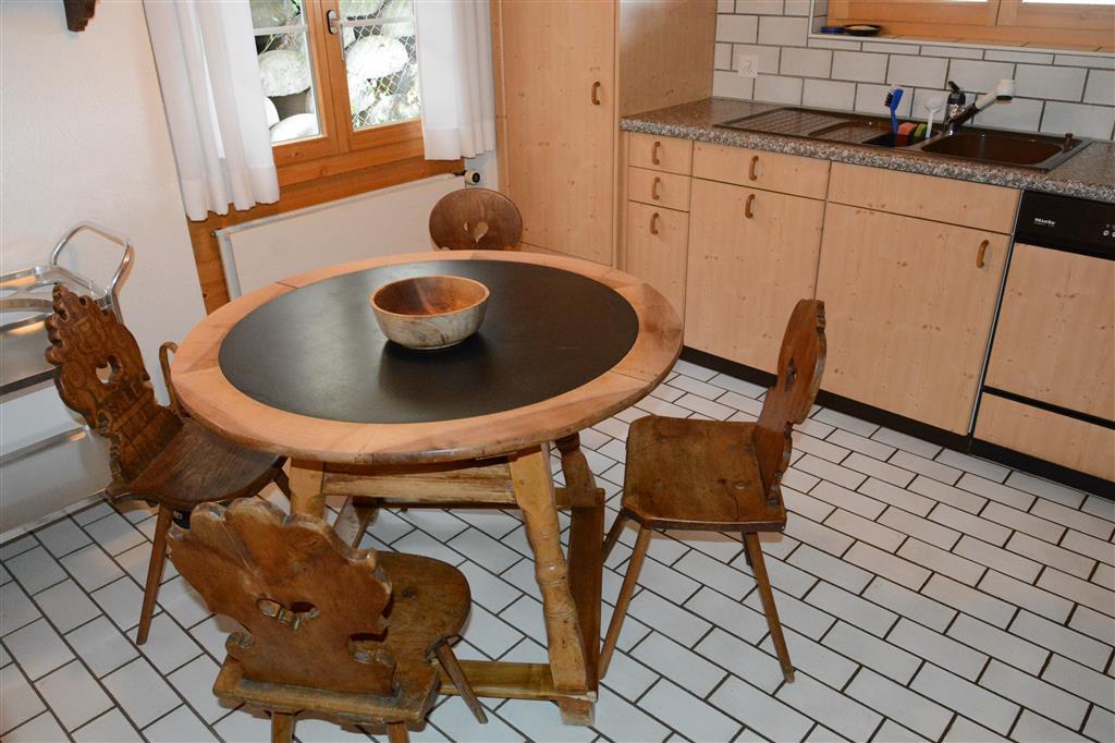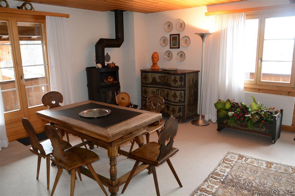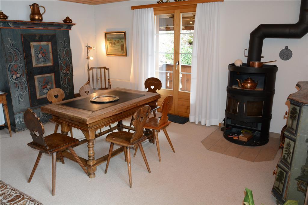 2. Stock: grosses Wohn-/Esszimmer mit Schwedenofen und Sat-TV (Flachbildschirm), Video, Radio, CD und DVD. Ausgang zum Balkon. Küche mit Esstisch (u.a. ausgestattet mit Kapsel-Kaffeemaschine (Delizio) sowie Fondue- und Raclette-Set). Dusche/WC.