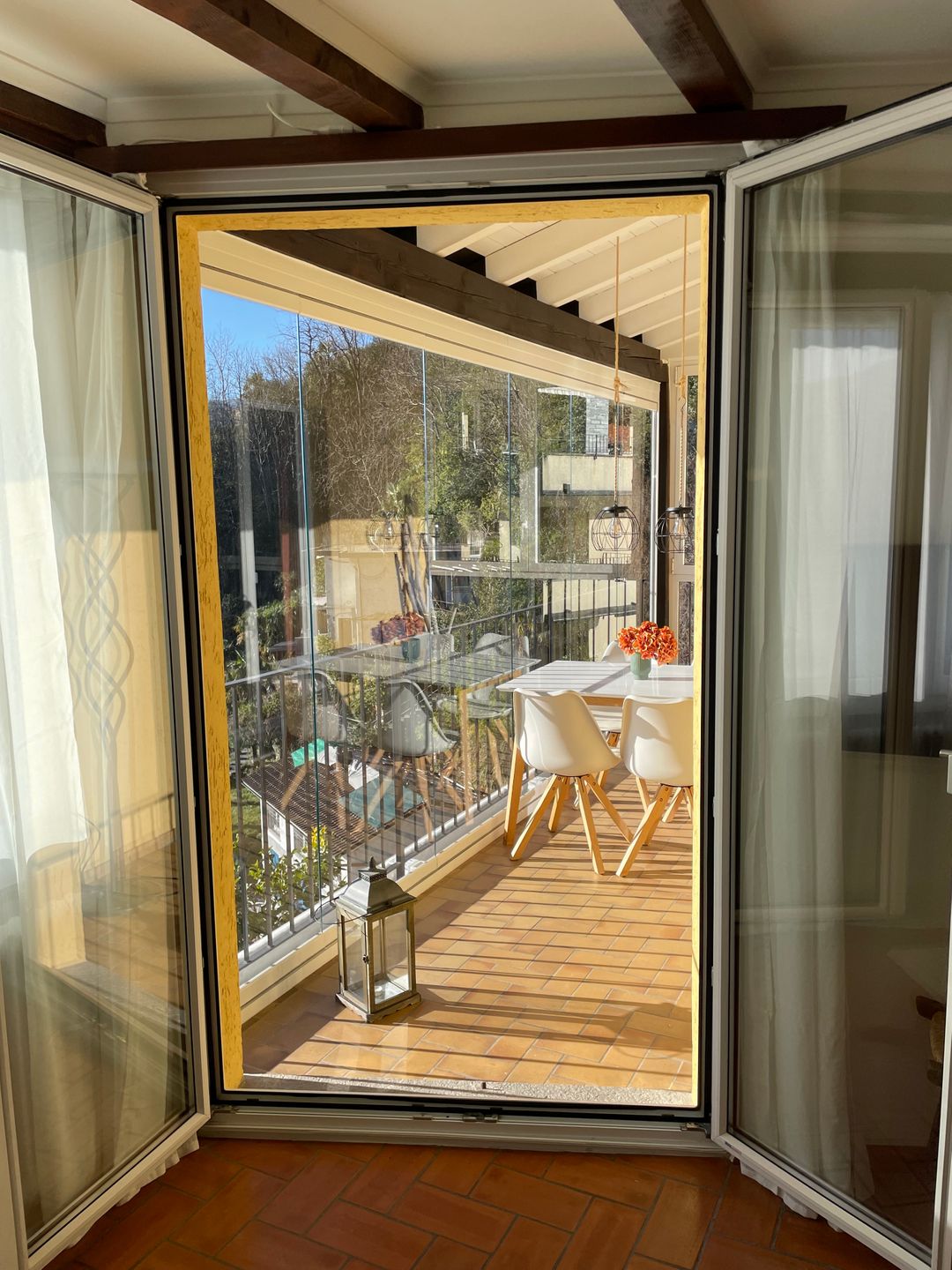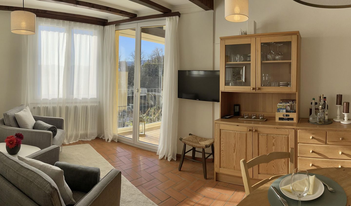 Ein besonderes Highlight: Die Terrasse lässt sich durch eine mobile Glasfront an kühleren Tagen in einen Wintergarten verwandeln – perfekt, um den Ausblick das ganze Jahr über zu geniessen. Die separate, kompakte Küche ist mit allem ausgestattet, was Sie für die Selbstverpflegung benötigen. Zwei Doppelschlafzimmer sorgen für erholsamen Schlaf – eines davon mit direktem Zugang zur Terrasse.