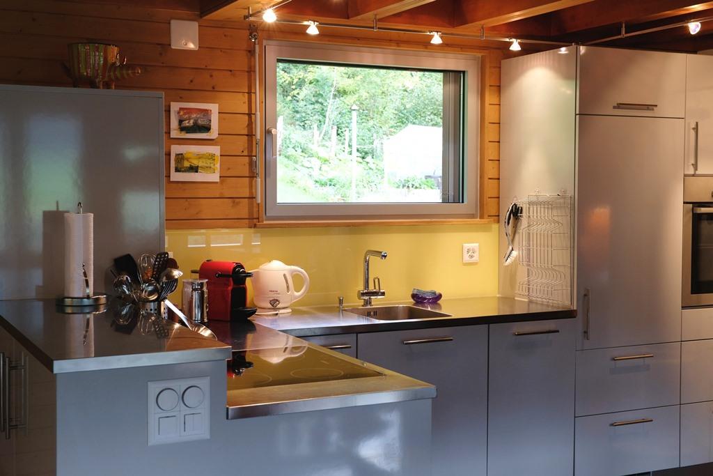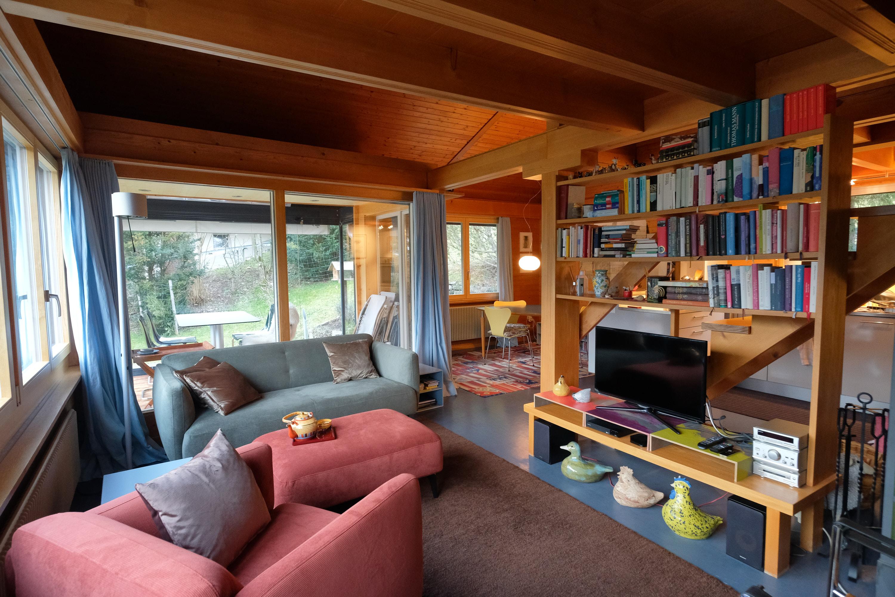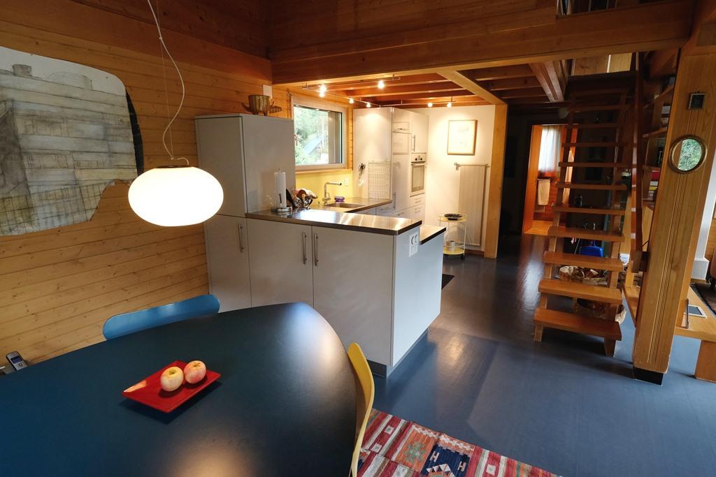 Hochparterre (Eingang): Grosses und helles Wohn-/Esszimmer mit Sofa, 2 Sesseln, TV, Teleboy mit über 250 Sendern, Apple TV und Netflix (eigenes Abo nötig), Essecke mit Esstisch. Offene Küche mit Geschirrspüler, Kapsel-Kaffeemaschine (Nespresso), Fondue- und Raclette-Set sowie diversen weiteren Küchengeräten. 1 Schlafzimmer mit Grand Lit (160x200cm). 1 Badezimmer mit Badewanne/WC.