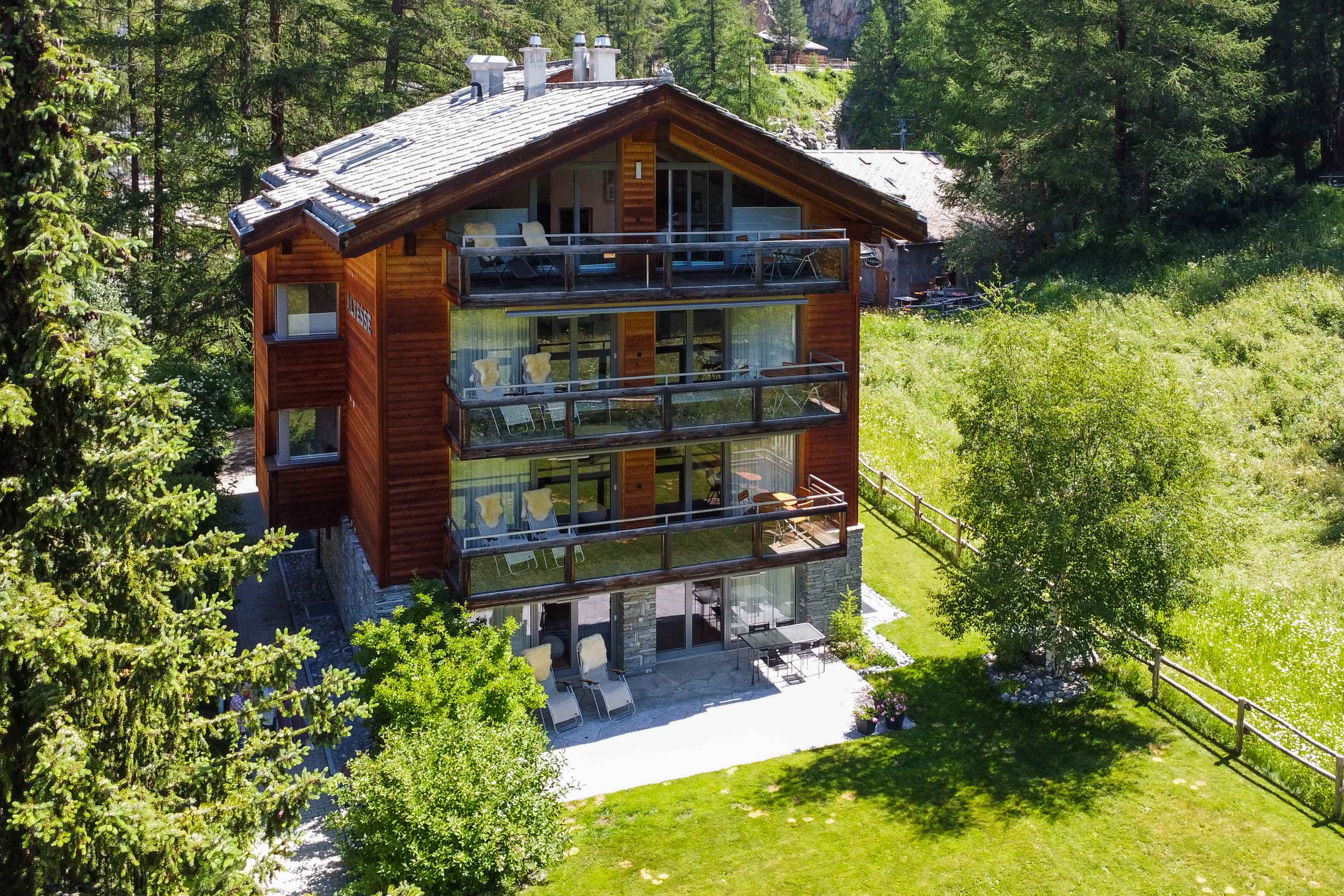 Familiengeführtes, exklusives 5* ski-in und out (je nach Schneeverhältnissen) Chalet mit atemberaubenden Matterhornblick. 4 grosse, luxouriöse und komfortable 6-Bettwohnungen. Ruhige Lage, 2 min von Restaurants, kl Lebensmittelgeschäft, Spielplatz. In unmittelbarer Nähe der Talstation Furri (ca. 7min) und dem Zentrum (ca. 15min). Untergeschoss: Wellness; Sauna + Dampfbad, Skiraum inkl. Skischuhwärmern. Lift. Rollstuhlzugängig. Haustiere auf Anfrage. Nichtraucher. Inkl. im Mietpreis: Kurtaxen, tägliche Lieferung des Frühstücksbrot, Zwischen- (min 7 Nächte) & Endreinigung, Wifi, Transfer Bahnhof/Chalet. Wäsche-, Putz- und Einkauf Service auf Anfrage.