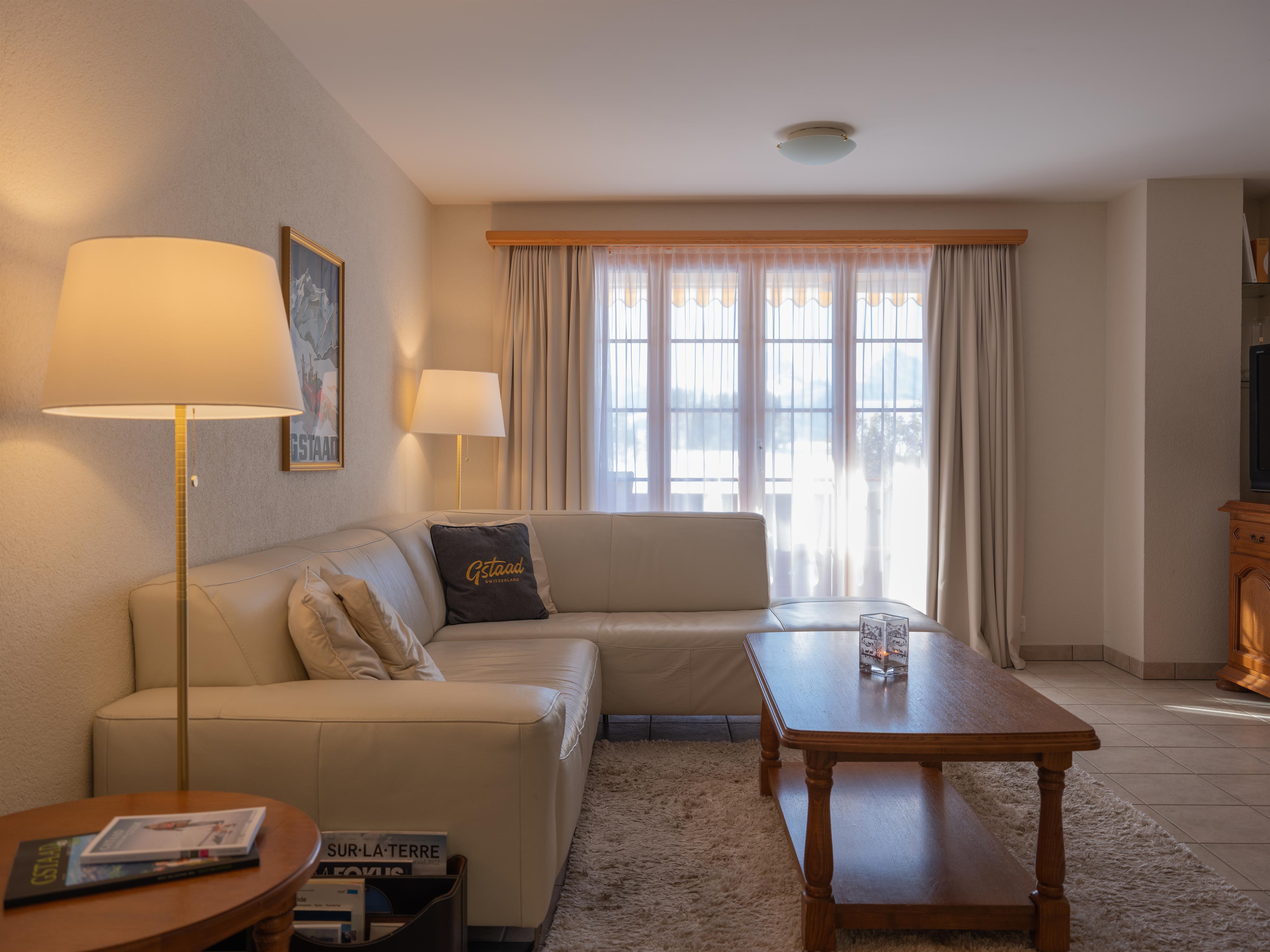 3.5-Zimmerwohnung (74m2) im 1. Stock eines im Jahre 2000 erbauten Mehrfamilienchalets mit Lift/Aufzug. Grosser möblierter Balkon. Ruhige und sonnige Lage mit schöner Aussicht über das Saanenland. 1 Einstellhallenplatz (Nr. 7) ist vorhanden. Ein Abstellraum für Sportgeräte (Schrank Nr. 12C) sowie eine Waschküche mit Waschmaschine und Wäschetrockner stehen im Untergeschoss zur gemeinschaftlichen Benutzung zur Verfügung.