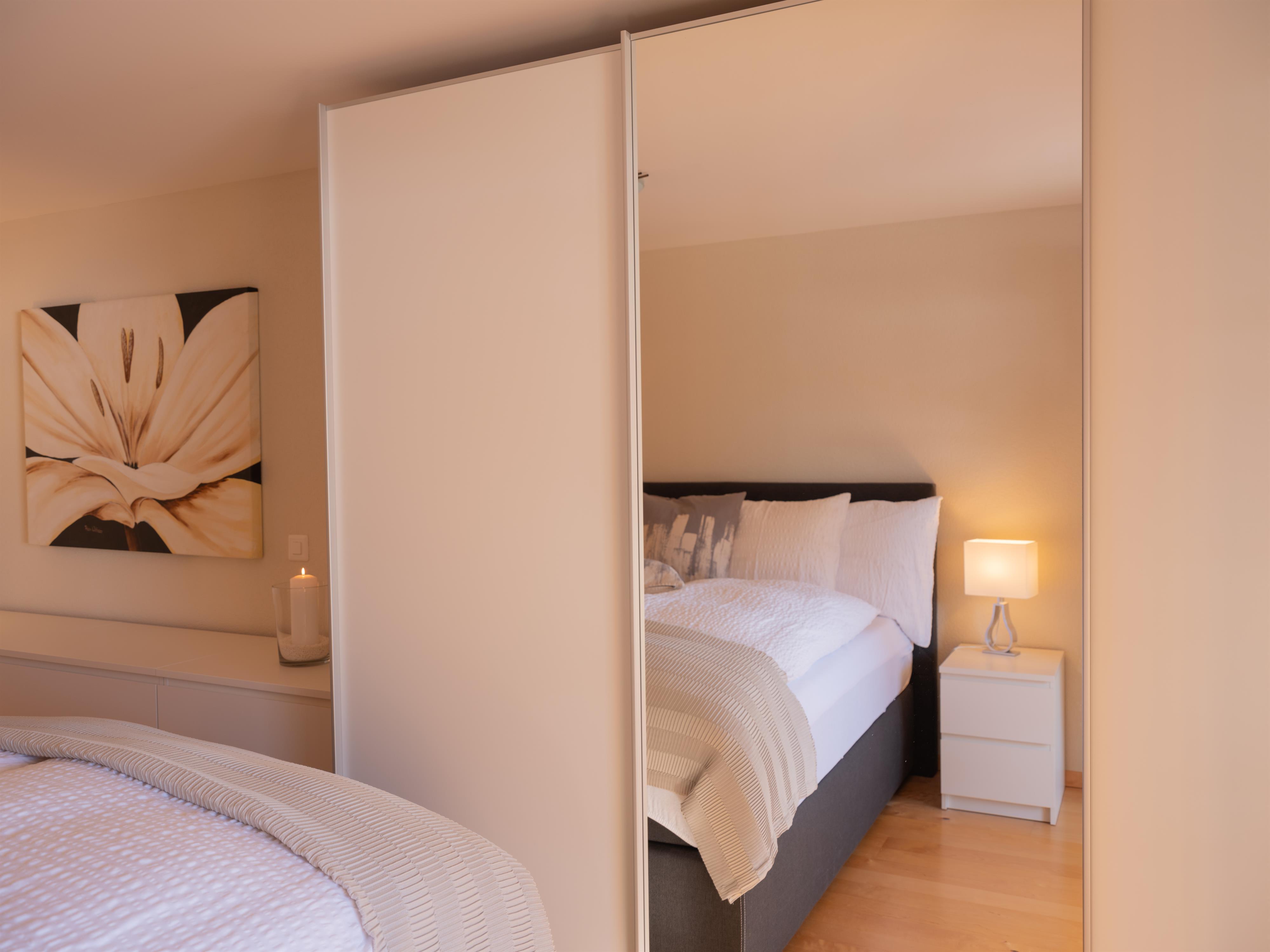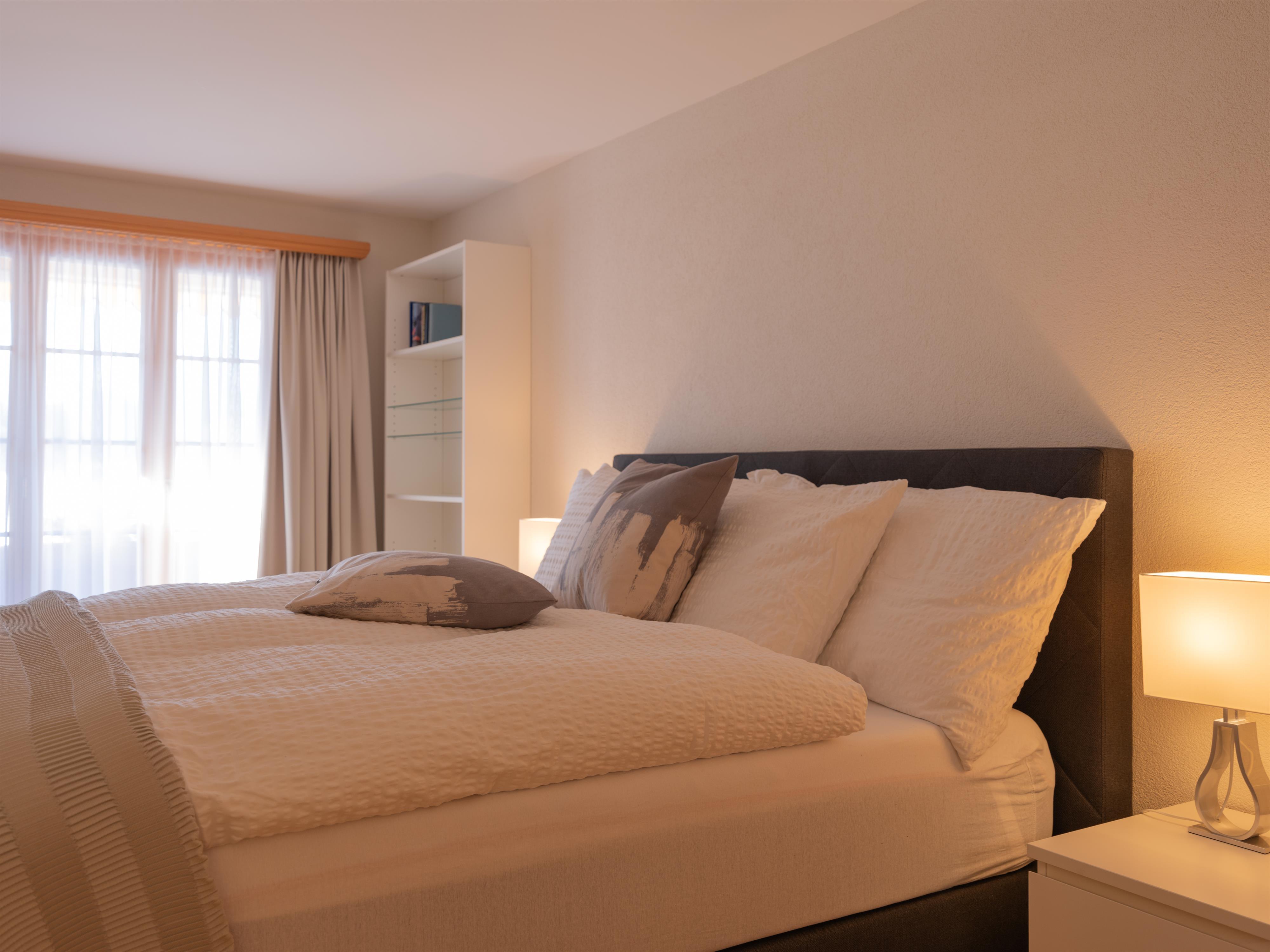 Helles Wohn-/Esszimmer mit offener Küche (u.a. ausgestattet mit Keramikherd, Backofen, Kühlschrank mit Gefrierfach, Geschirrspülmaschine, Kapsel-Kaffeemaschine (Nespresso) sowie Fondue- und Raclette-Set), Esstisch, Sitzgruppe und TV. 1 Schlafzimmer mit 1 Grand Lit (160x200cm) und Balkonzugang. 1 Schlafzimmer mit 1 Grand Lit (160x200cm), Balkonzugang und Badezimmer mit Badewanne/WC. 1 separates Badezimmer mit Dusche/WC. Die ganze Wohnung verfügt über eine in allen Zimmern individuell regulierbare Bodenheizung. WiFi.