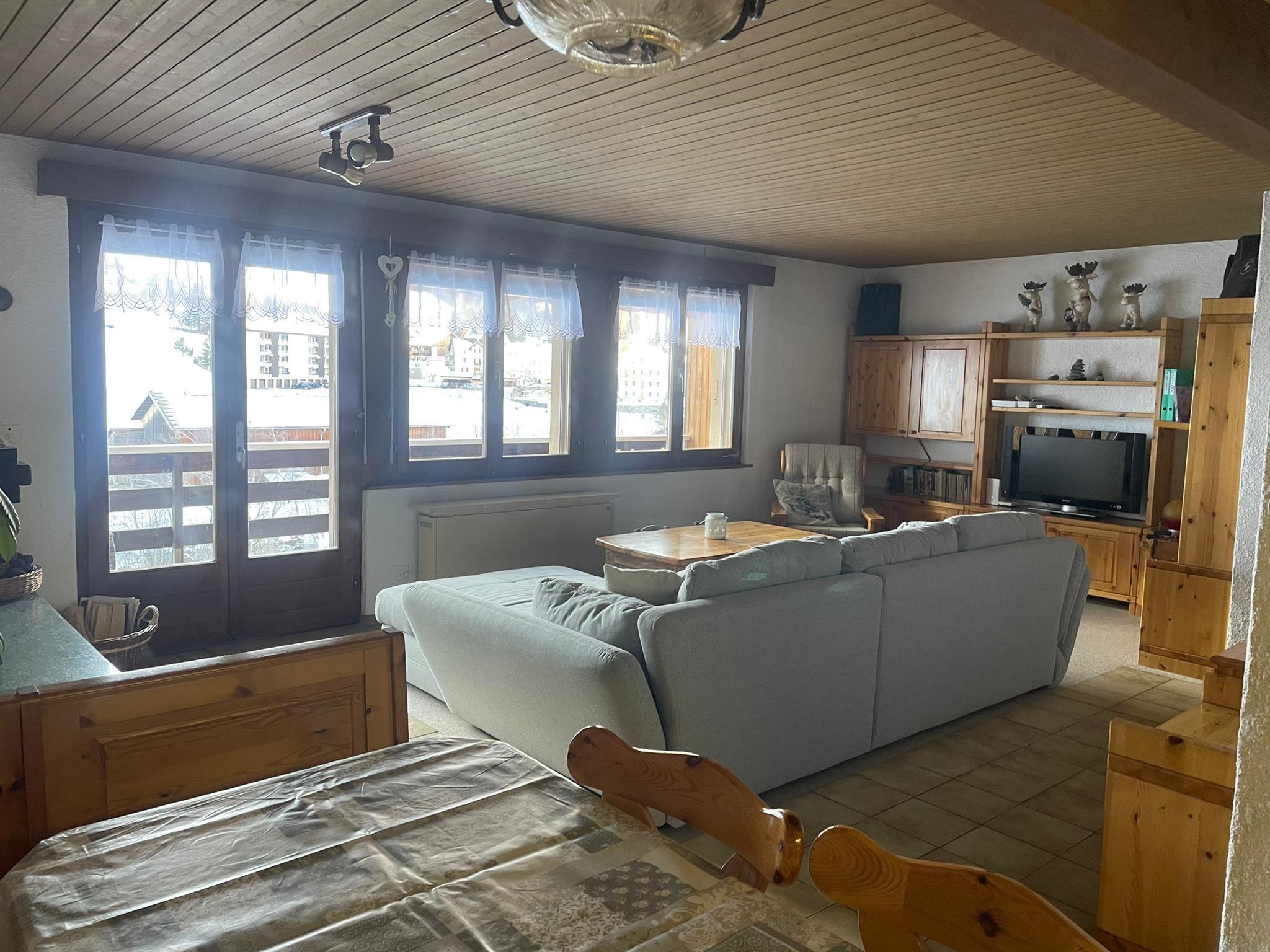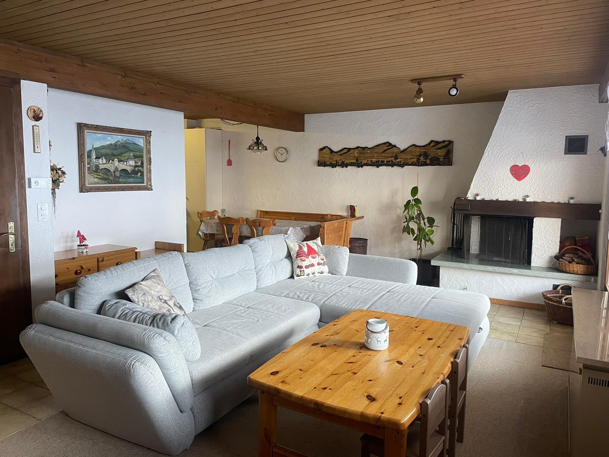3 1/2-Zimmermaisonettewohnung 80 m2 in Einfamilienhaus. 1 Schlafzimmer mit 1 Doppelbett. 1 Schlafzimmer mit 2 Etagenbetten, insgesammt 6 Betten. Babybett. Bettwäsche und Küchentücher vorhanden. Wohnküche mit Backofen, Kühlschrank, Geschirrspülmaschine, Kaffeemaschine, Mikrowelle, Toaster und Wasserkocher. Fondue Caquelon und Racletteofen. Bad, Duschkabine, WC. Separates WC. Haartrockner. Haustiere nicht erlaubt. Nichtraucherwohnung. Cheminée. TV und Radio. Terrasse/Balkon. Parkplatz. Das Haus liegt an ruhiger, sonniger und zentraler Lage.