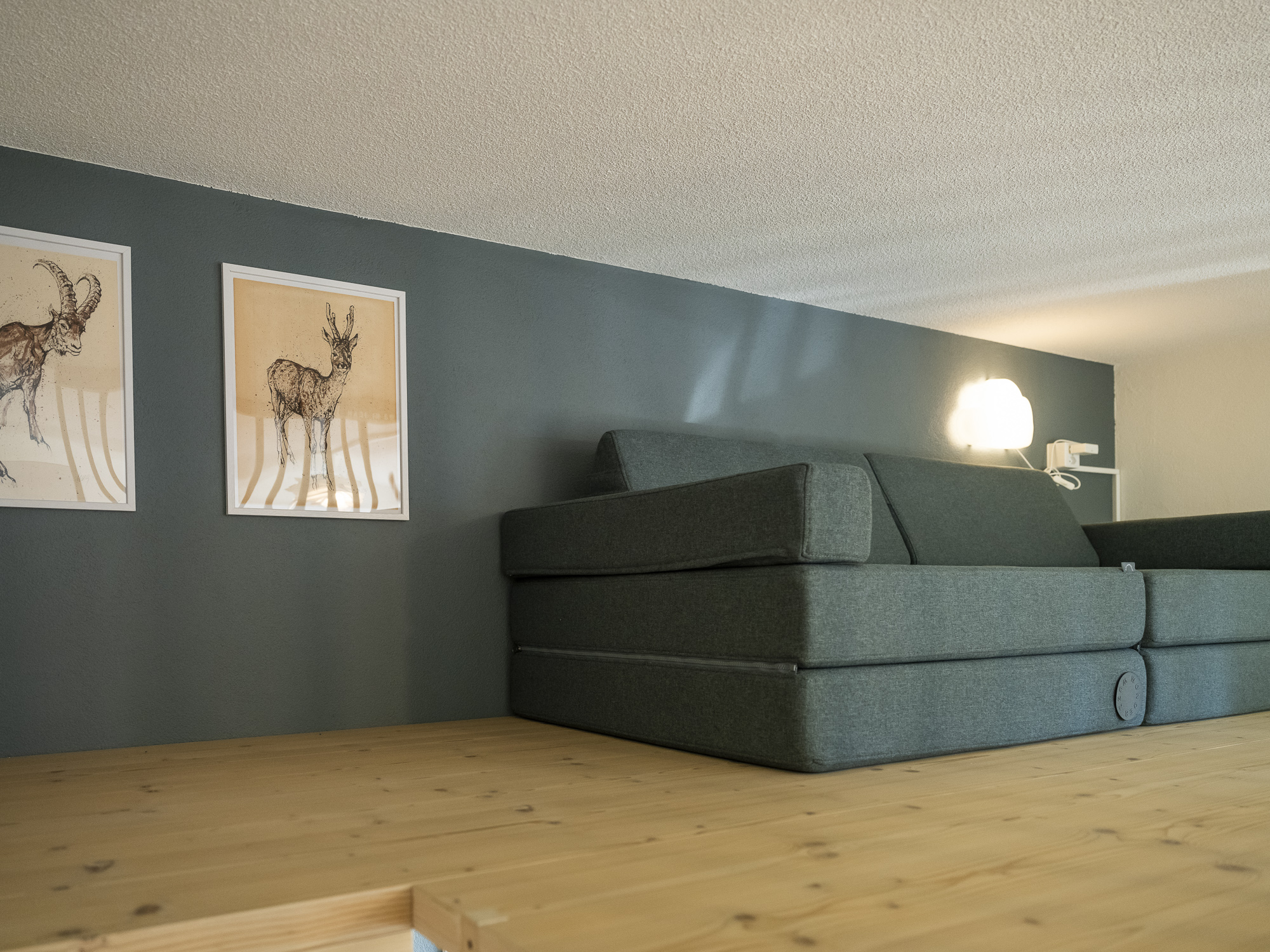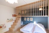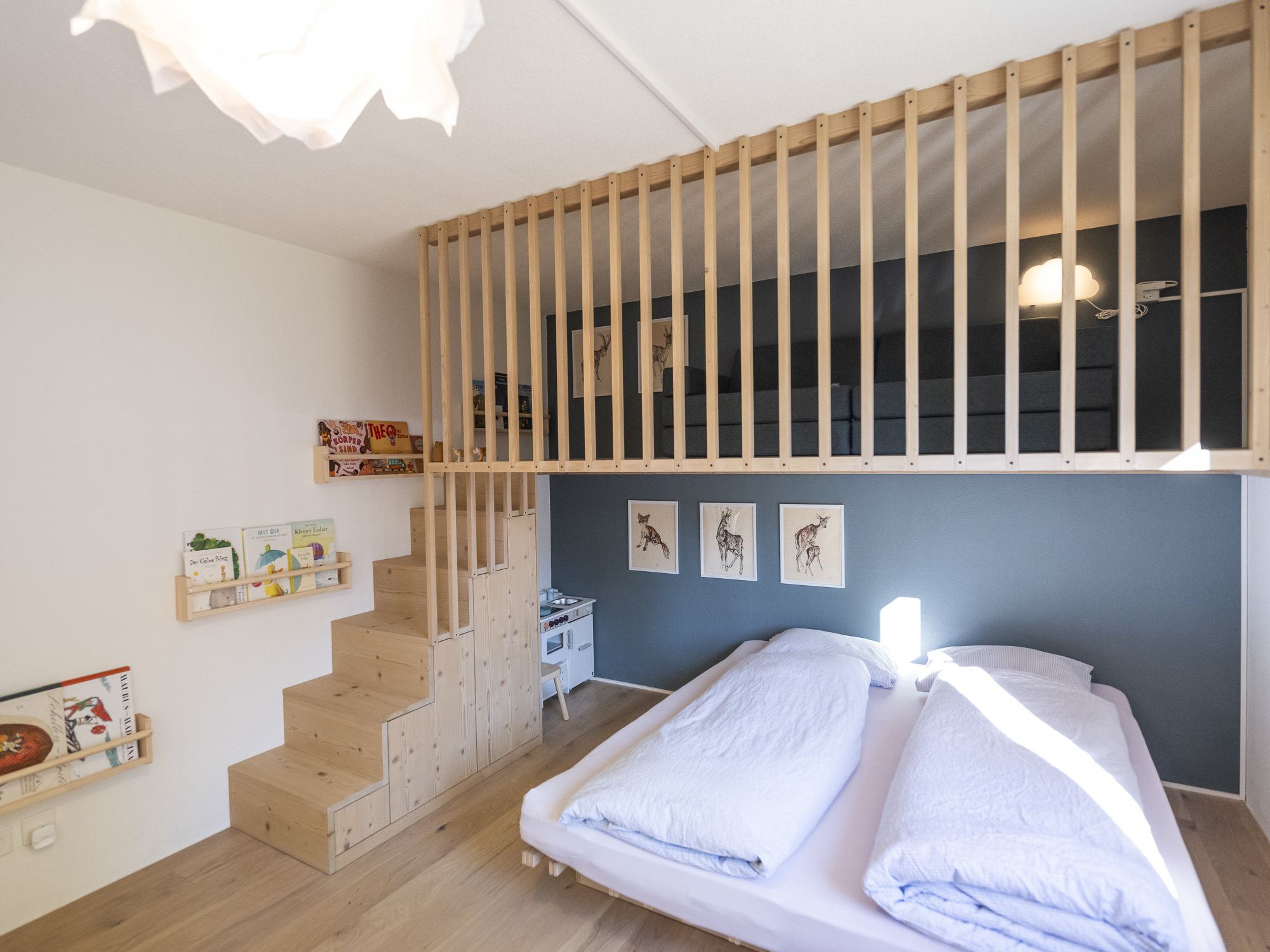 - Schlafzimmer 2 verfügt über ein Doppelbett (160cm breit, zwei Einzelmatratzen) sowie ein Spielsofa auf der Galerie, welches zu einem Bett umfunktioniert werden kann (160cm breit mit Standardlänge 200cm). Die beiden Einzelmatratzen können bei Bedarf auch auf der Galerie als Schlafmöglichkeit verwendet werden (Kinder lieben es!).