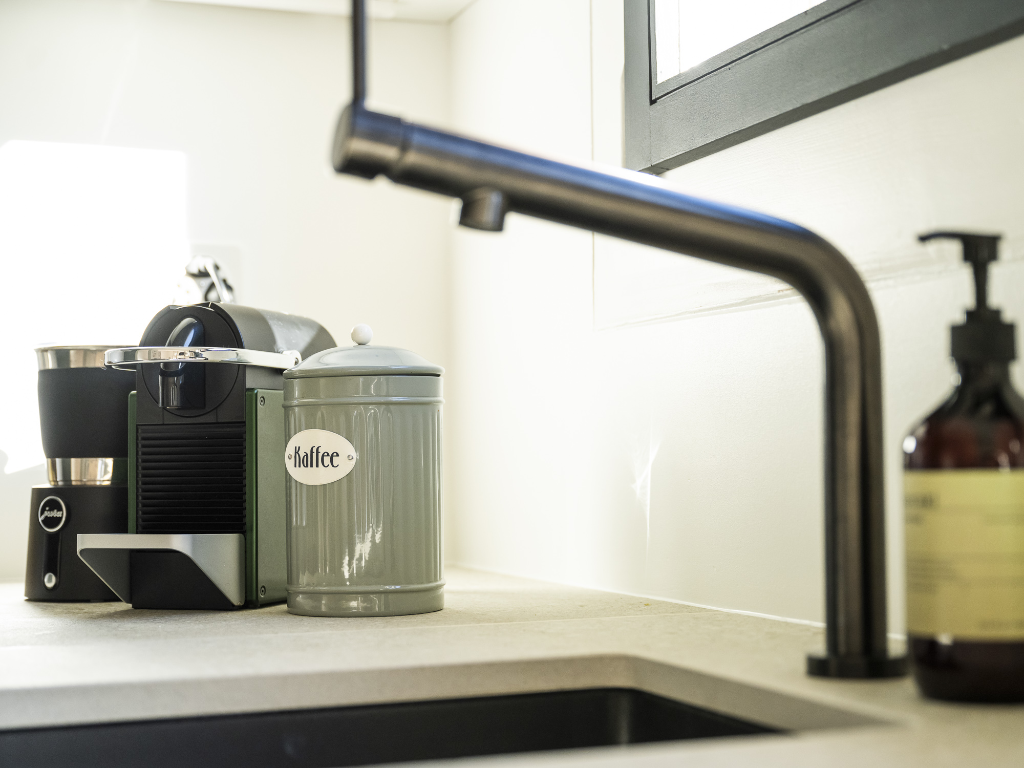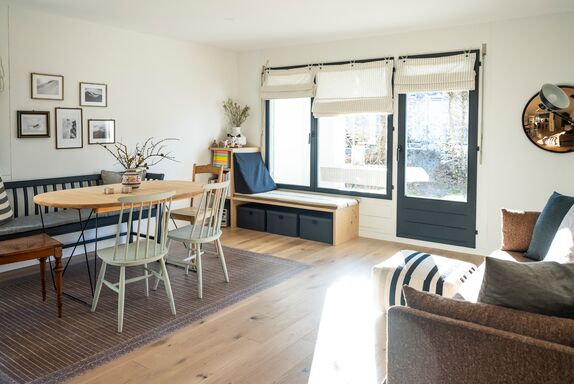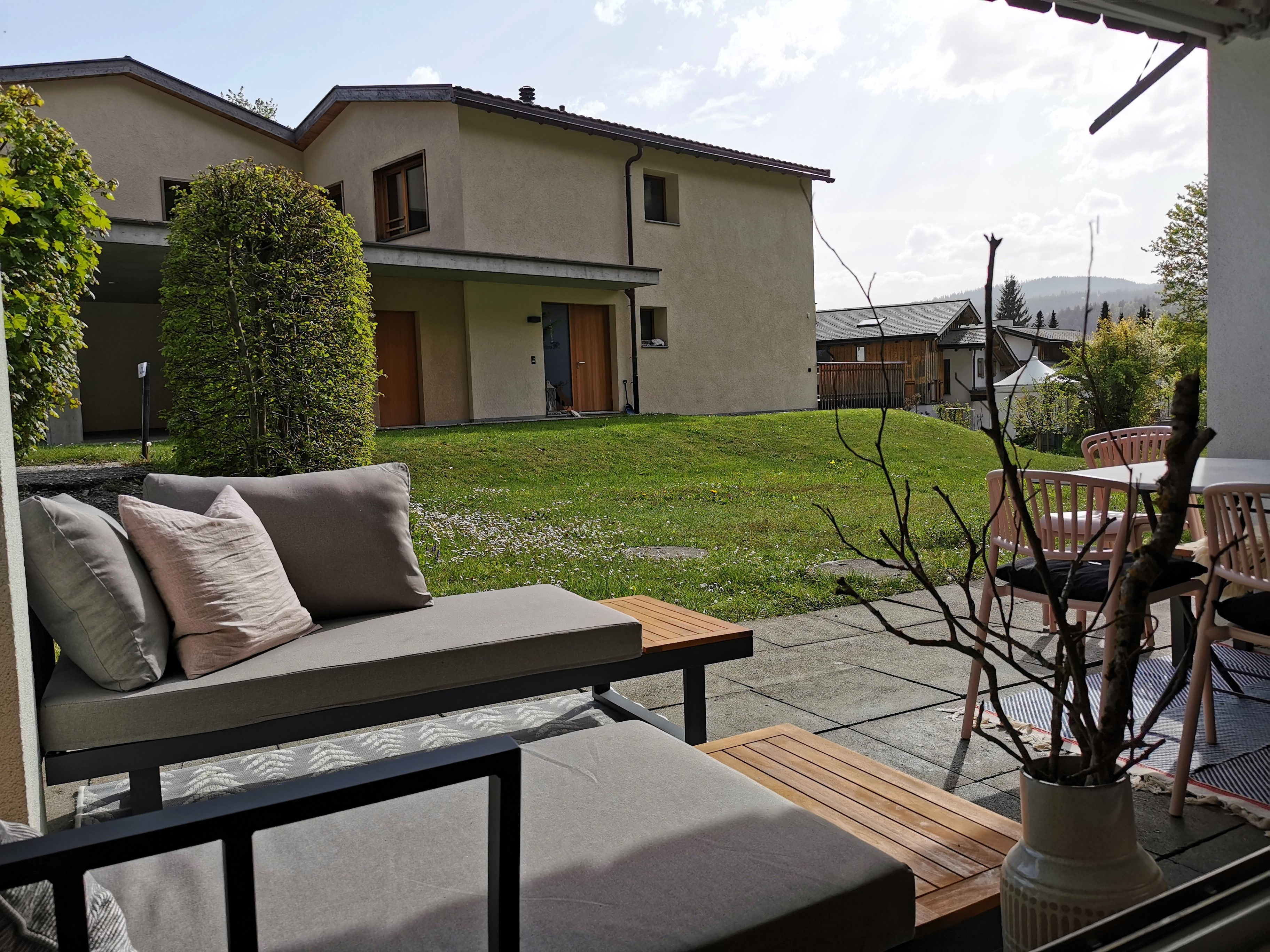 Auf 63 m2 verteilt verfügt die liebevoll und gemütlich eingerichtete Wohnung über ein helles Wohnzimmer mit Sofa, Fensterbank und Esstisch, eine offene Küche mit Kücheninsel, zwei Schlafzimmer, ein Badezimmer sowie einem Sitzplatz mit Nachmittags- und Abendsonne, welcher direkt in eine bespielbare Wiese übergeht.