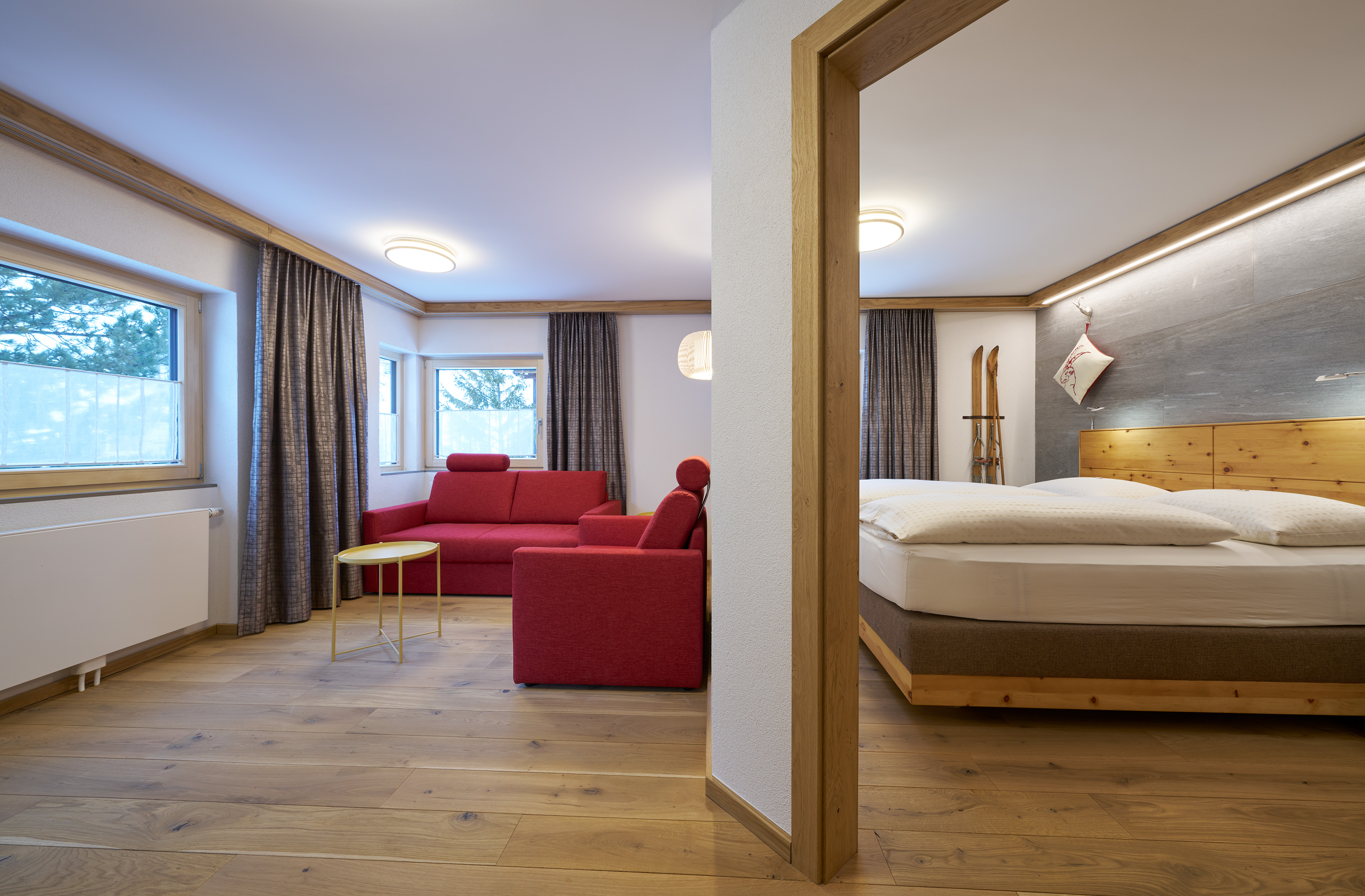 In den getrennten Doppelzimmern schlafen Sie in Boxspringbetten aus Arvenholz «made in Austria», jeweils mit eigenen Dusch- und WC-Bereichen ausgestattet mit Regenduschen, Geberit® Dusch-WC und flauschige Badetüchern. Die Küchen sind voll ausgestattet, am Esstisch finden Sie bequem Platz zu viert und der Wohnbereich lädt zum Verweilen ein.