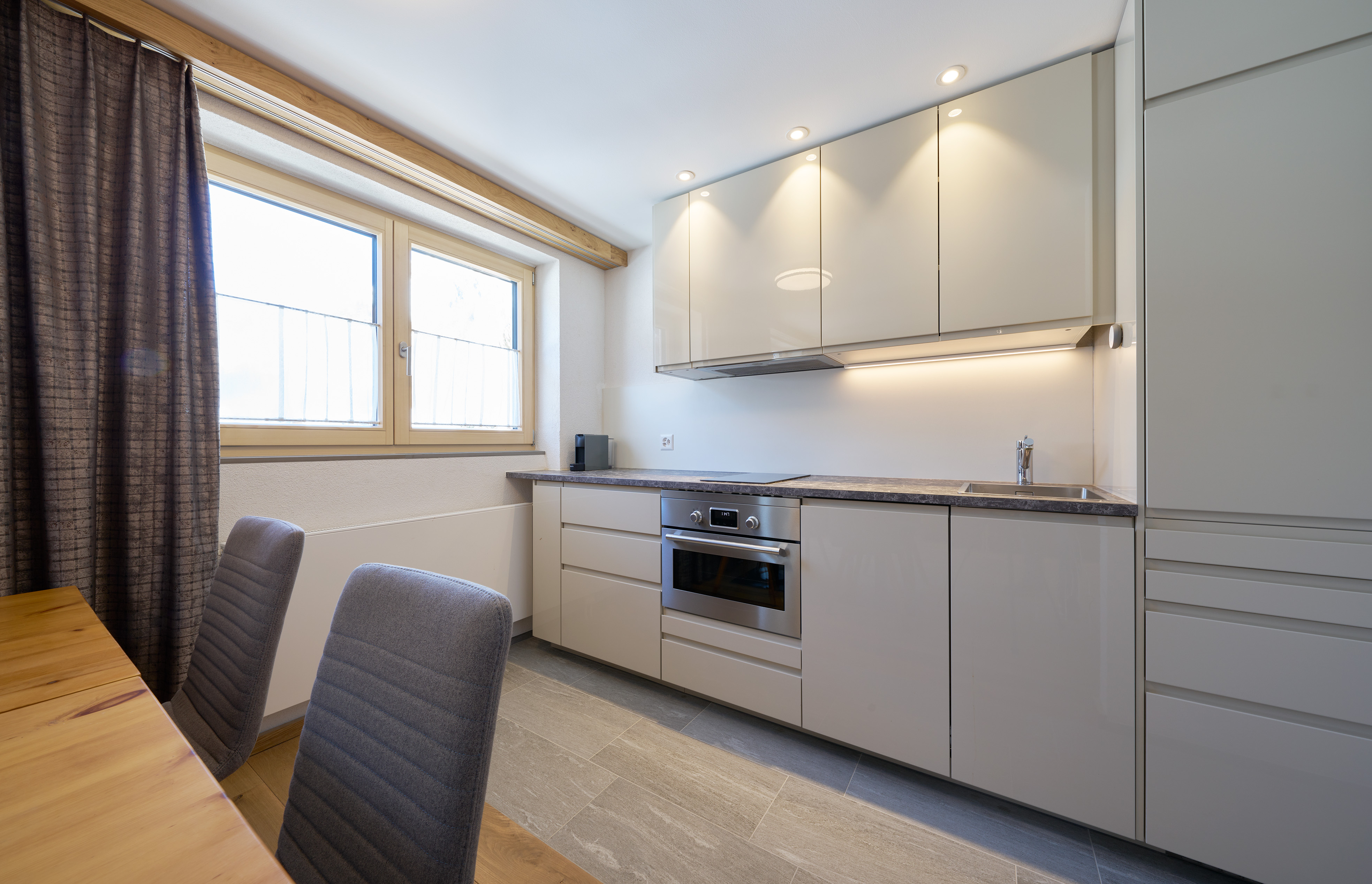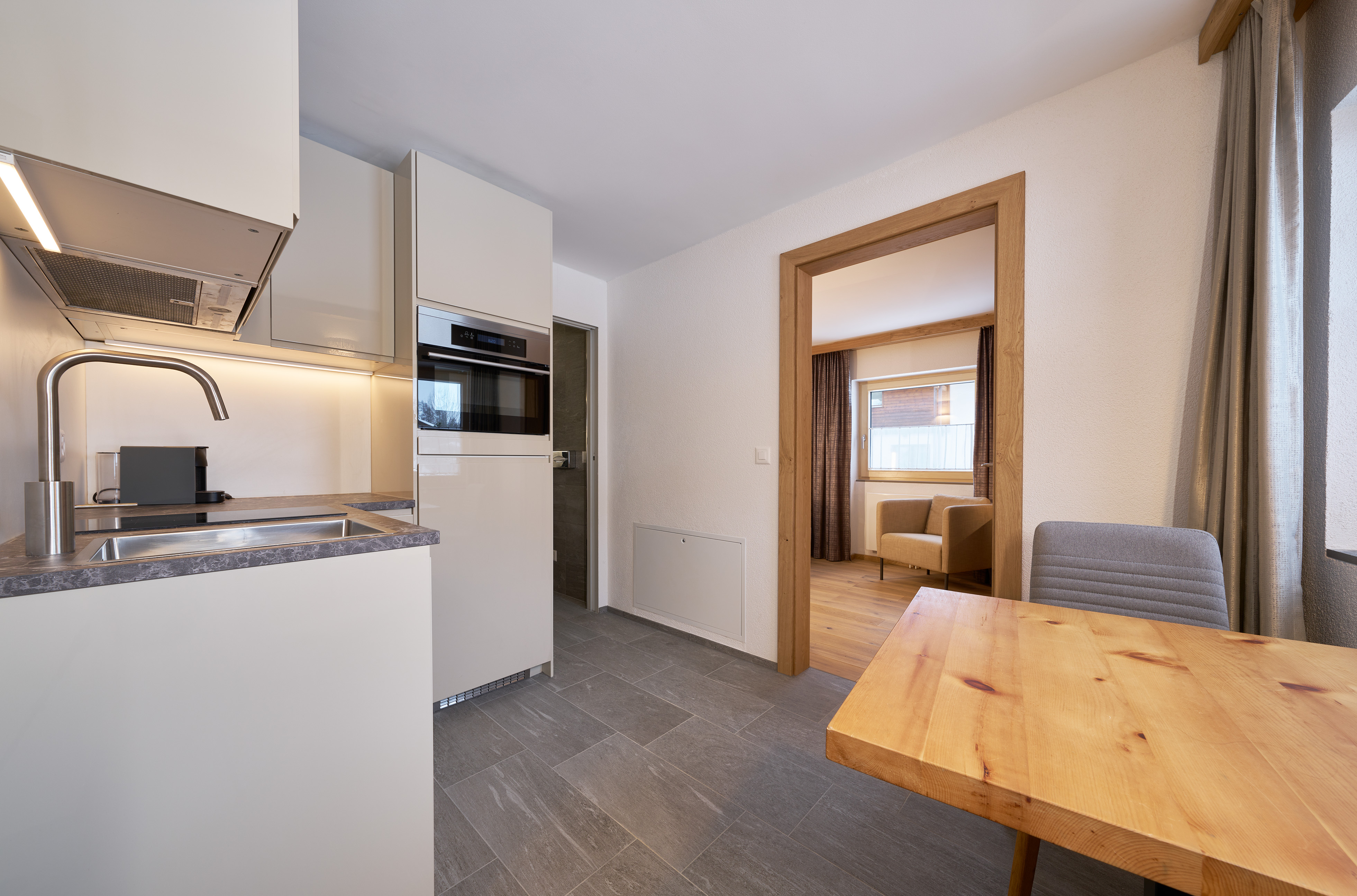 In den getrennten Doppelzimmern schlafen Sie in Boxspringbetten aus Arvenholz «made in Austria», jeweils mit eigenen Dusch- und WC-Bereichen ausgestattet mit Regenduschen, Geberit® Dusch-WC und flauschige Badetüchern. Die Küchen sind voll ausgestattet, am Esstisch finden Sie bequem Platz zu viert und der Wohnbereich lädt zum Verweilen ein.