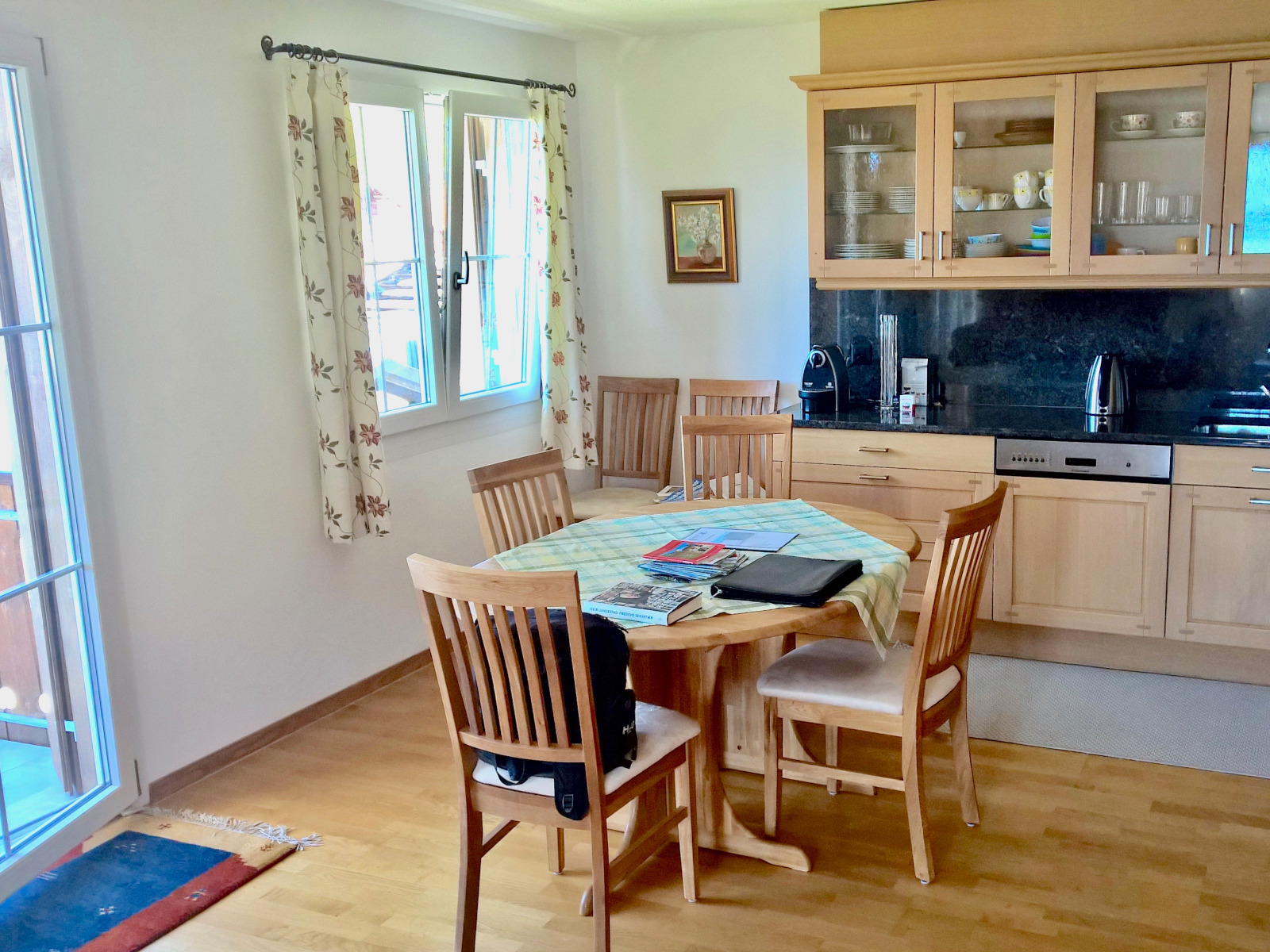 Wohnküche mit rundem Esstisch und Balkonzugang, Backofen, Geschirrspüler, Nespresso-Kaffeemaschine (Kapseln), Wasserkocher, sowie Raclette-/Fondue- und Fondue-Chinoise-Set.Badezimmer: