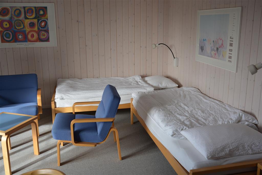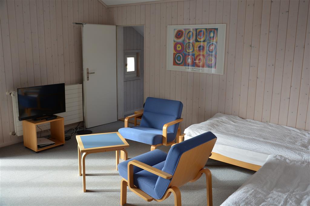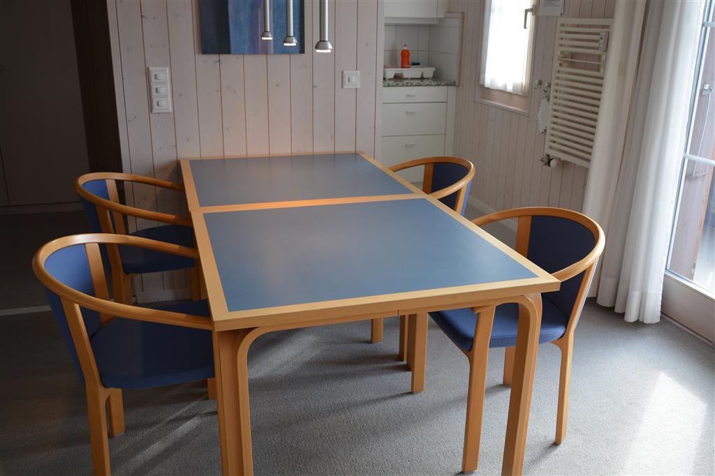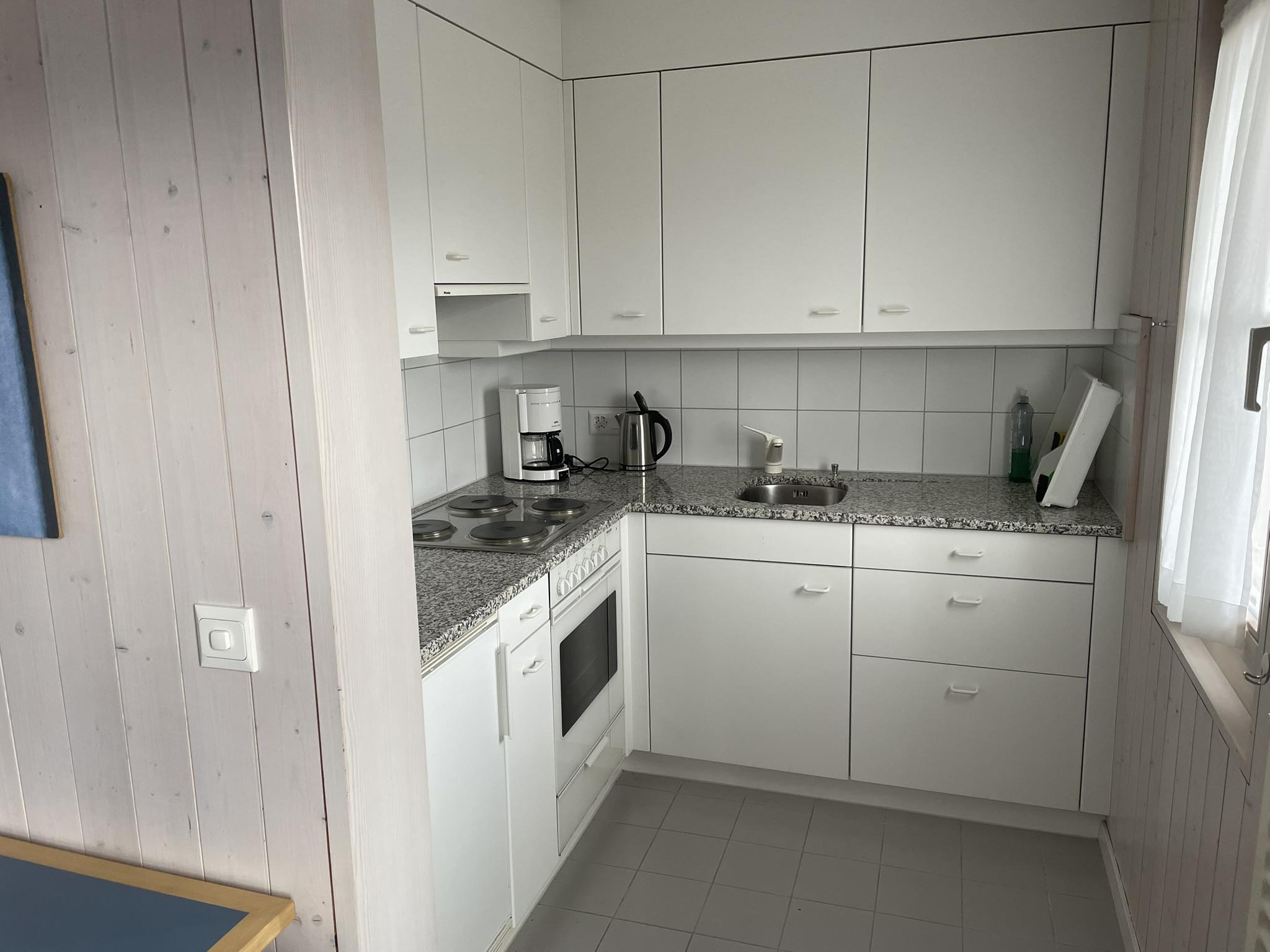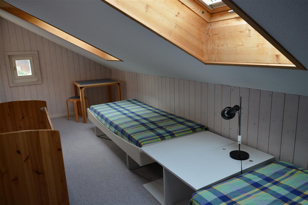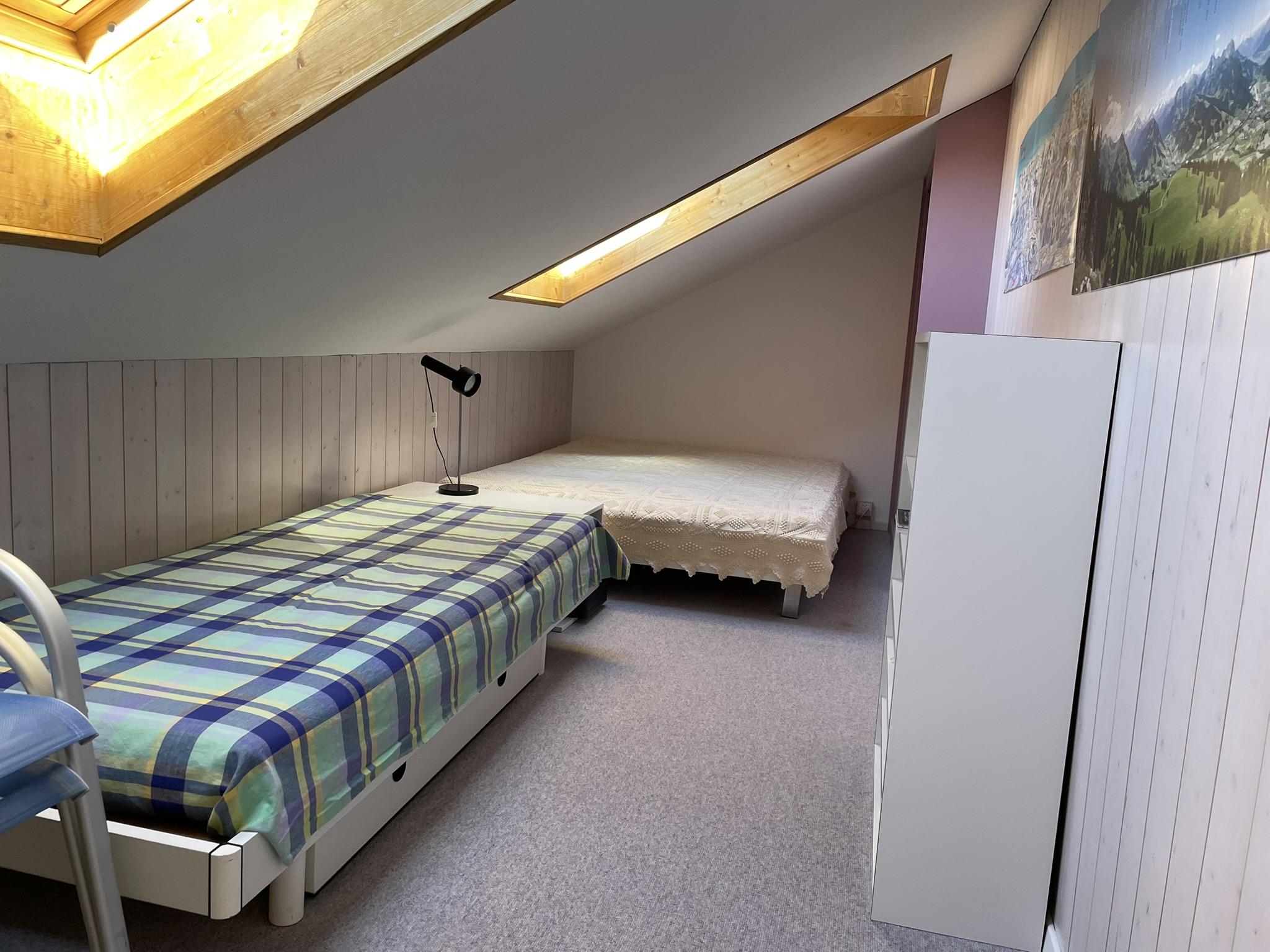 Grosszügige 1,5-Zimmerwohnung (47m2) mit offener Küche (u.a. ausgestattet mit Filterkaffeemaschine, Fondue- und Raclette-Set). Wohnzimmer mit 2 Betten (90x200cm), TV (Flachbildschirm), Radio und Telefon. Nebenzimmer in Dachschräge mit 1 Einzelbett (90x190cm) und 1 Grand Lit (140x200cm). Badezimmer mit Dusche/WC. Gedeckter Holzbalkon. Kinderbett (68x105cm) inkl. Bettwäsche und Kinderhochstuhl vorhanden.