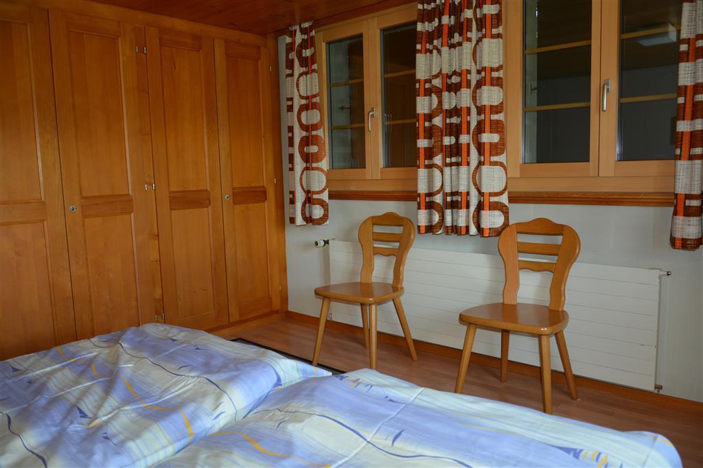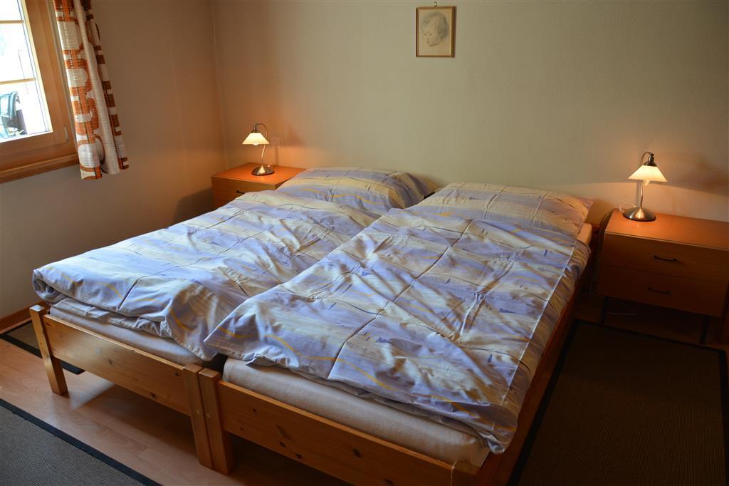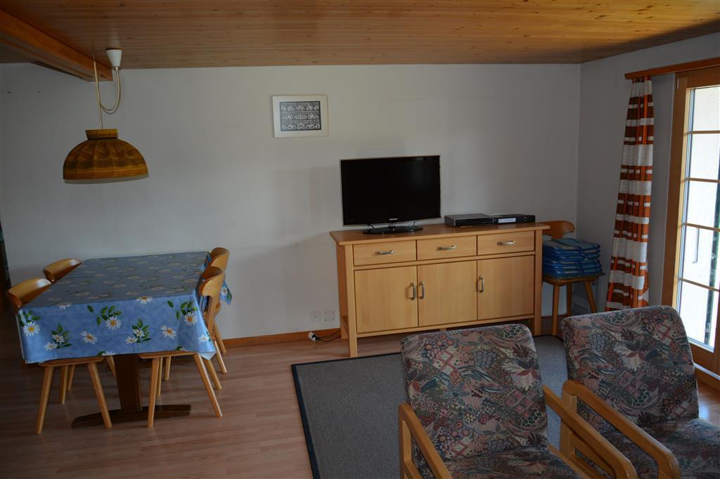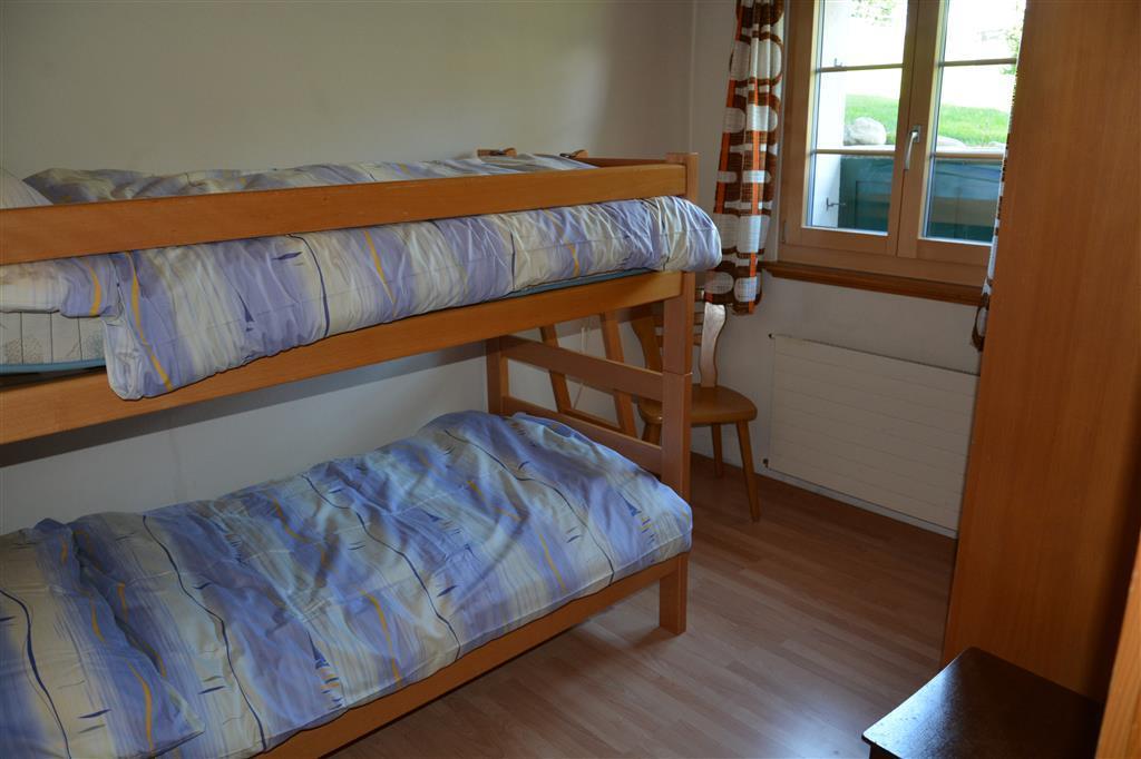 Wohnzimmer mit ausziehbarem Sofa, Satelliten-TV. Wohnküche u. a. ausgestattet mit Esstisch, Filterkaffeemaschine und Fondue-Set. 1 Doppelschlafzimmer (2x90x190cm). 1 Schlafzimmer mit 1 Etagenbett (2x90x190cm). 1 Badezimmer mit Bad/WC.