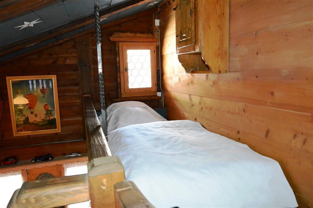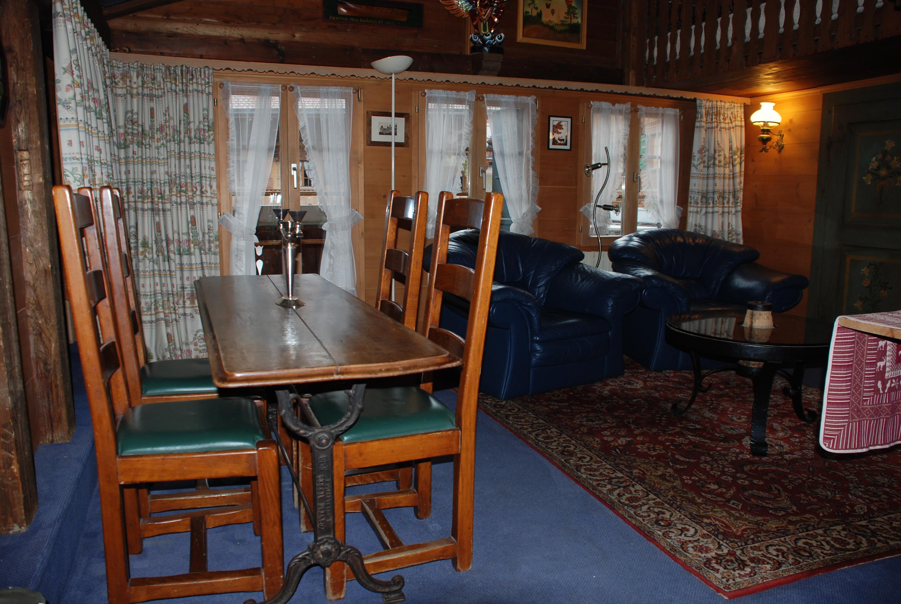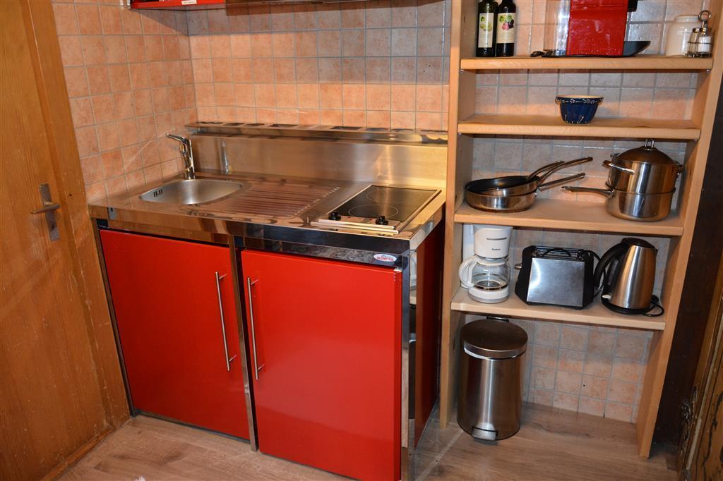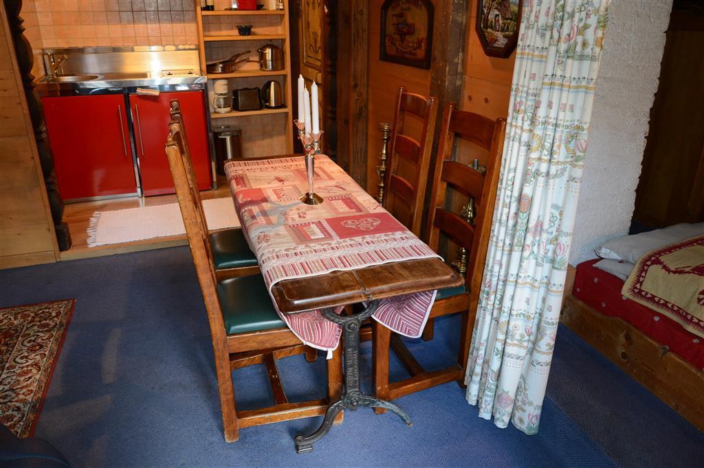 Wohn-/Esszimmer mit 2 Sesseln, Salontisch, Esstisch und Flachbildschirm-TV. WiFi. Kleine offene Küche mit Kitchenette (2 Herdplatten, Kapsel-Kaffeemaschine (Nespresso), Fondue- und Raclette-Set). Ein vom Wohnzimmer mit einem Vorhang abgetrenntes kleines Schlafzimmer in Dachschräge mit Doppelbett (180x200cm), kleinem Schrank und Kommode. 2 Einzelbetten (90x190cm) auf der Galerie (nicht für Kleinkinder geeignet). Eine schmale Klapptreppe ohne Geländer führt auf die Galerie. 1 Badezimmer mit WC und Dusche. Kleiner Balkon mit Gartenmöbeln, Abstellraum für Ski- und Sportgeräte.