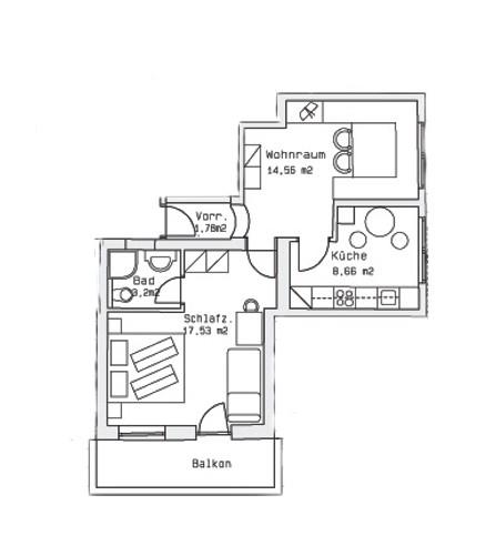 Modern ausgestattetes Appartement mit einem Schlafzimmer, Küche (Geschirrspüler, Backrohr, etc.) Wohnraum mit Doppelausziehcouch, DU/WC, Fön, Telefon, SAT-TV, WLAN, Radio und Balkon. Auch Buchungen mit Frühstück möglich. Größe: 40m²