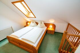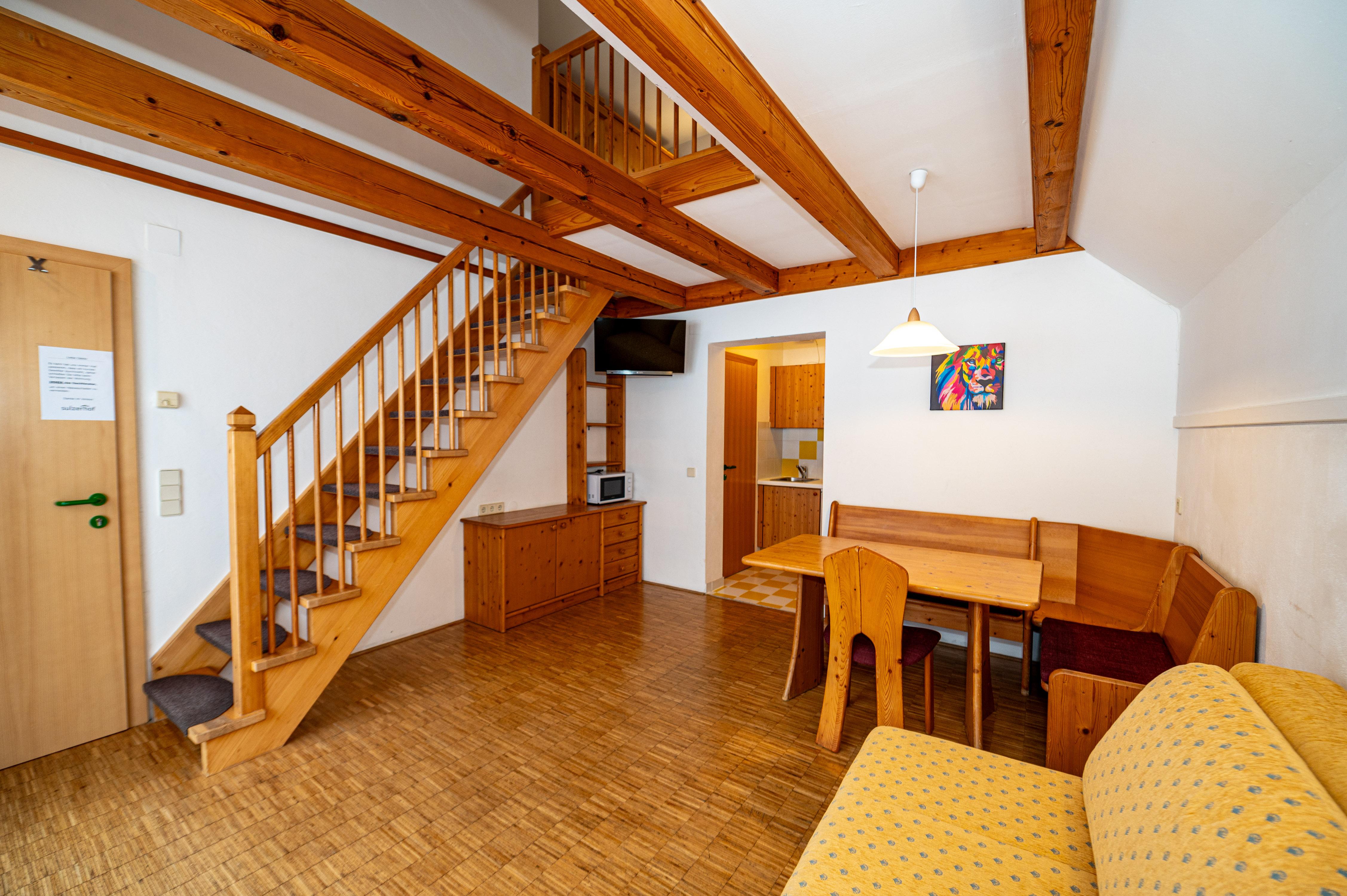 35 m² / Etagenwohnung - Galerieschlafzimmer mit Doppelbett, Wohnraum mit Schlafcouch, Eßecke, Kochnische, Dusche, sep. WC, Sat-TV, Safe, Balkon mit Waldblick