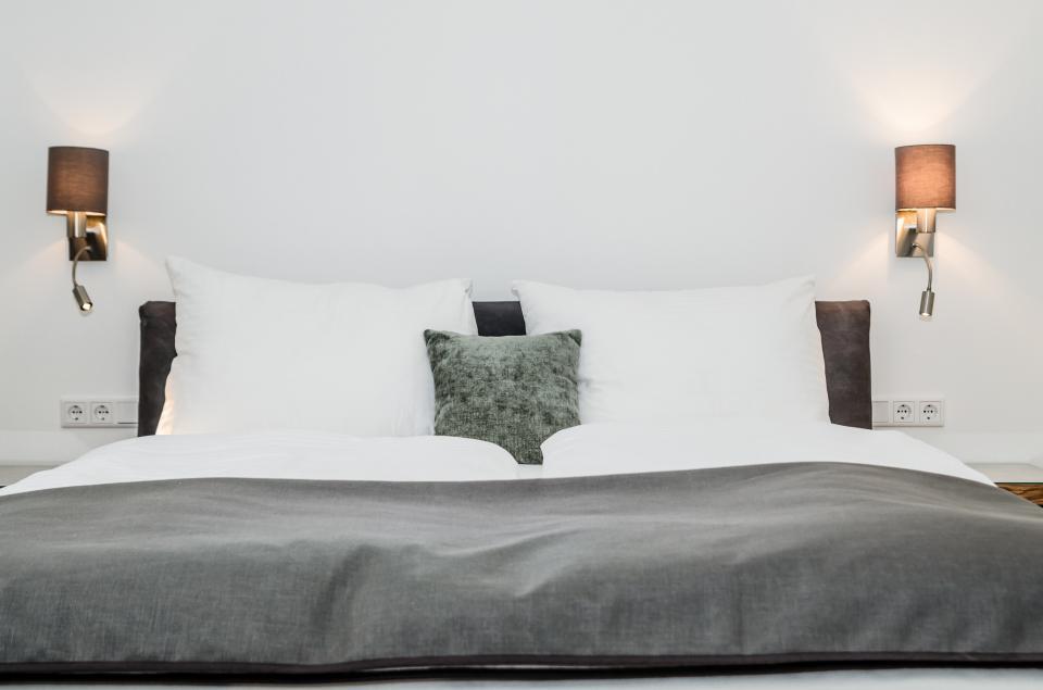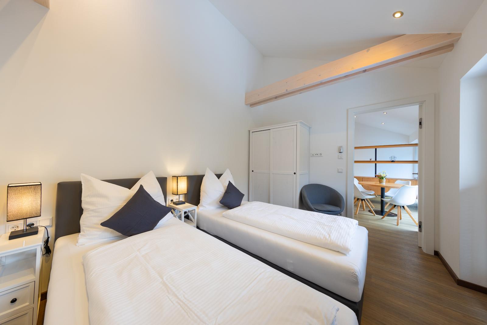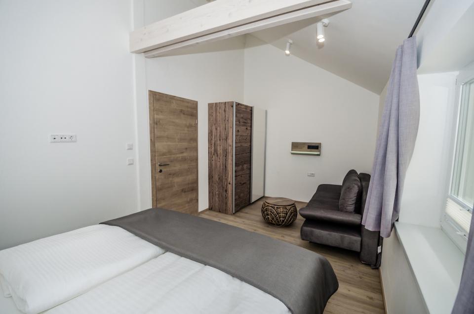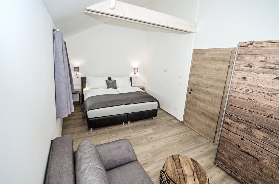 1 Schlafzimmer mit Boxspringbett und Doppelcouch