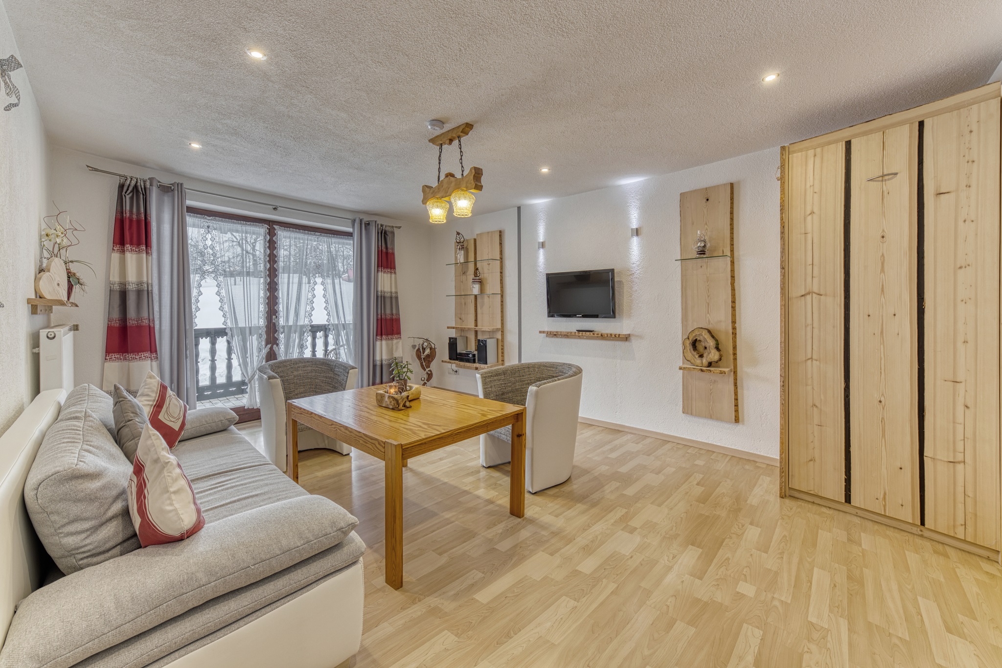Unsere Monteurwohnung verfügt über ein Schlafzimmer mit Doppelbett, Fußende offen, Schrank und Sitzgruppe.