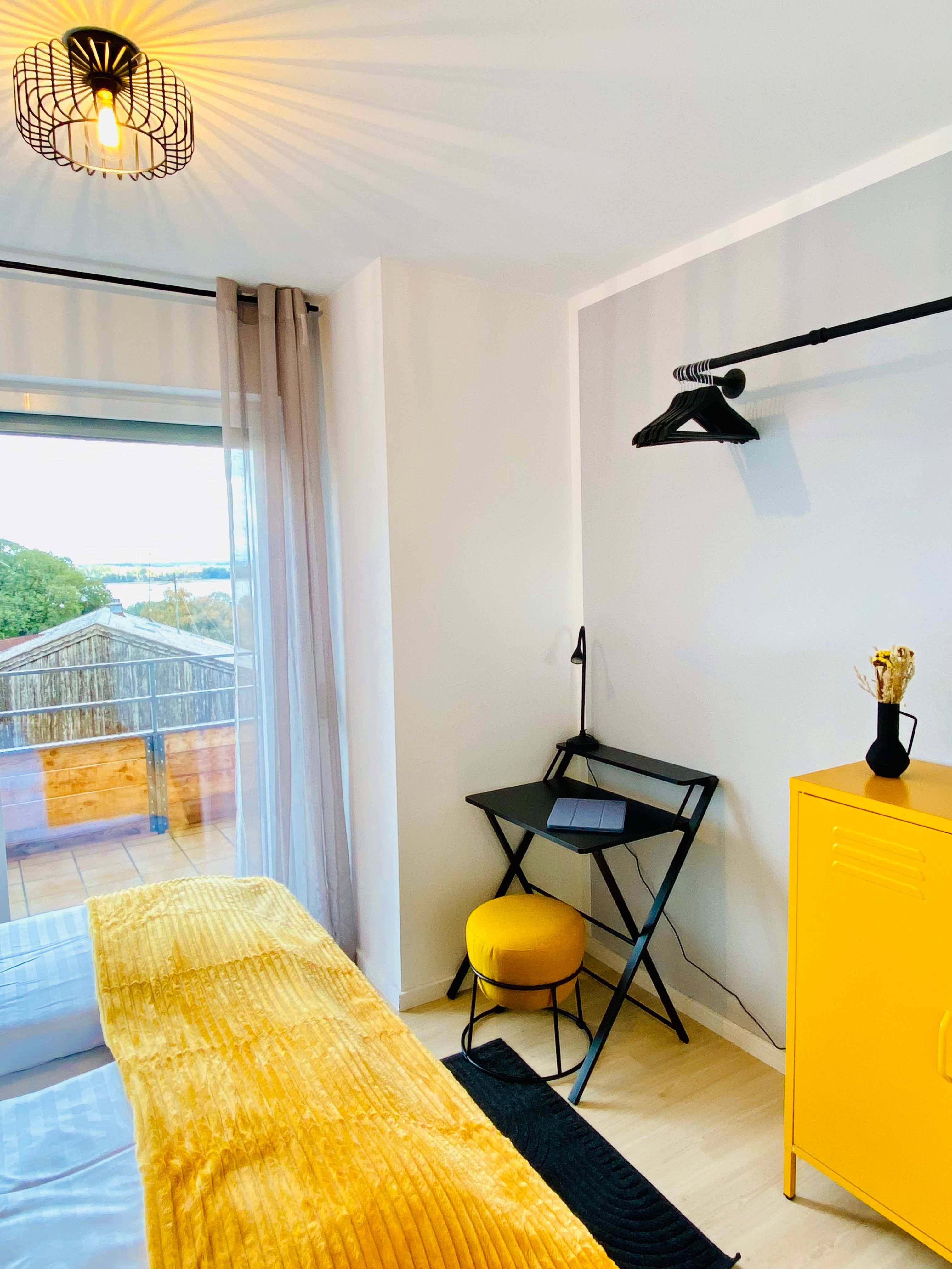 Einen Platz zum Arbeiten mit Schreibtisch und Schreibtischlampe findet man ebenfalls.