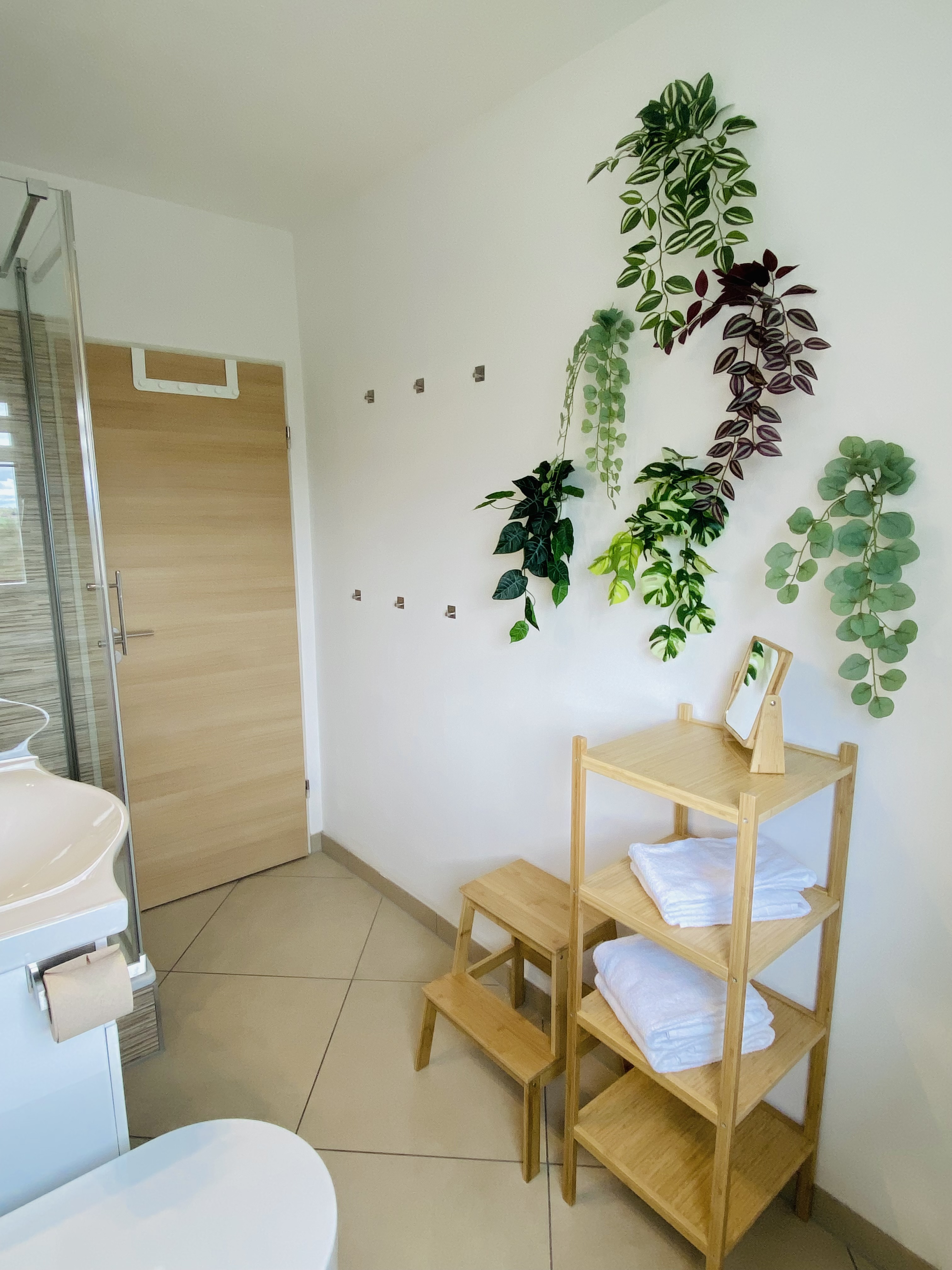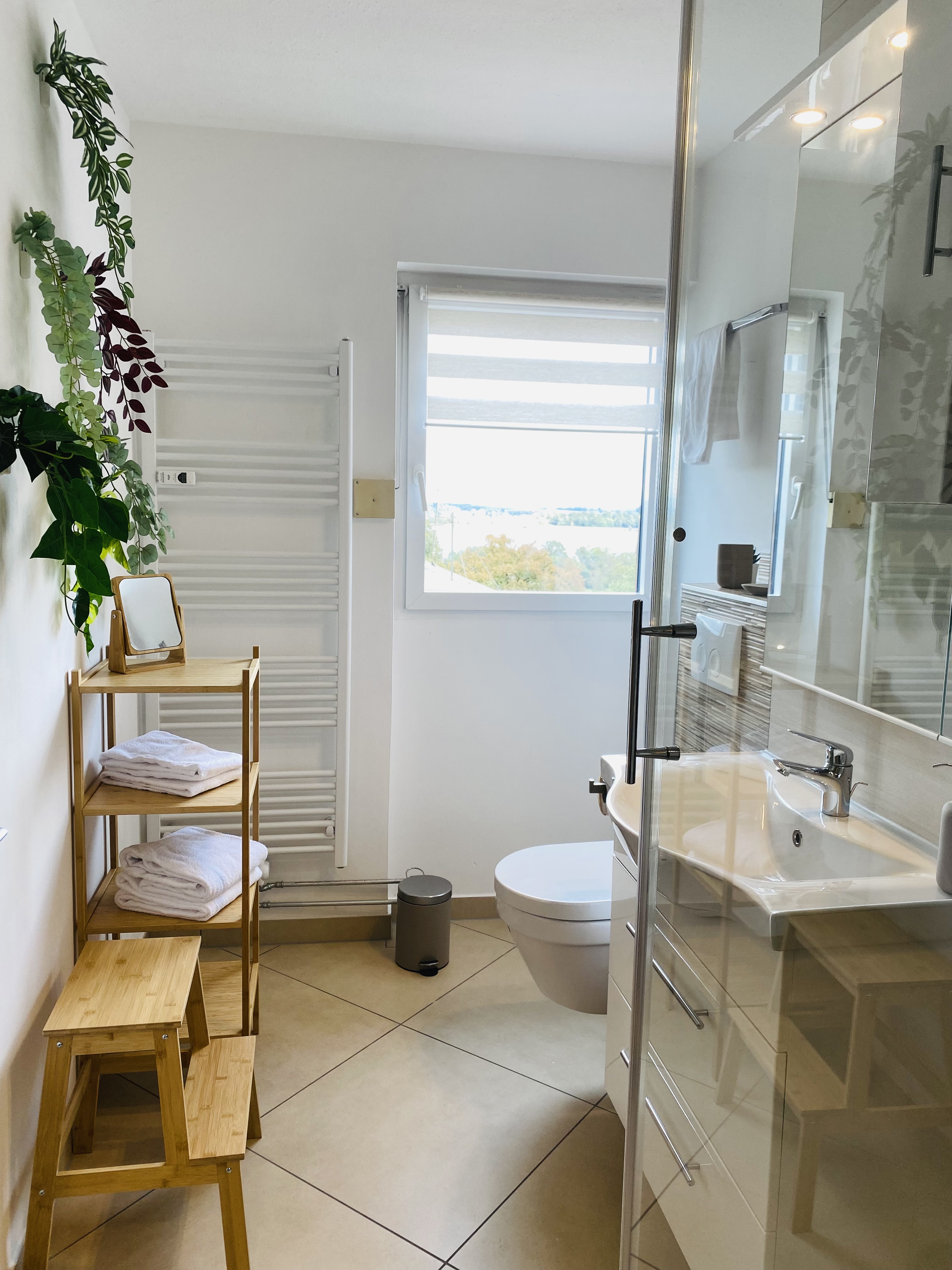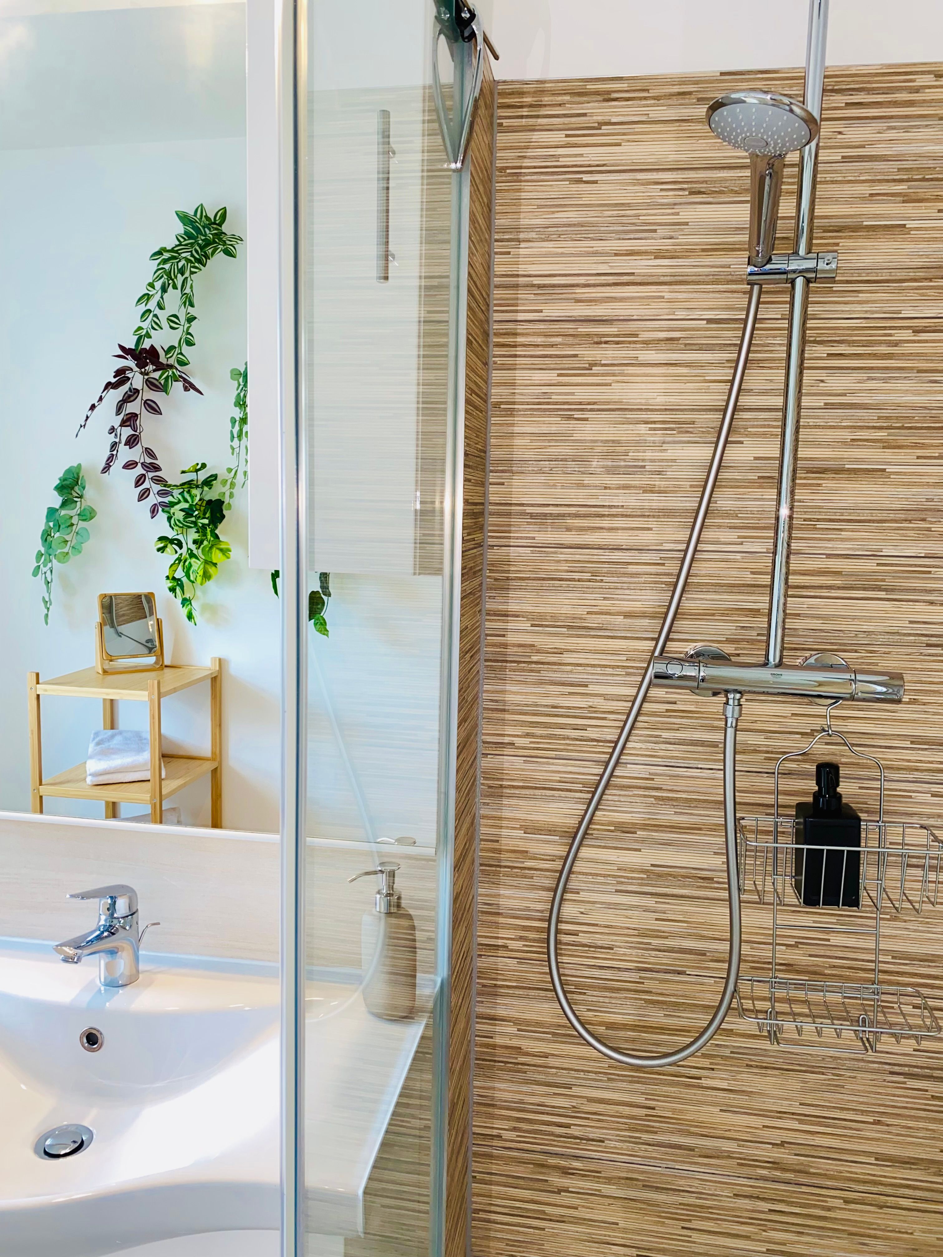 Das Bad bietet eine Dusche und einen Wasch-Trockner.