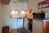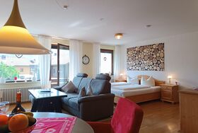 Sonnige 1-Raum Ferienwohnung im 1. OG, 48qm für 1-3 Personen, offene Küche, Bad mit Duschbadewanne, Südbalkon, kostenloser PKW-Stellplatz am Haus, Waschmaschine im Keller, Sauna, kostenloses Hallenbad, WLAN