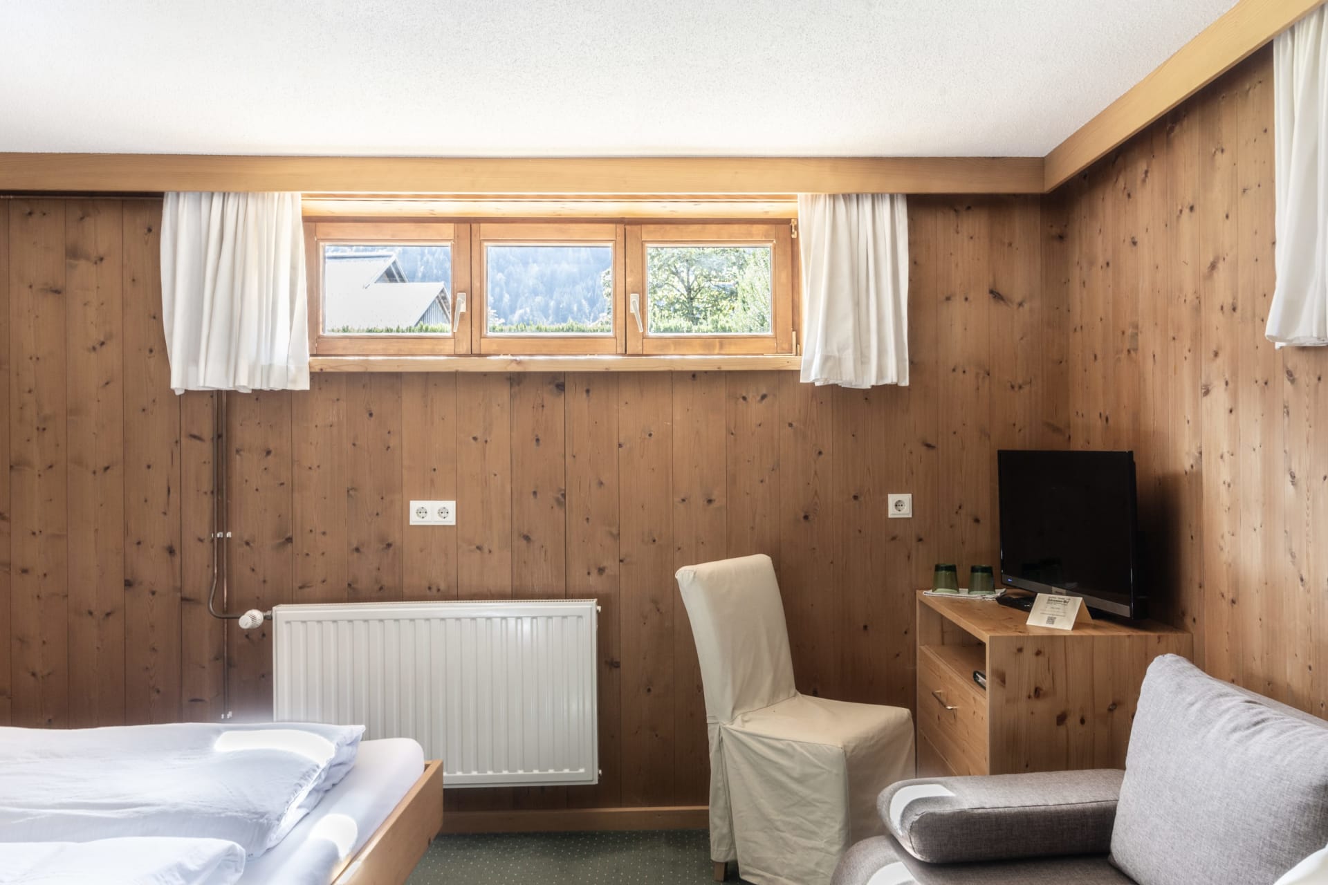 Das Zimmer befindet sich im Untergeschoss des Ferienhauses Zündel und ist mit einem Doppelbett, Badezimmer, TV und Sitzgarnitur ausgestattet. Die Sitzgarnitur kann als Zusatzbett benützt werden. Kein Balkon, kleine Fenster.