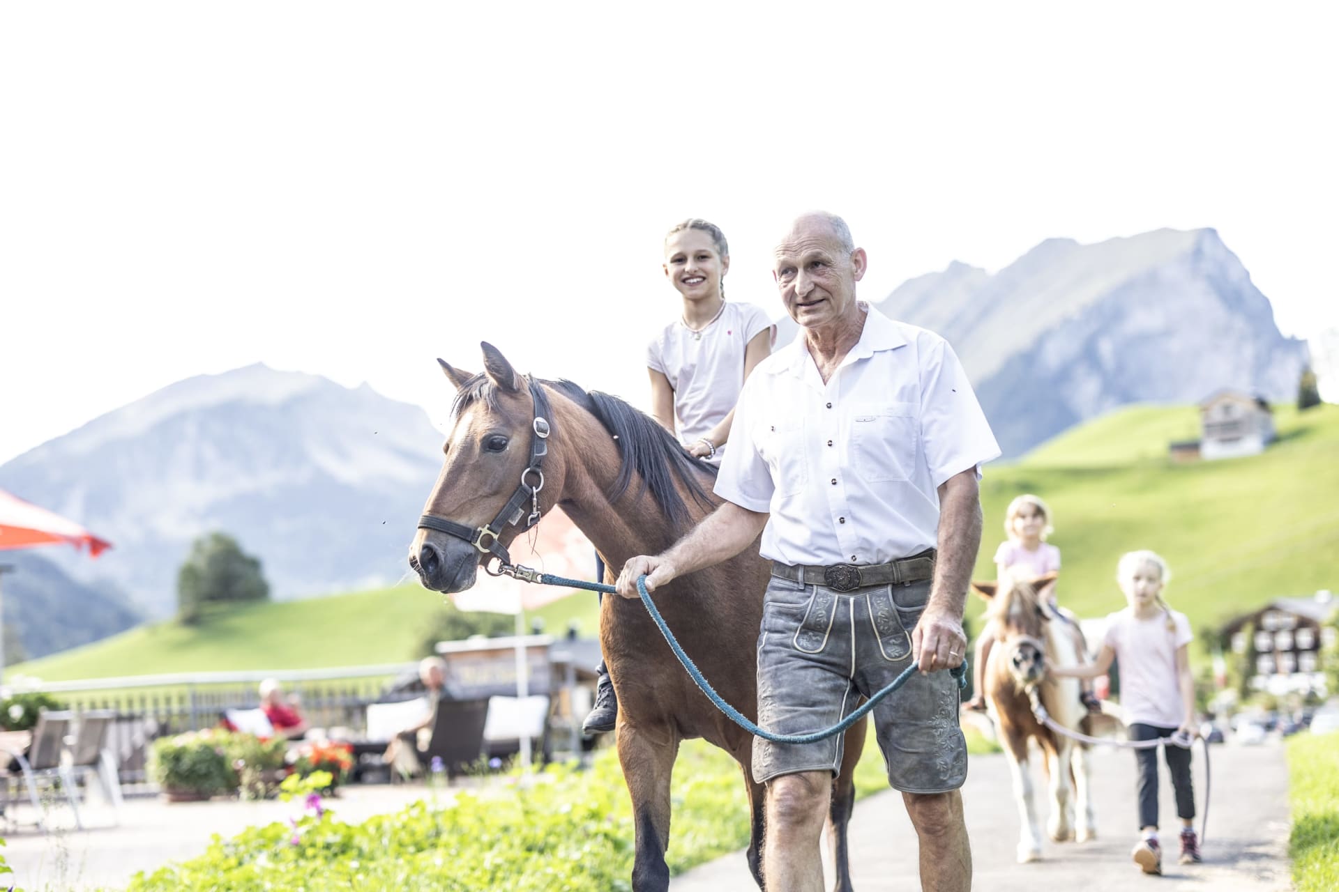 Und am Abend in den Stall zu Kuh, Ziege und Pferd. Schaut zu beim Melken oder füttert unseren Hasen. Wer vom Schnee nicht genug hat startet einen lustige Rodelpartie auf der Skipiste.