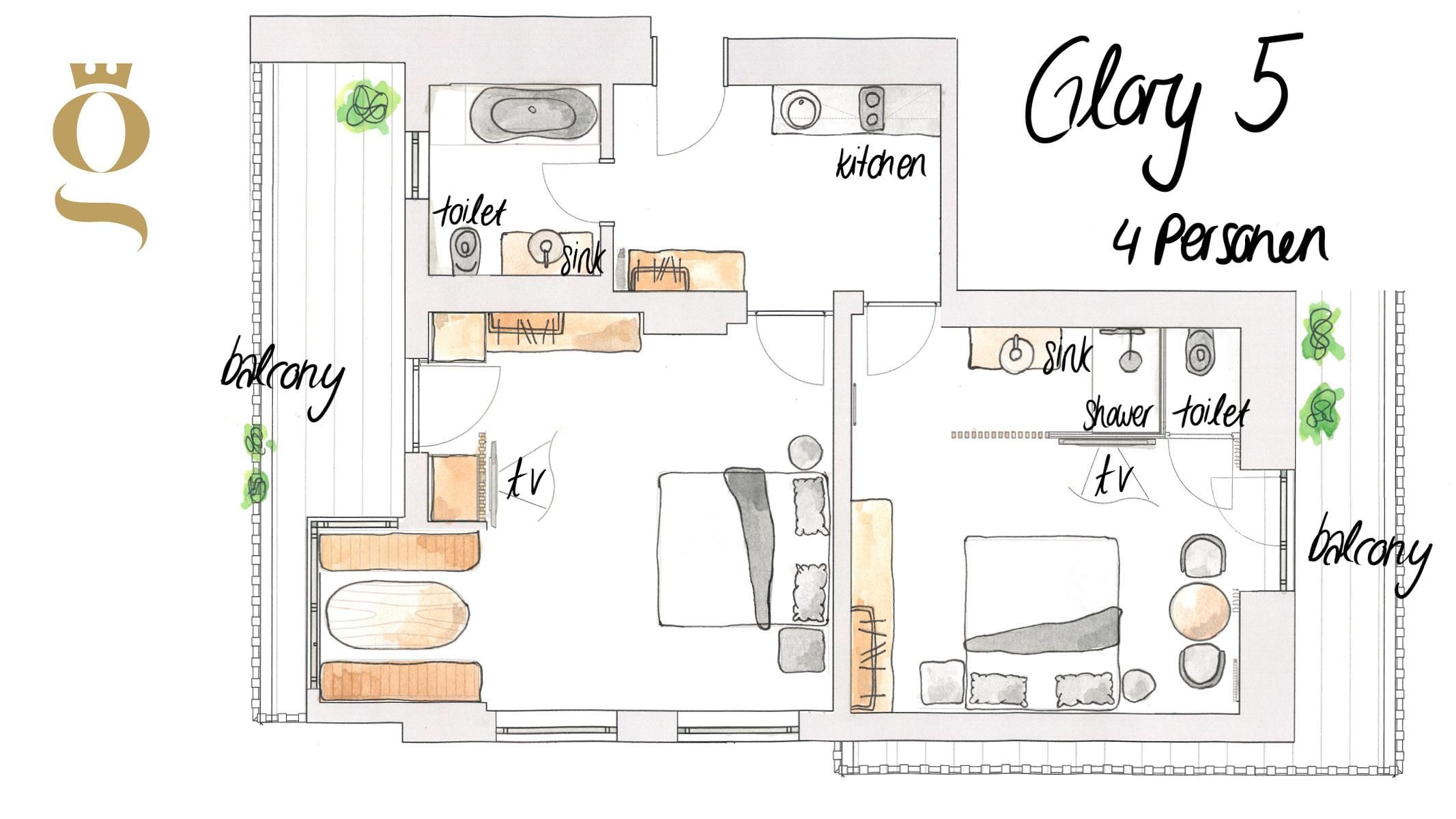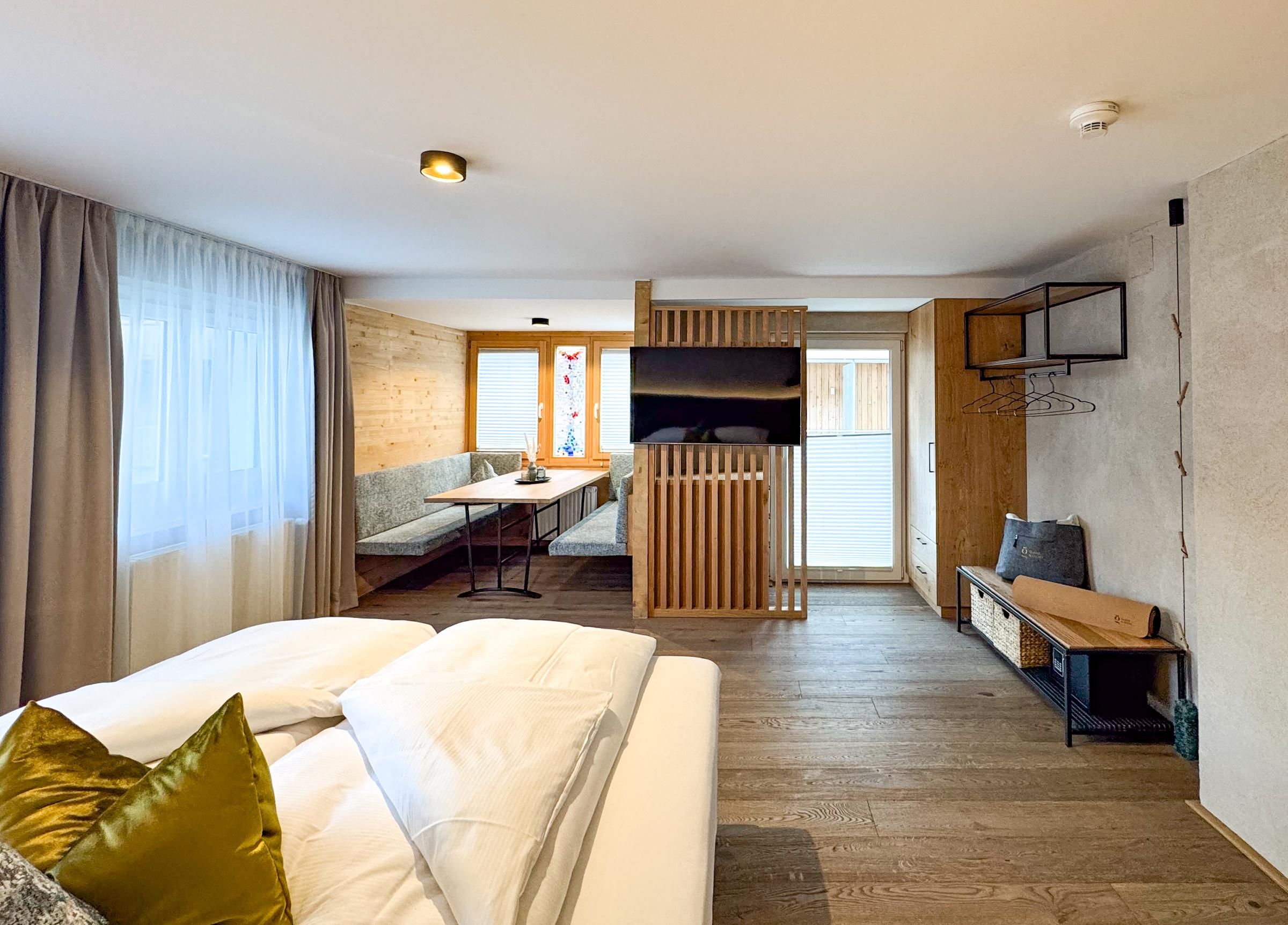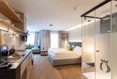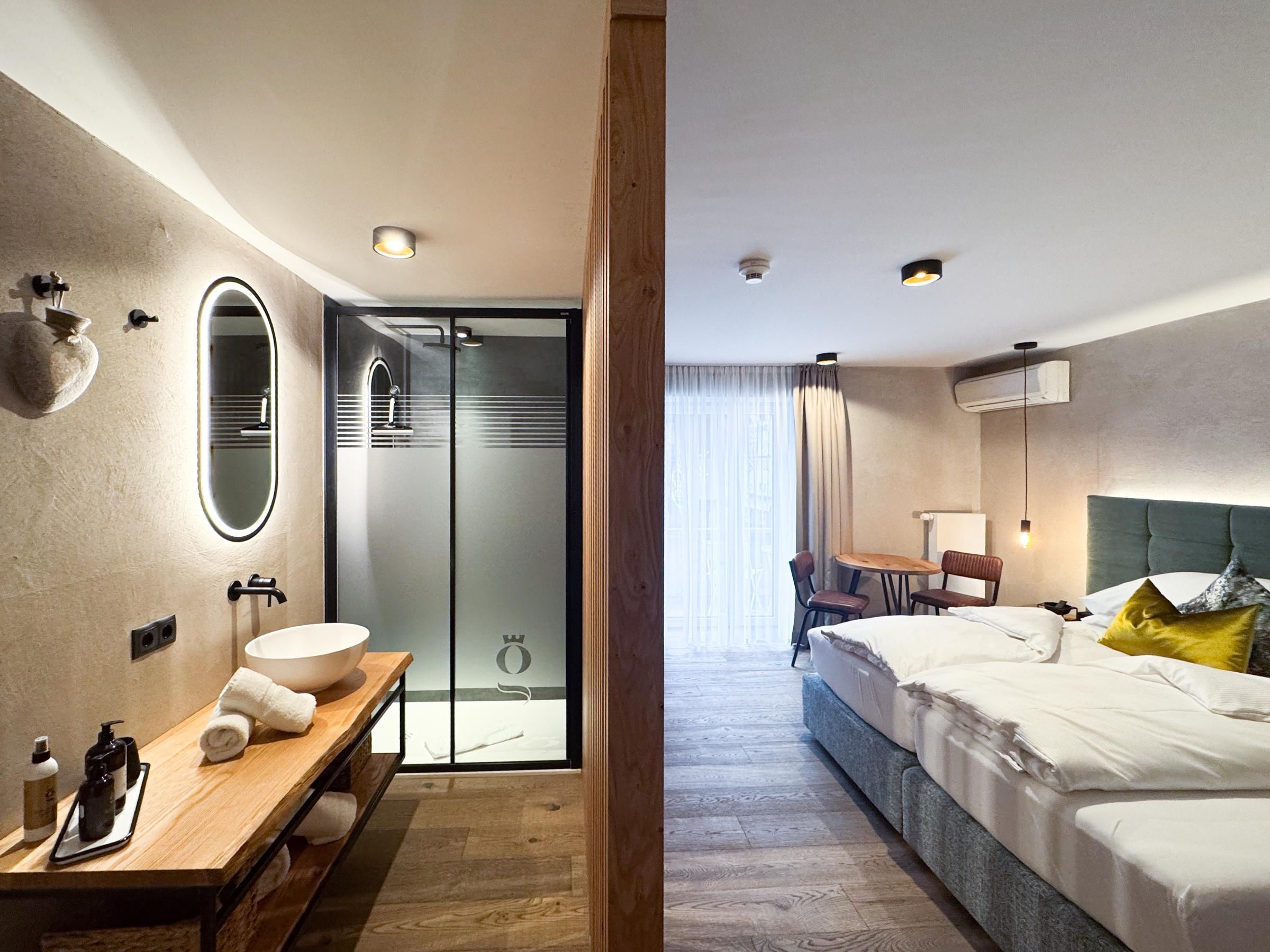 Superior Appartement mit ca. 60 m²: 2 Schlafzimmern mit Boxspringbett als Doppelbett oder 2 Einzelbetten, Sitzbereich mit großem Tisch und Balkon bei beiden Räumen; 2 separate Badezimmer, eines mit Regendusche, das andere mit Badewannendusche, WC, Dyson Fön, Kosmetikspiegel, Glanz & Glory Pflegeprodukte; komplett ausgestattete Küche mit Geschirrspülmaschine, Mikrowelle mit Backfunktion, Kühlschrank, Kochfeld, Jura-Kaffeemaschine, Küchenausstattung uvm.; Extras: Wärmflasche, Rucksack für Tagesausflüge, Yogamatte, Marshall Lautsprecher, TV, möblierter Balkon, Wellnesstasche mit Bademantel