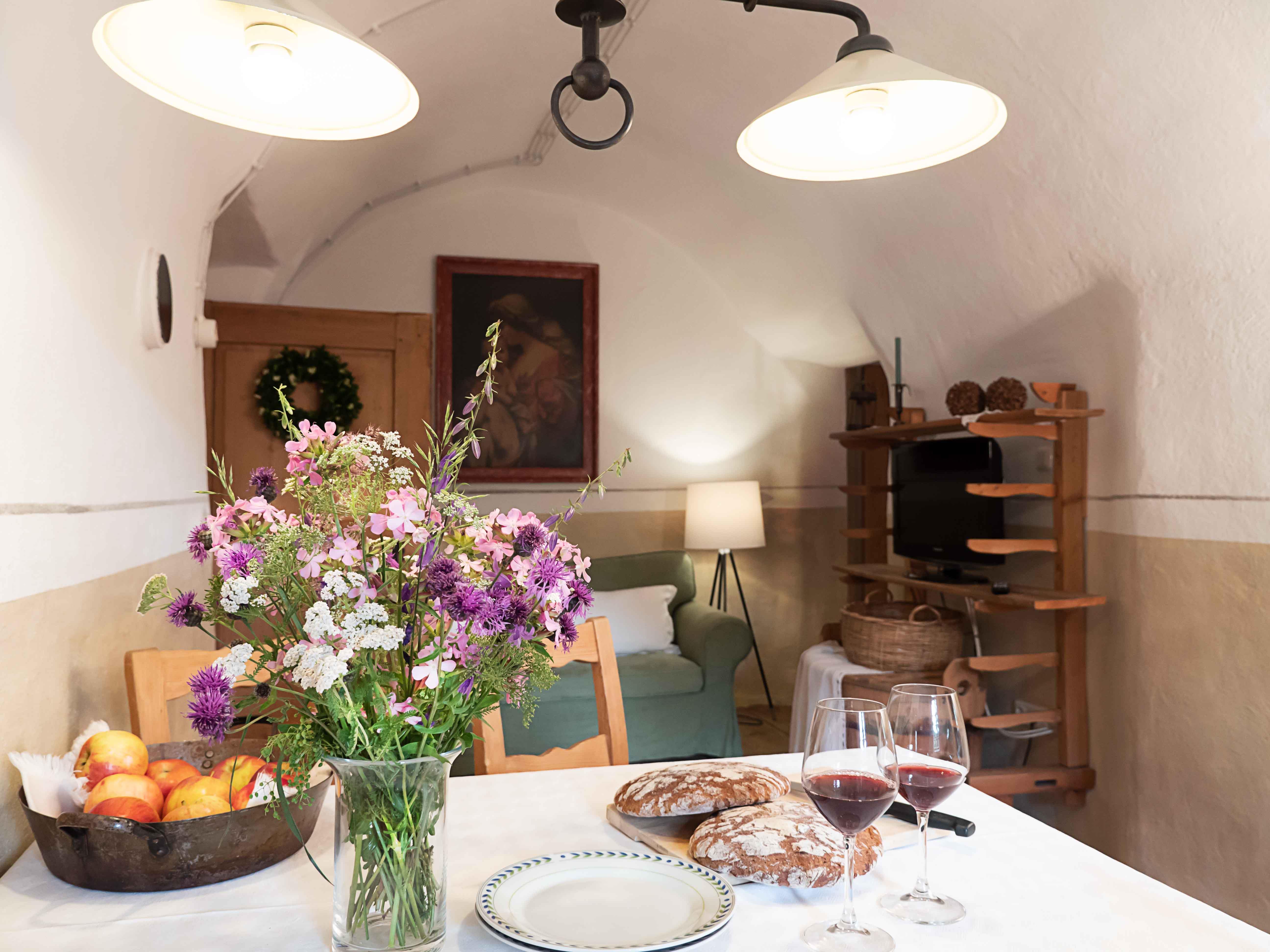 Mehr als zwei Jahrhunderte lang war der „Strickenmacher-Hof“ die Heimstätte einer Großfamilie, die aus mindesten zwölf Personen bestand. Um die große Zahl an hungrigen Mündern täglich satt zu bekommen, wurden Gemüse, Kartoffeln und Getreide selbst angebaut. Einmal im Monat wurde Brot auf Vorrat gebacken. In unserem Appartement „Brotkammer“ befinden sich noch Teile eines Brotrahmens, in dem dieses dann gelagert wurde. Sein Duft begleitet Sie noch heute in diesem gemütlichen Appartement - im Luxus des Einfachen!