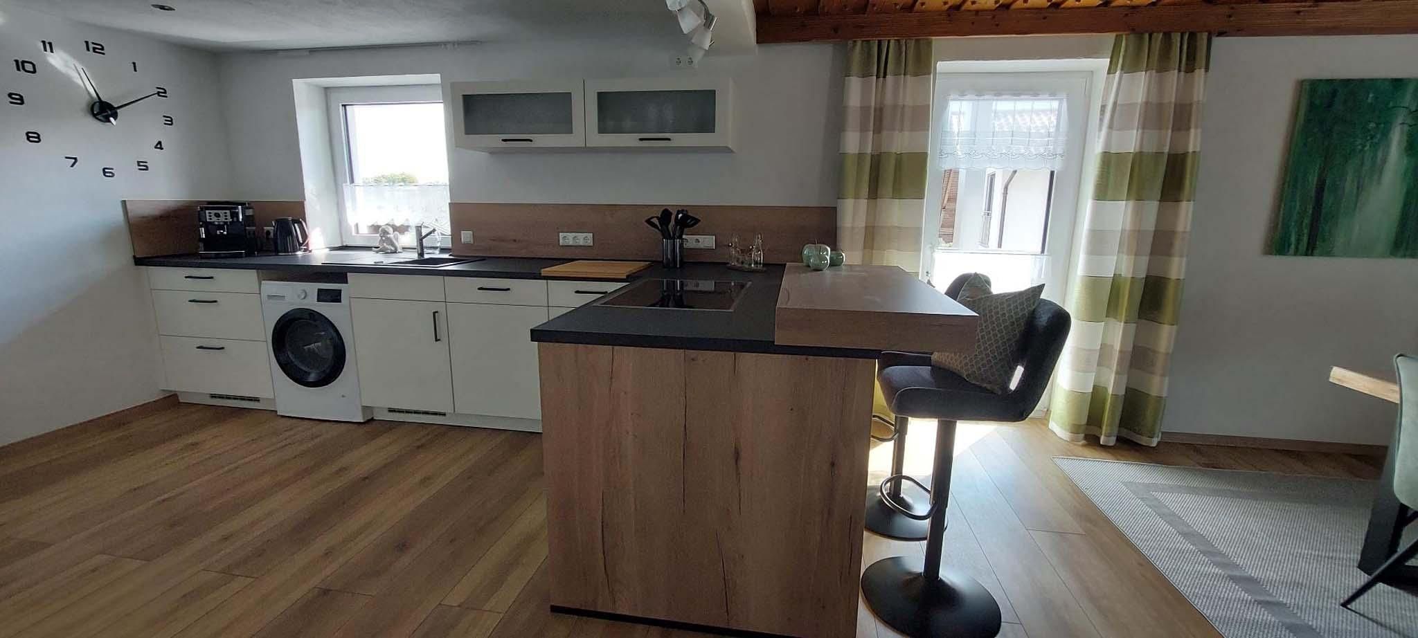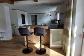 Das gemütliche Wohnzimmer mit großer Couch und Flachbildschirm Sat-TV lädt zum Verweilen ein. Der komplett ausgestattete offene Küchenbereich mit Tresen und Barhocker, Geschirrspüler, Kühlschrank, Gefrierschrank, E-Herd, Backofen, Mikrowelle, Wasserkocher, Kaffeevollautomat und Toaster lässt keine Wünsche offen.