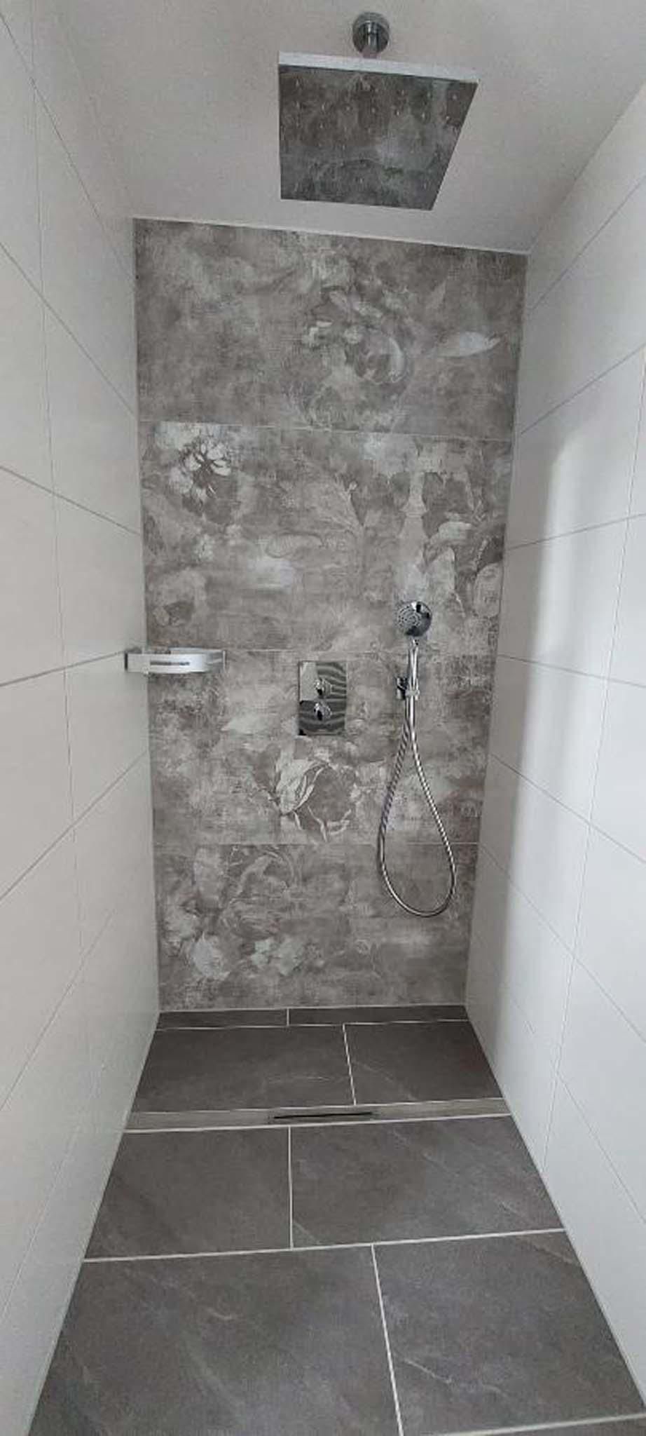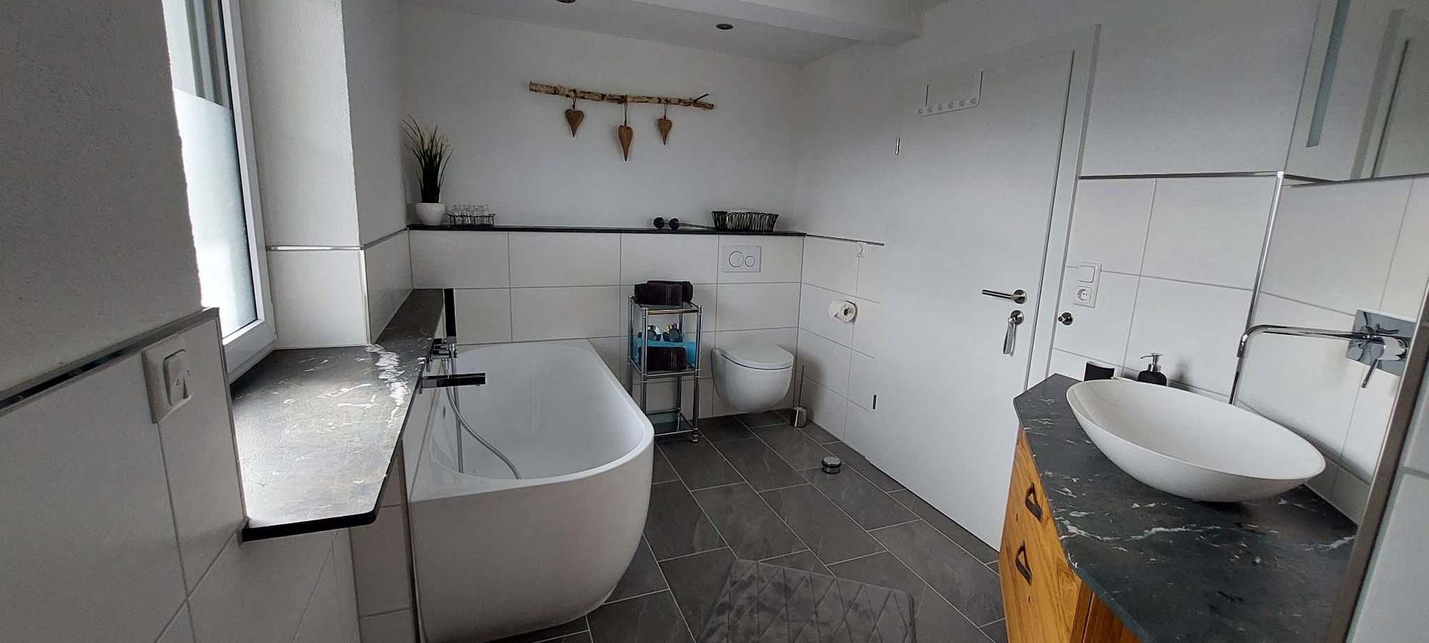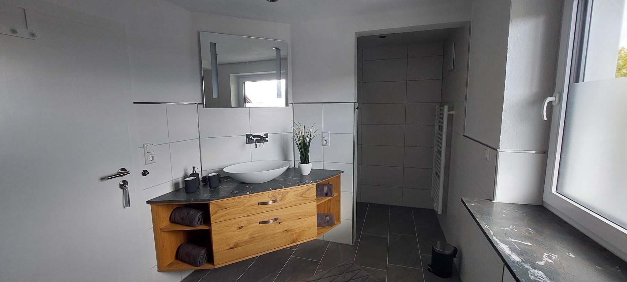 Das geräumige Badezimmer mit ebenerdiger Dusche und Regenbrause, Badewanne, großem Spiegel, Hand- und Badetücher runden das Gesamtbild ab.
