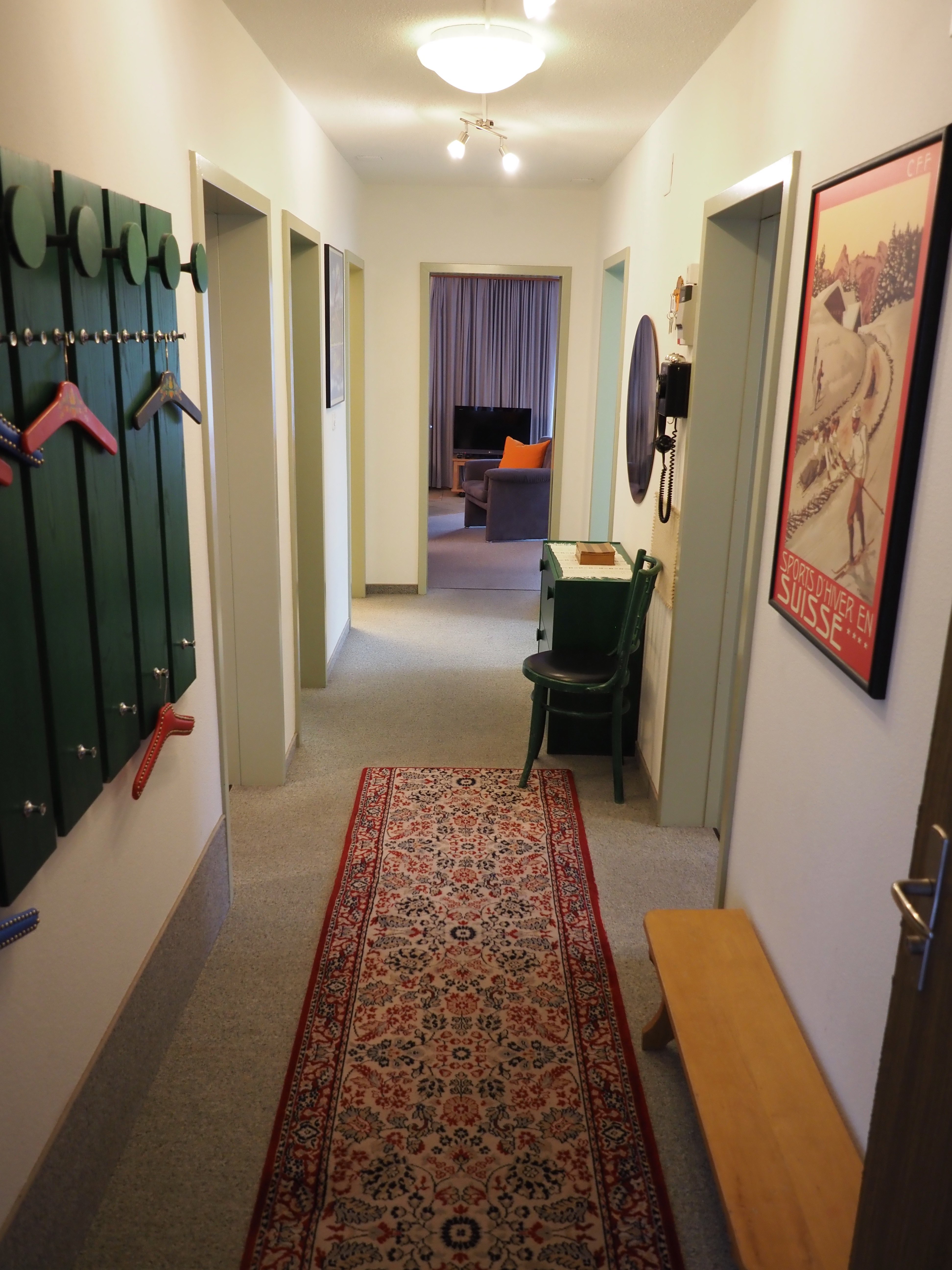 Die grosszügige (100 m2) und vollständig ausgestattete Wohnung hat einen ebenerdigen Eingang. Liftanlagen, Restaurants, Shopping sind in 5-10 Minuten zu Fuss erreichbar. Ihr Parkplatz ist direkt vor dem Haus und ist mit einer Ladestation für elektrische Autos ausgestattet. Wir bitten Sie uns mitzuteilen, falls Sie die Ladestation benutzen möchten. In der Wohnung gibt es ein Kinderbett und einen Kinderstuhl (Tripptrapp) auf Anfrage. Auf dem grossen Südbalkon stehen Gartenmöbel zur Benützung bereit. Zudem ist der Zugang zum grossen Garten möglich. Im Keller befindet sich ein geheizter Skiraum, der gerne benützt werden darf.