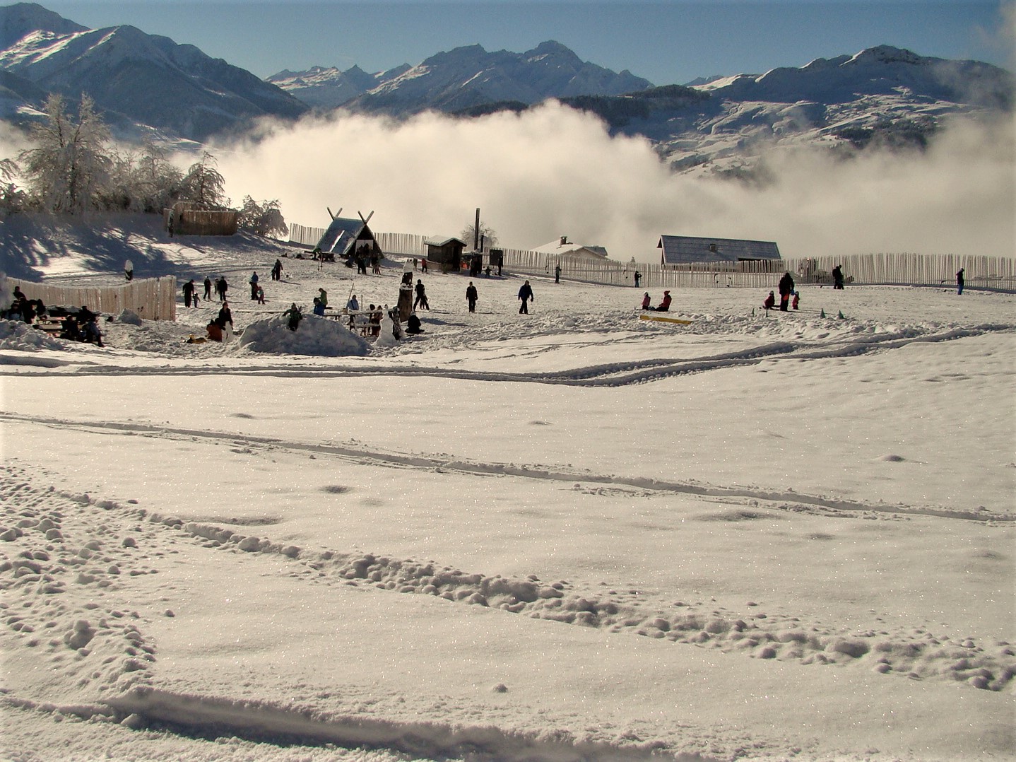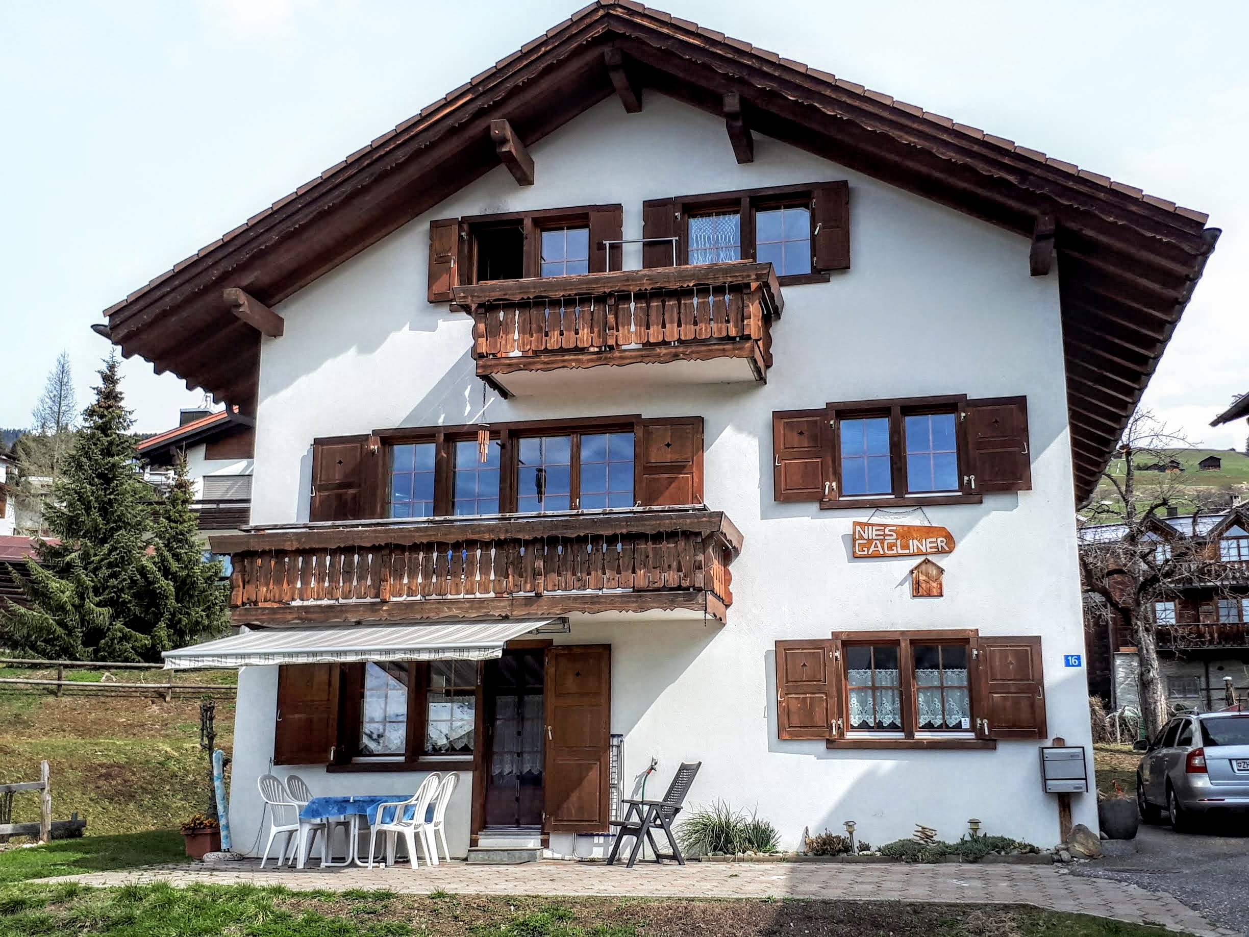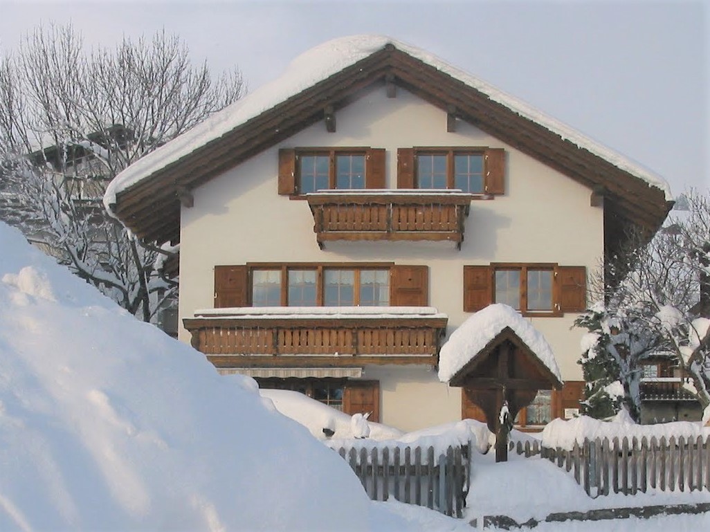 Das Apartment liegt im Erdgeschoss und verfügt über eine grosszügige Terrasse mit Ausblick auf die atemberaubenden Bündner Berge. Die Terrasse ist mit einem Tisch und mehreren Stühlen ausgestattet. Zudem bietet die Terrassentür einen direkten Zugang vom Parkplatz zur r Skibus hält direkt vor dem Haus.