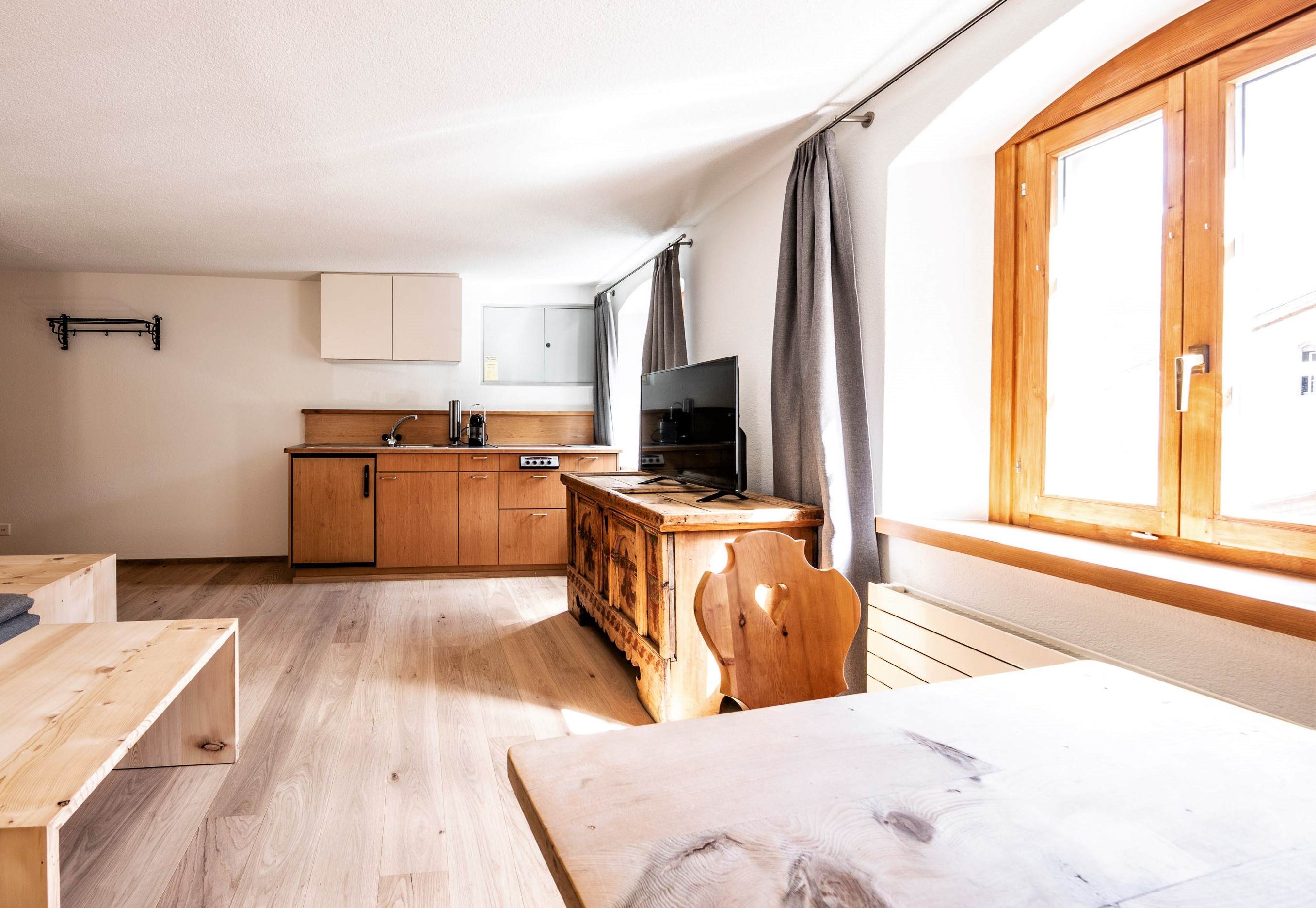 Das traditionsreiche Haus wurde 2018 komplett renoviert. Dabei wurde die historische Substanz weitgehend erhalten und die Räume sind mit vielen Antiquitäten eingerichtet. Alle Zimmer verfügen über Dusche/WC, Sat-TV, Radio. Die Appartements 45 bis 70 m2 gross und haben eine komplett ausgestattete Küche, Wohn-, Bade- und Schlafzimmer. Zudem ist das gesamte Haus Barrierefrei. Auf dem Frühstücksbuffet finden Sie regionale Produkte wie Bio-Käse, Honig oder hausgemachte Marmeladen. Im Café-Bistro servieren wir kleine Bündner Gerichte oder hausgemachte Pralinés.