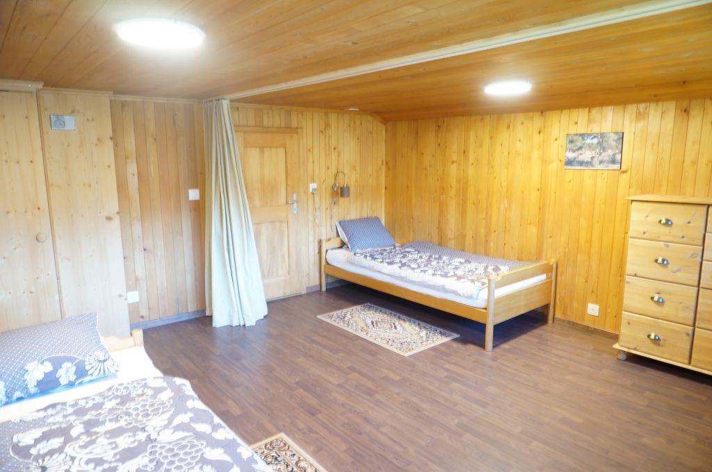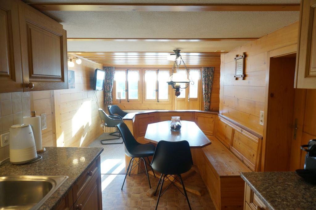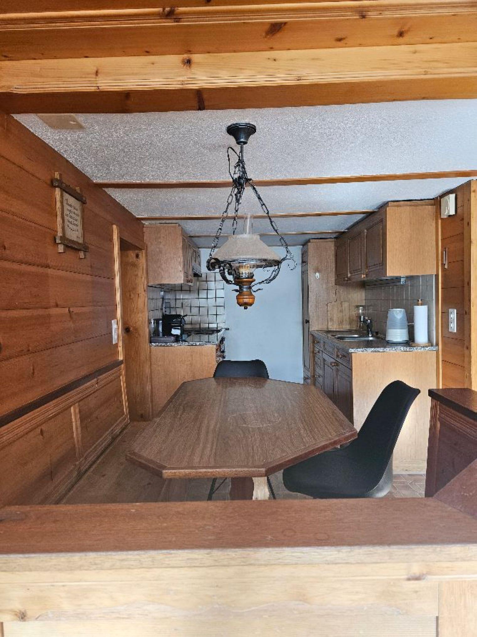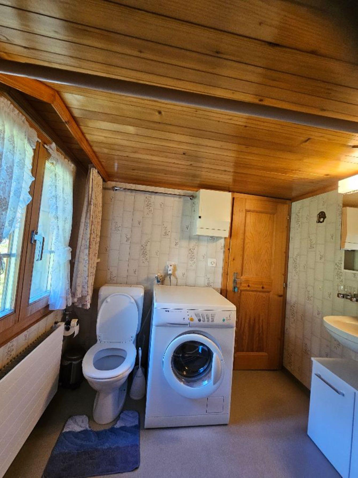 Wohn-/ Esszimmer mit Küche (u.a. ausgestattet mit Holzofen, Kochfeld mit 4 Herdplatten, Backofen, Kühlschrank mit Gefrierfach, Geschirrspüler, Kapsel-Kaffeemaschine (Nespresso) sowie Fondue- und Raclette-Set), Esstisch mit 4 Stühlen, gemütliche Sitzecke mit TV/Radio und Zugang zum Balkon. 1 Badezimmer mit Dachschräge, Badewanne/WC und Waschmaschine. 1 Schlafzimmer mit Grand Lit (160x200cm), grosser Schrank. 1 weiteres Zimmer mit zwei Einzelbetten (2x90x200cm) und Kleiderschrank. WiFi. Die Raumhöhe beträgt zwischen 1.88 m bis 1.95 m.