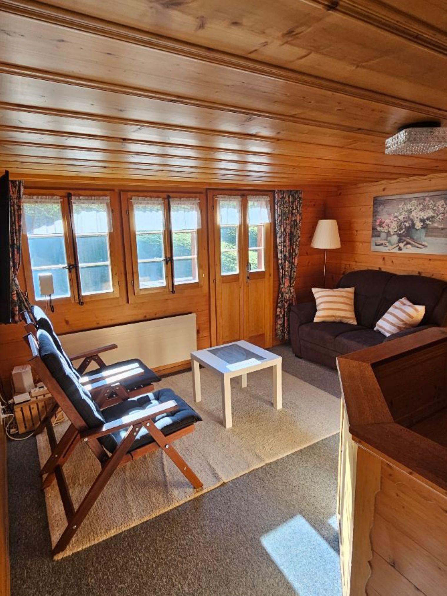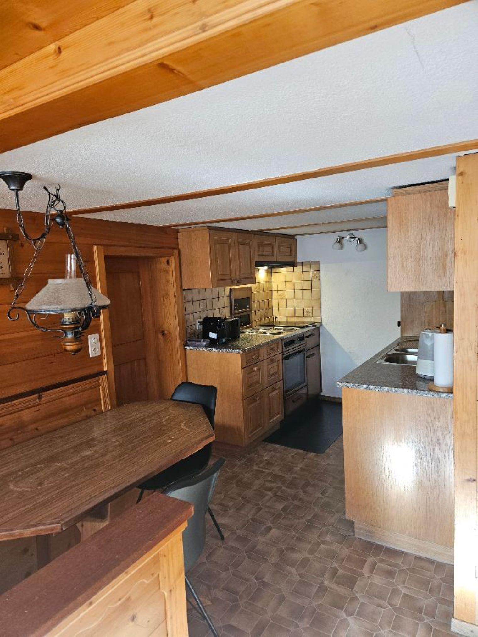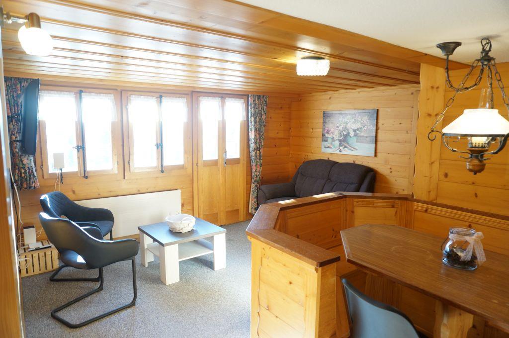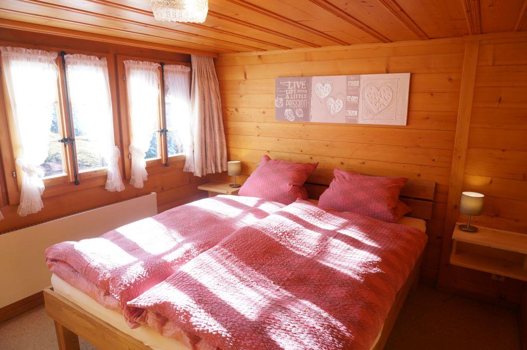 Wohn-/ Esszimmer mit Küche (u.a. ausgestattet mit Holzofen, Kochfeld mit 4 Herdplatten, Backofen, Kühlschrank mit Gefrierfach, Geschirrspüler, Kapsel-Kaffeemaschine (Nespresso) sowie Fondue- und Raclette-Set), Esstisch mit 4 Stühlen, gemütliche Sitzecke mit TV/Radio und Zugang zum Balkon. 1 Badezimmer mit Dachschräge, Badewanne/WC und Waschmaschine. 1 Schlafzimmer mit Grand Lit (160x200cm), grosser Schrank. 1 weiteres Zimmer mit zwei Einzelbetten (2x90x200cm) und Kleiderschrank. WiFi. Die Raumhöhe beträgt zwischen 1.88 m bis 1.95 m.