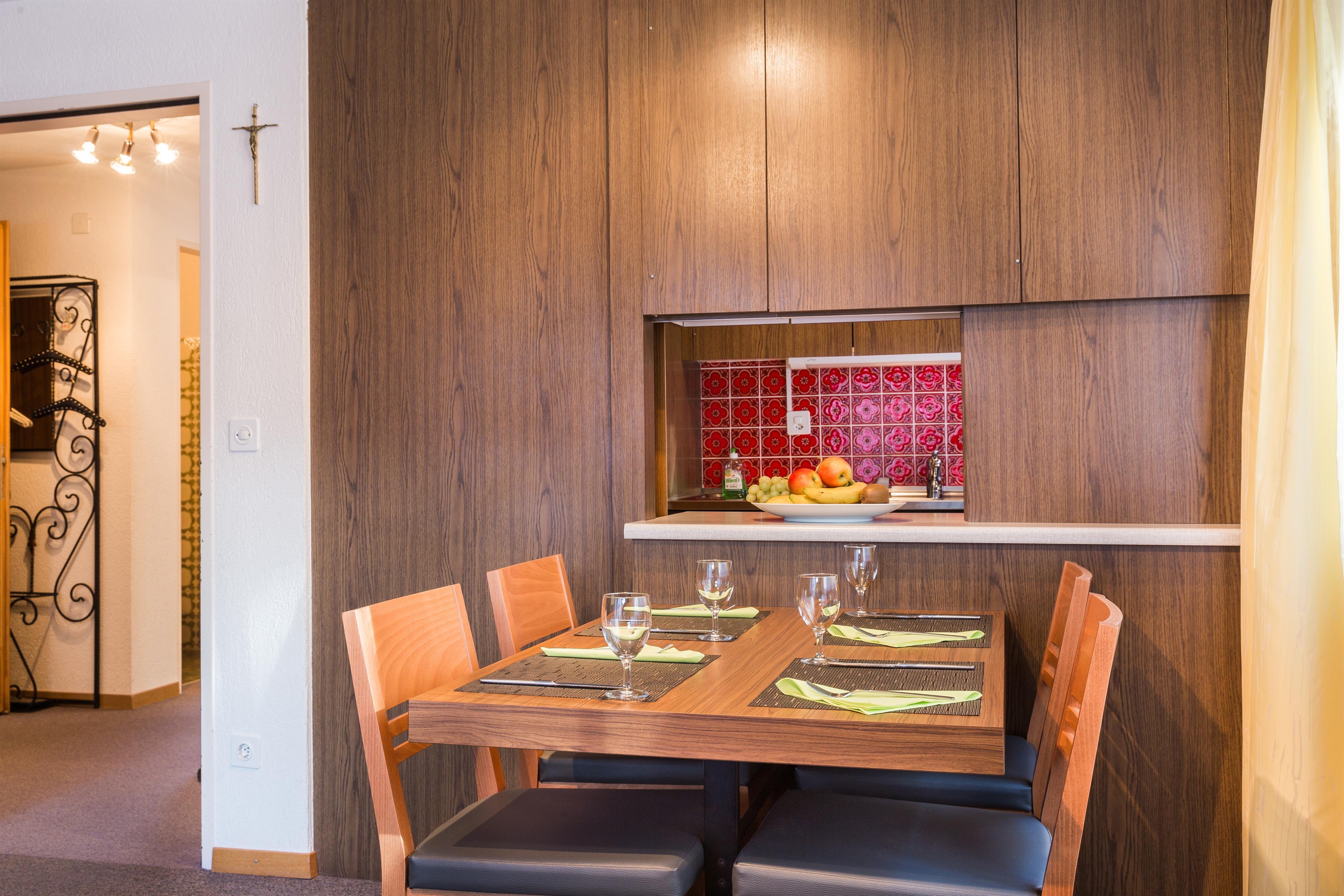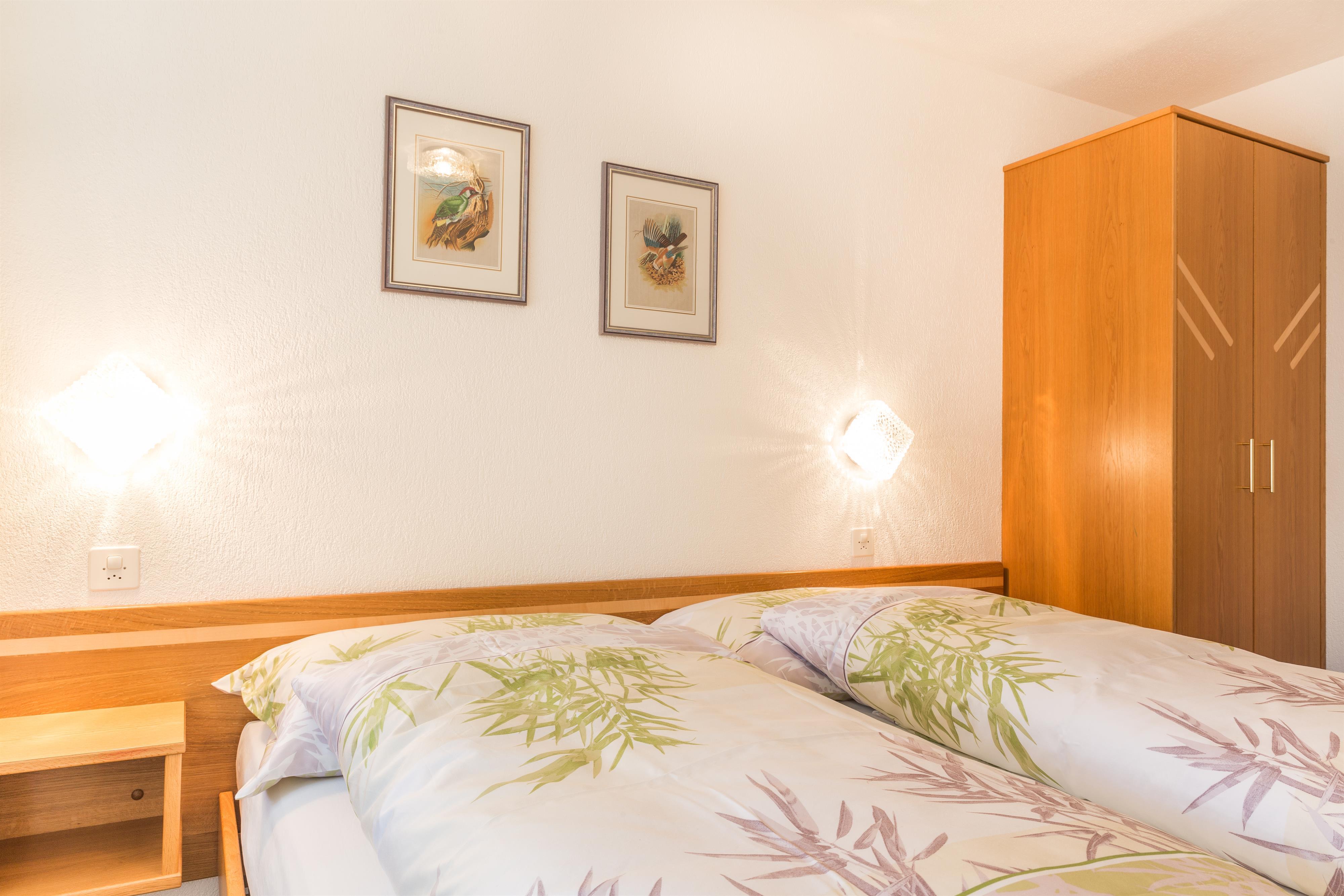 Gepflegte 3-Zimmerwohnung, 55 m2, 2-5 Personen, im 1. Stock, bestehend aus Wohn-/Esszimmer mit 1 Wandklappbett, 2 Doppel-Schlafzimmer, Küche mit Geschirrspüler, Balkon, Radio, TV, Bett-, Frottier- und Küchenwäsche vorhanden, Gratis-WLAN.