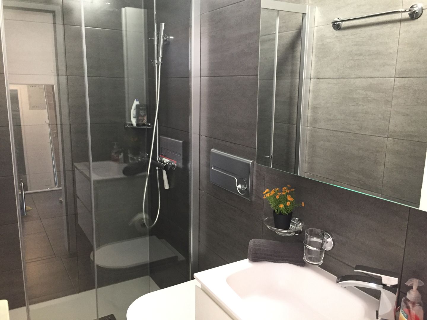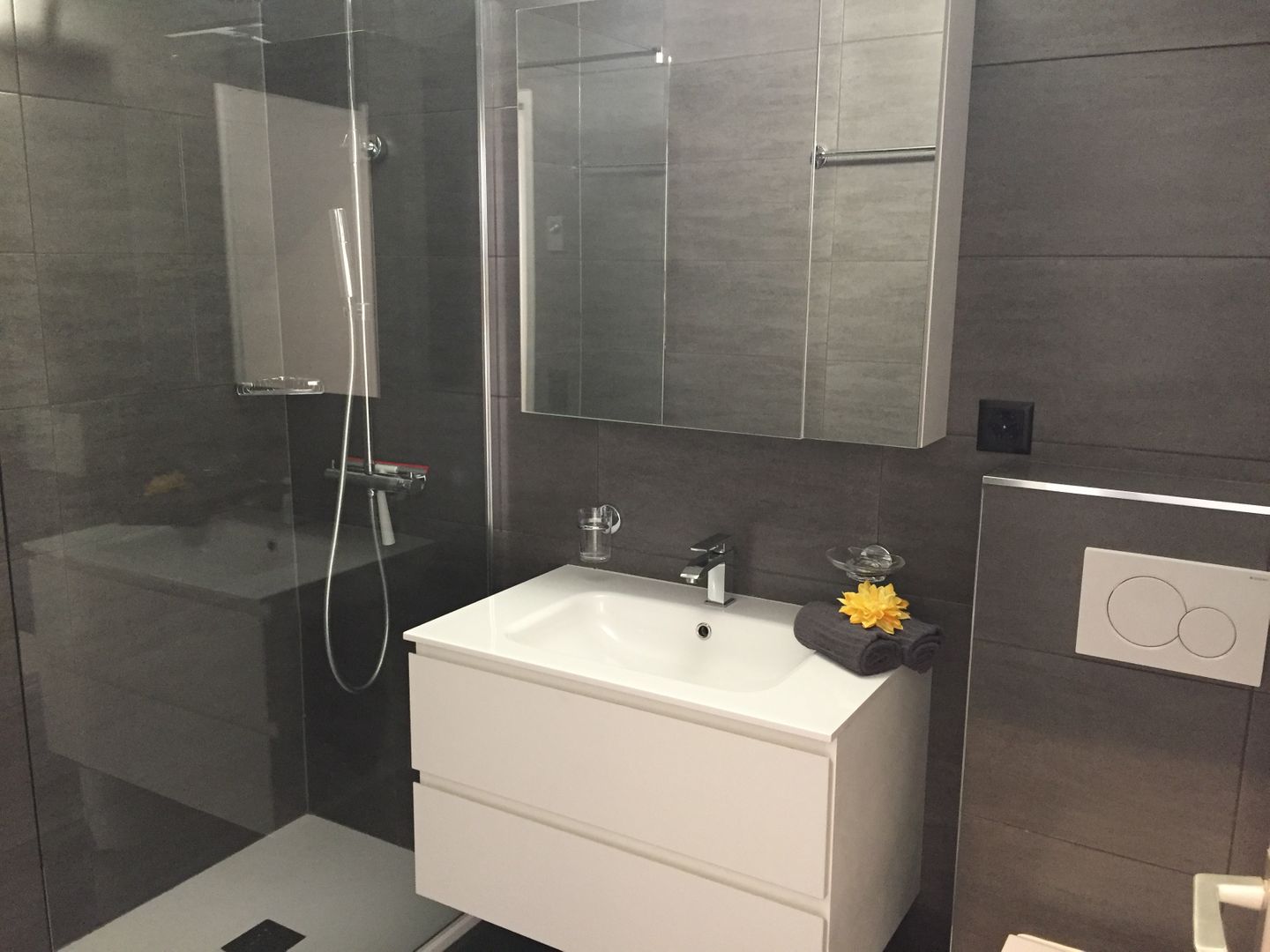 • Badezimmer mit begehbarer Dusche (Regendusche), WC, Waschtisch